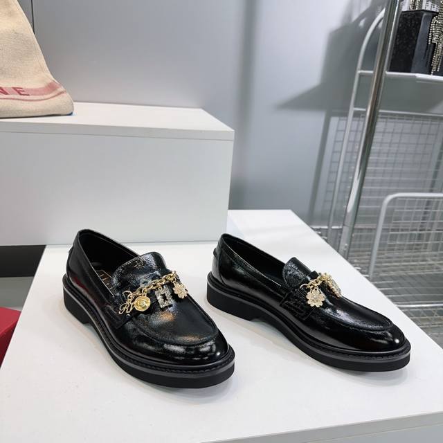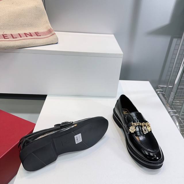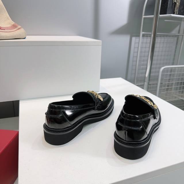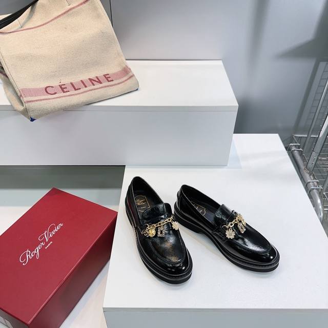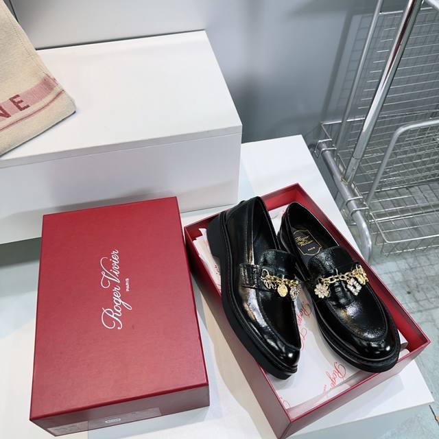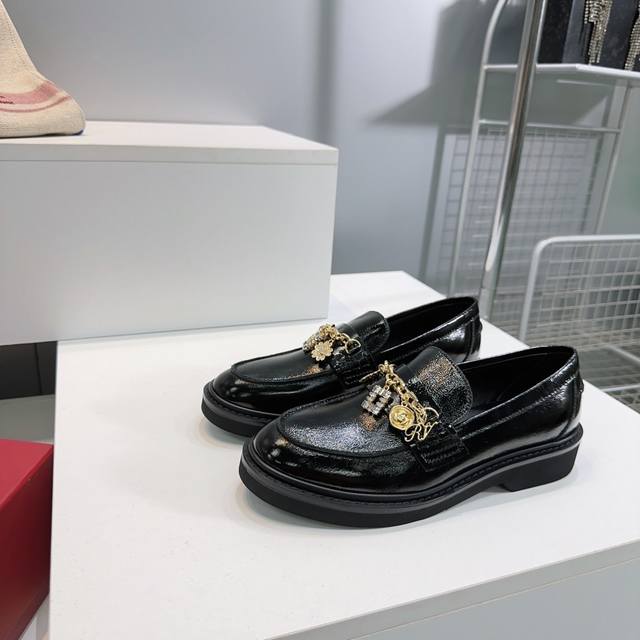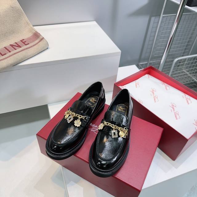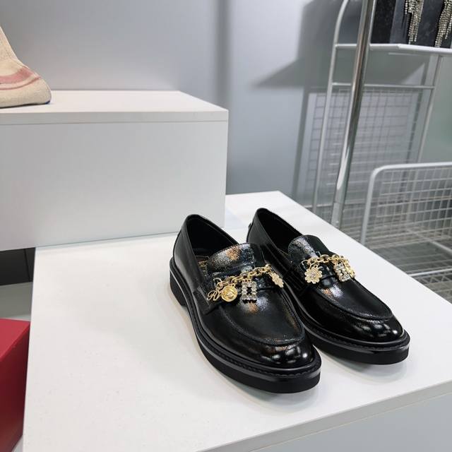 High-quality factory! Top-quality Roger Vivier Rv 2025 Autumn/Winter new flat loafers! Retro badges are incorporated into modern metal rhinestone chain elements, creating a fashionable aesthetic that blends retro and modern styles! Paired with sparkling metal buckles, every step exudes a high-end feel! The 3.5cm sole design makes your figure more graceful and upright, showcasing the innate charm of women