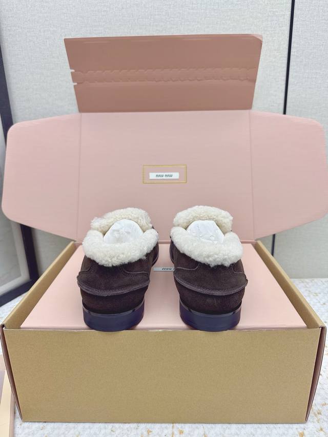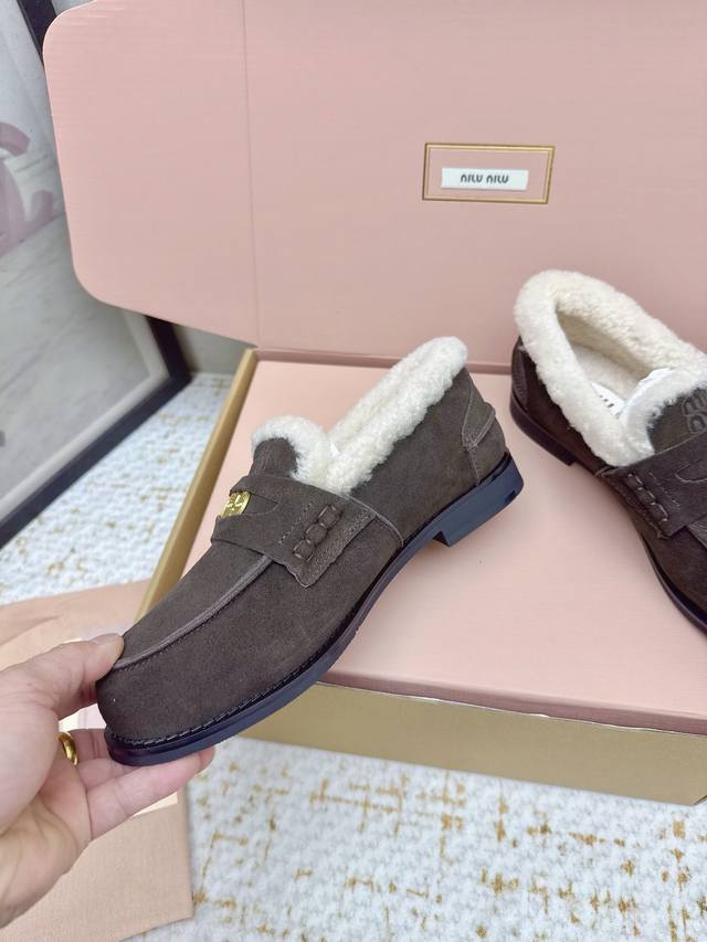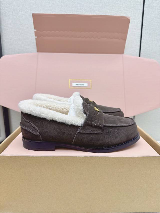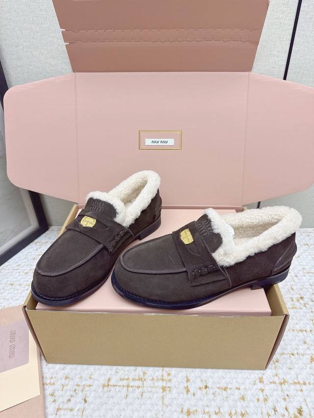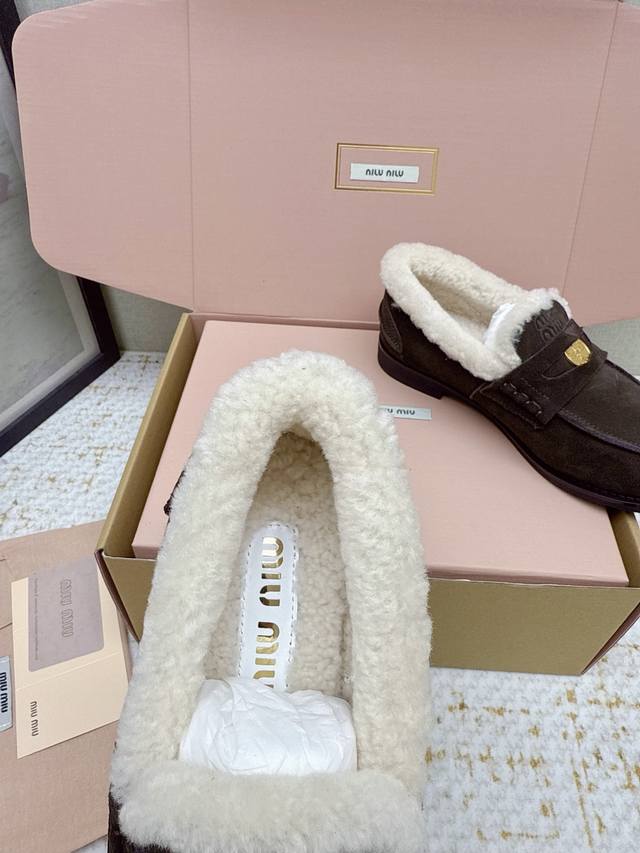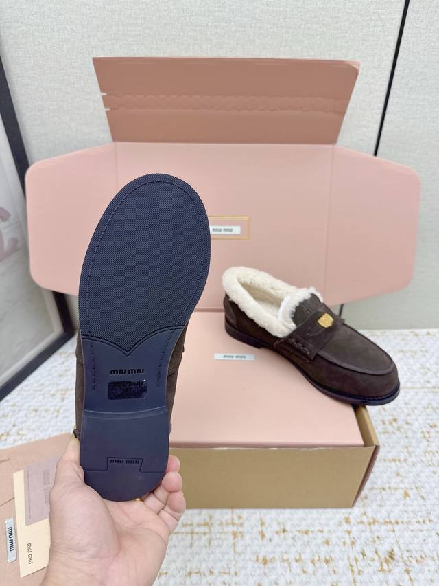High-quality factory version Miu Miu Fall/Winter latest coin loafers, furry shoes. Many celebrities and fashion bloggers have recommended these; they're so fluffy and warm! The new coin design is absolutely irresistible. Besides the coin detail, the overall shoe shape is very elegant and not bulky. The toe is slightly upturned, and they look amazing on! Upper: Split-edge deerskin, distressed cowhide. Lining: Imported European genuine wool. Outsole: Original molded anti-slip outsole. Size: 35-40. Size 40 is custom-made and non-refundable.