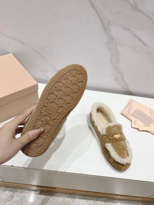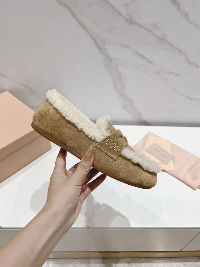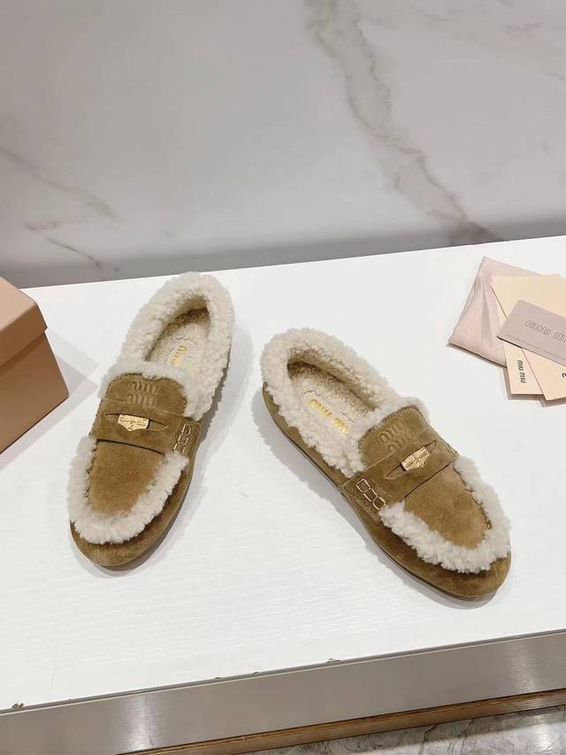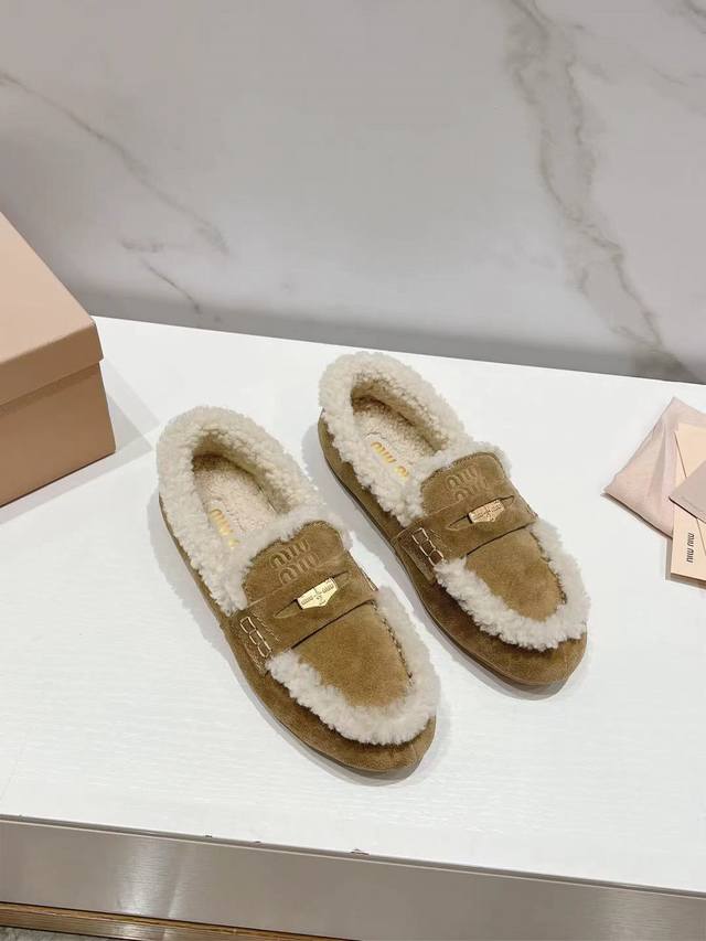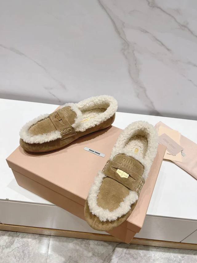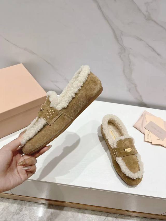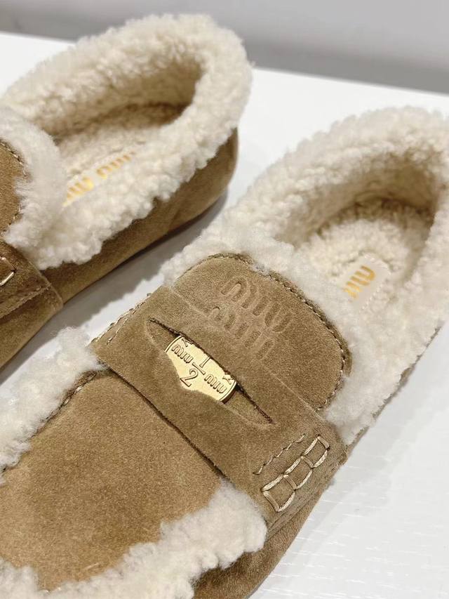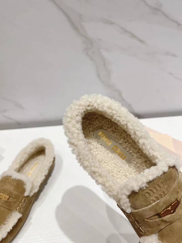 High-quality factory version DDD Miu Miu SS Fall/Winter runway coin driving shoes with fur trim Loafers DDD These timeless suede driving shoes feature coins and embossed Miu logos, showcasing a unique and classic style. The toe cap is adorned with leather trim and a logo-engraved metal coin. DDD Very comfortable and stable to wear, versatile and stylish. Zp developed hardware, custom colors DDD Upper: Custom imported cow suede DDD Lining: Imported sheepskin DDD Sole: Zp molded rubber outsole DDD Sizes: 35-40, 40 custom DDD Full packaging DDD