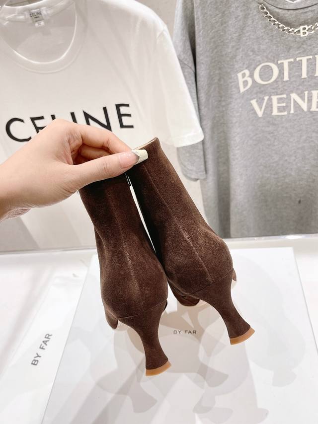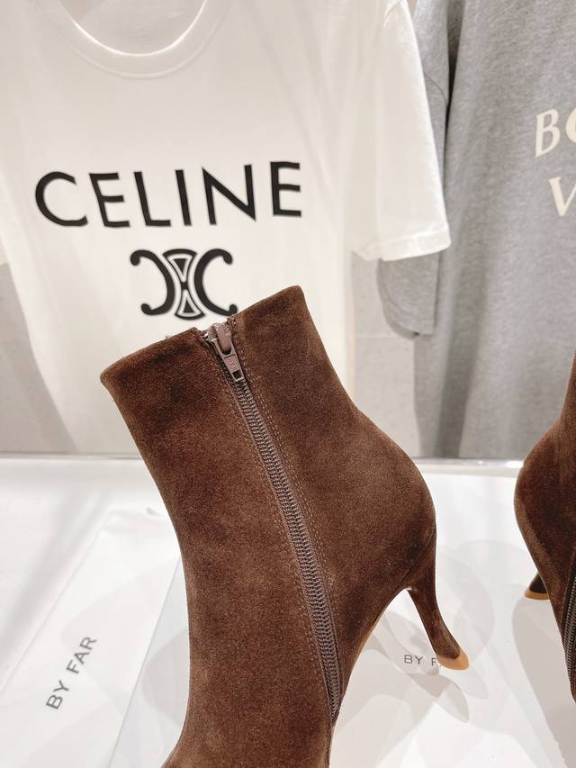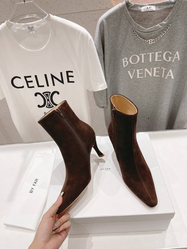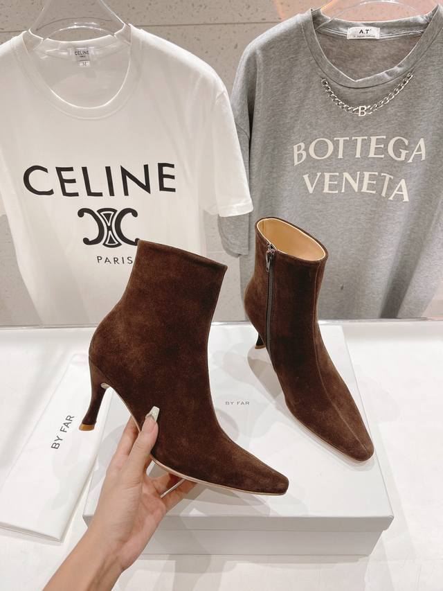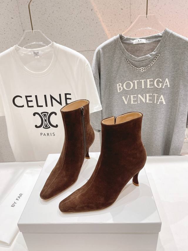 High-quality factory-made By Far 2025 Autumn/Winter new arrival, elegant full leather kitten heel boots, 1:1 authentic purchase. The square toe is more fashionable and elongates the legs. The side of the boots is designed according to the human leg shape, making them very delicate and beautiful on the foot. Material: Imported horse oil cowhide suede. Lining: Cowhide lining with insole. Heel height: 7.5cm. Outsole: Italian genuine leather outsole. Sizes: 35-39. Size 40 is custom-made and non-refundable.