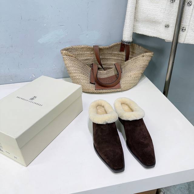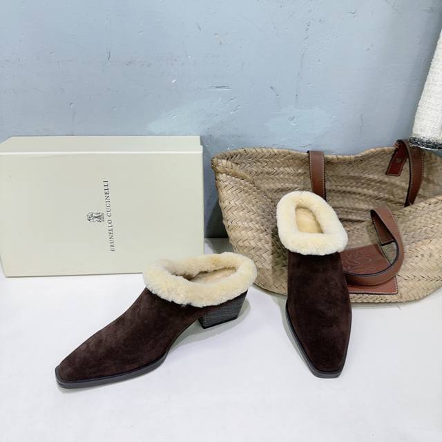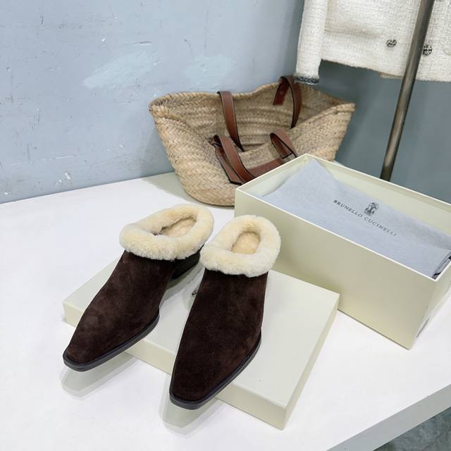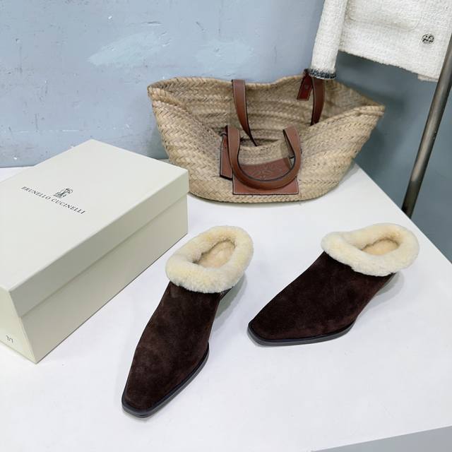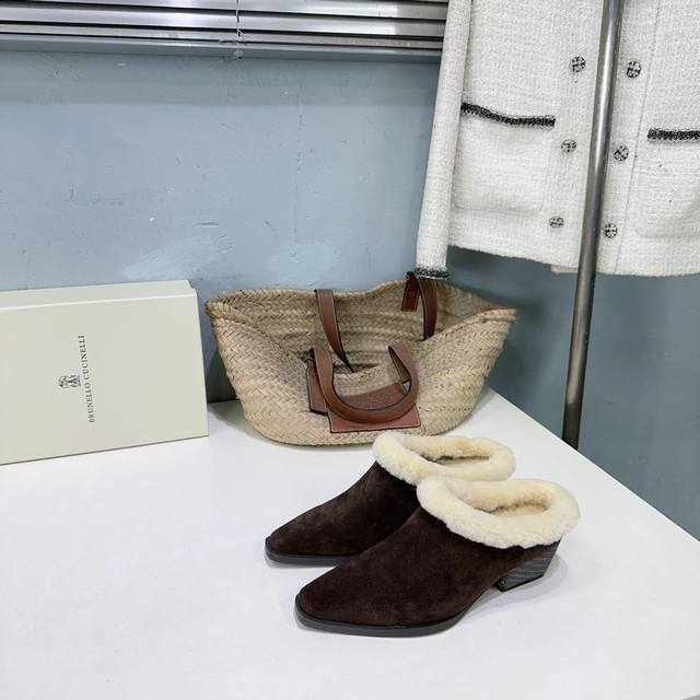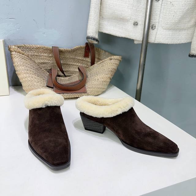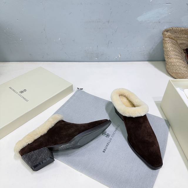 High-quality factory-made fleece lining! Niche trendy brand DDD Brunello Cucinelli 2025 Autumn/Winter new arrival Bc new fleece warm lamb wool closed toe chunky heel half mules! How can there be such lightweight and elegant fleece mules? They look good from both the front and the side! DDD The minimalist chunky heel paired with a steel bead chain design is both retro and fashionable. They're silky smooth and warm even when worn barefoot, stylish and flattering to the skin! DDD The upper is made of imported cow suede DDD The inner lining is sheepskin and lamb wool DDD Original mold outsole DDD Heel height: approx. 4.5cm DDD Sizes: 35-42 40 41 42 Orders are non-refundable DDD Comes with original packaging DDD