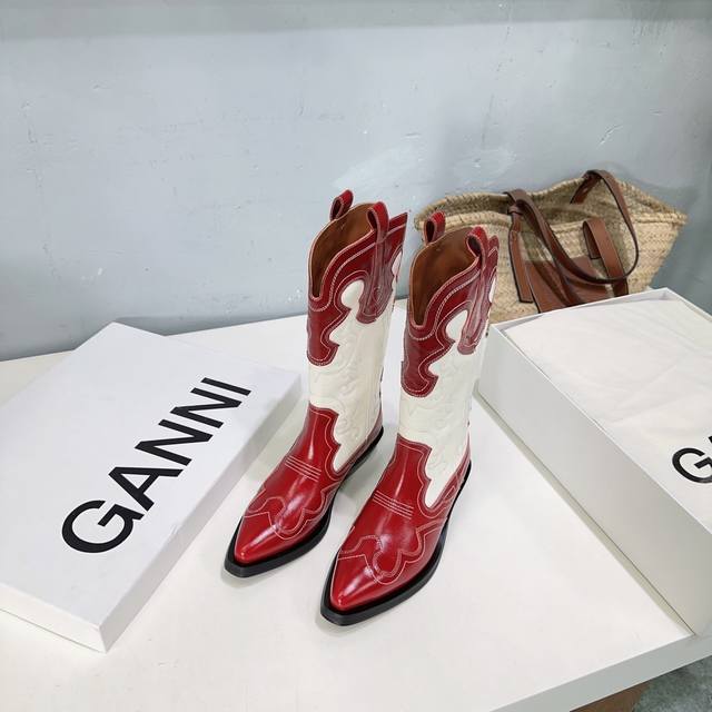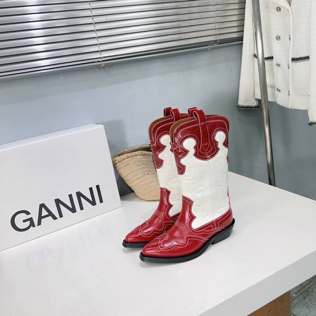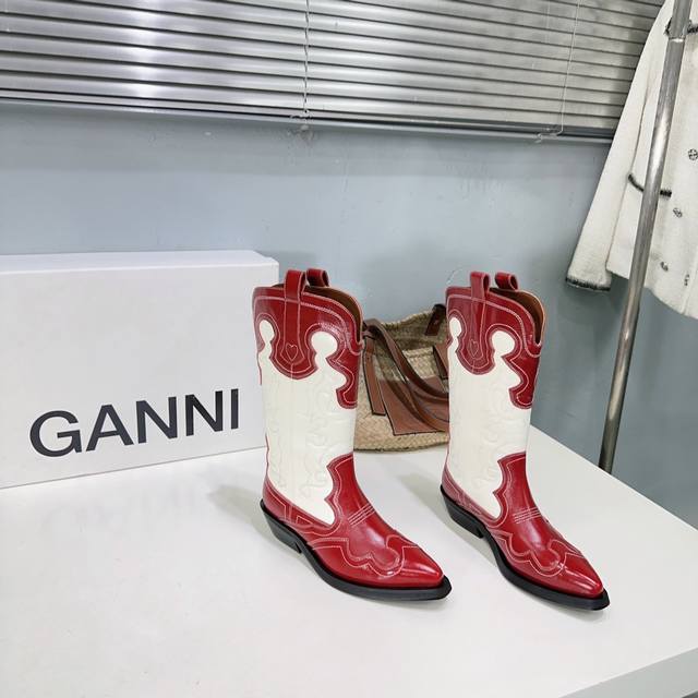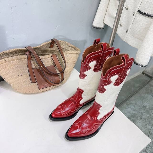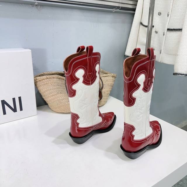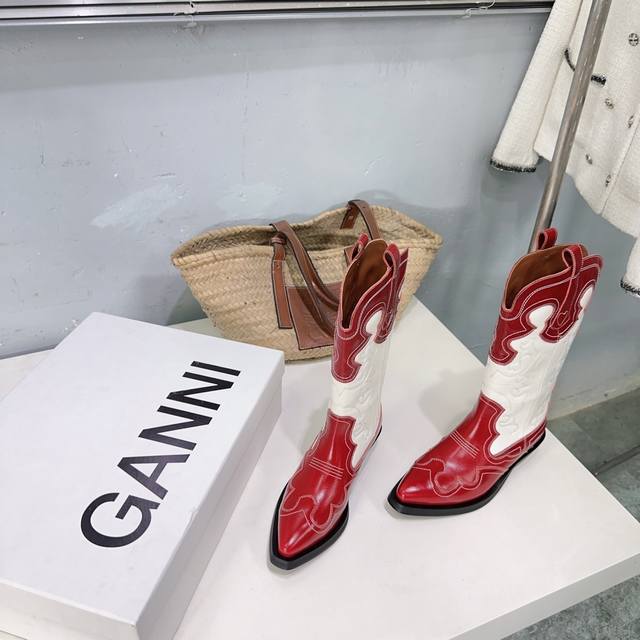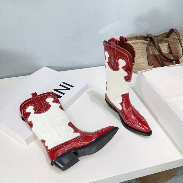 High-quality factory-made mid-length boots! Niche fashion brand Ganni25Ss Autumn and Winter Show Model Embroidered Retro Ethnic Style Cowboy Boots Western American Boots Knight Boots Short Boots