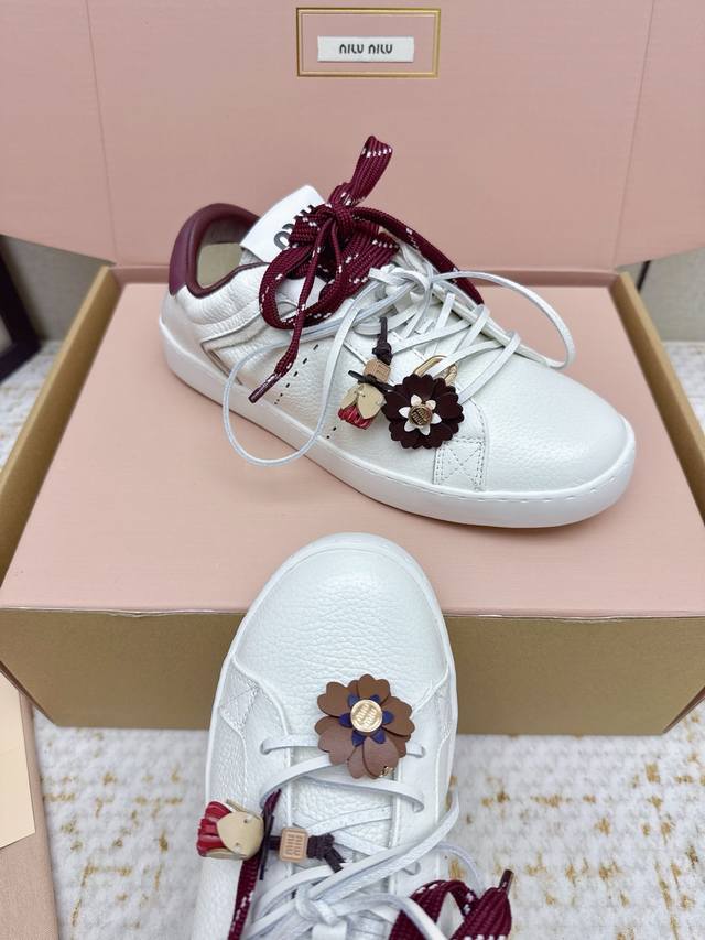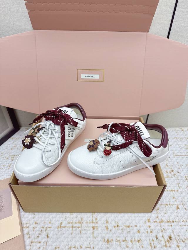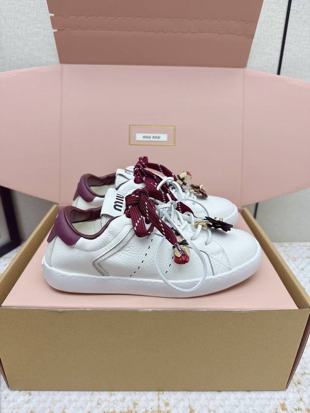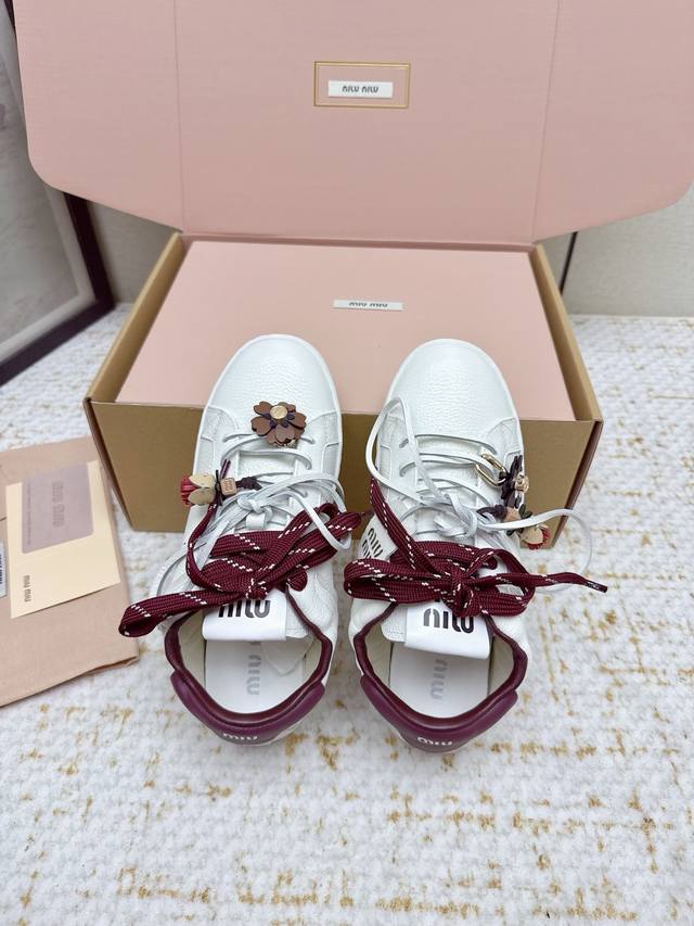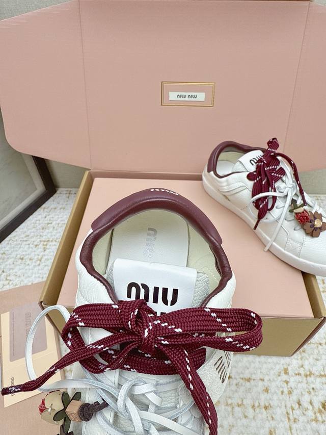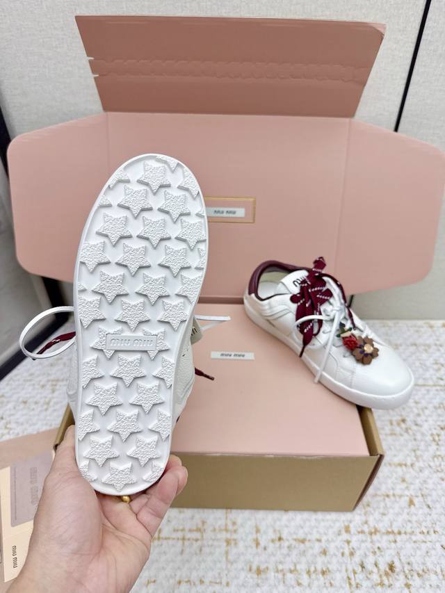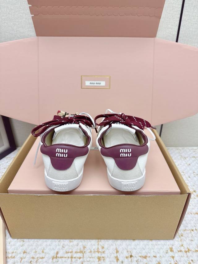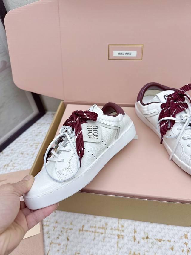 High-quality factory-made Miu Miu 26Ss thin-soled biscuit sole spring/summer new British style lace-up white sneakers. Unique color-rubbing technique from the runway. Detailed close-up of the series' details. New season's trendy elements