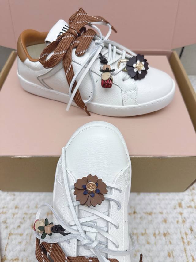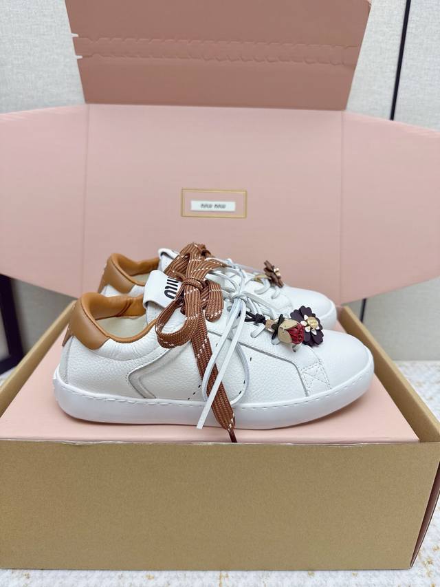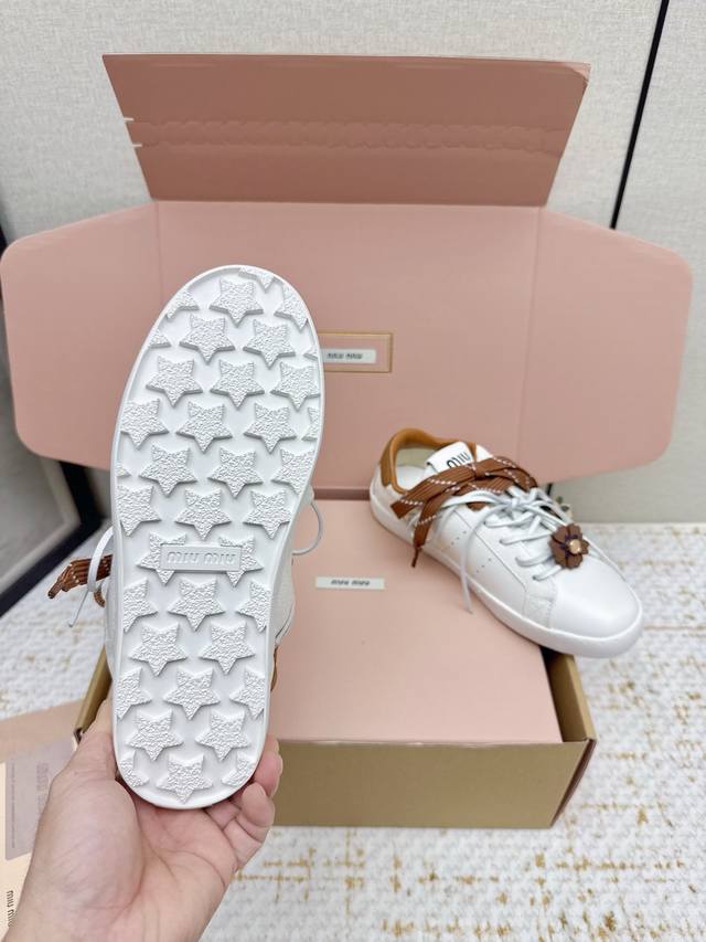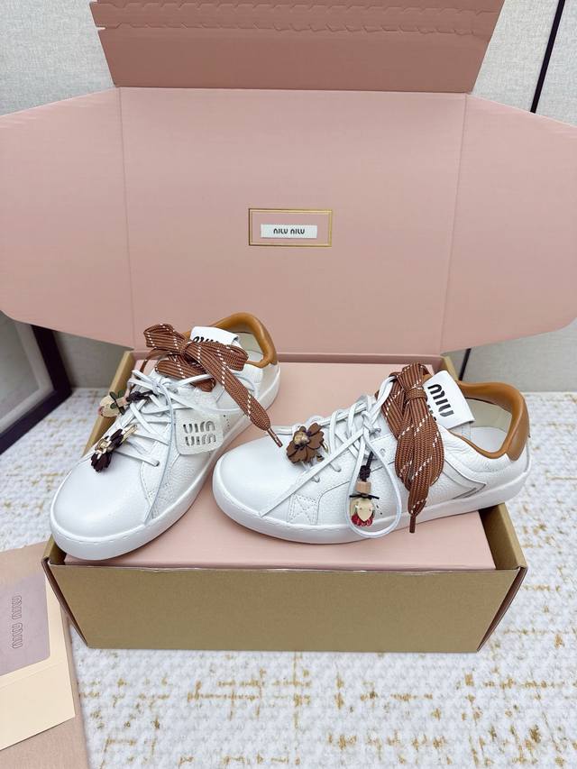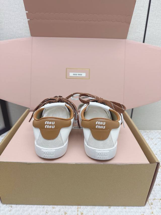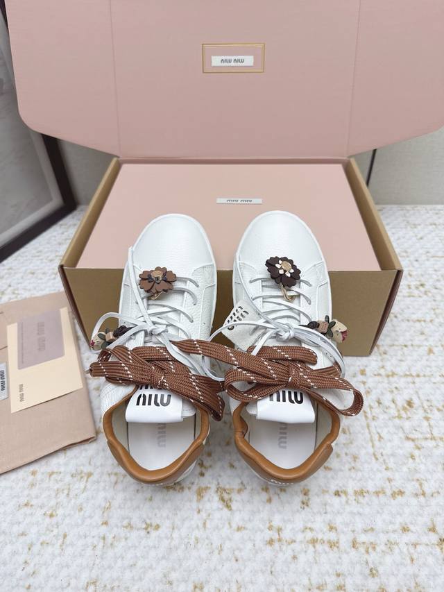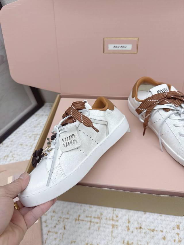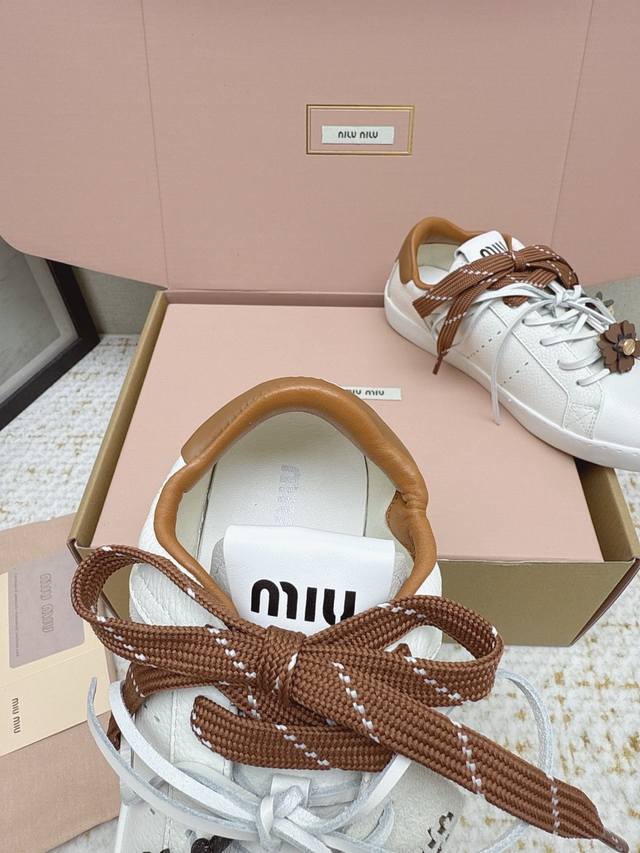 High-quality factory-made Miu Miu 26Ss thin-soled biscuit sole spring/summer new British style lace-up white sneakers. Unique color-rubbing technique from the runway. Detailed close-up of the series' details. New season's trendy elements