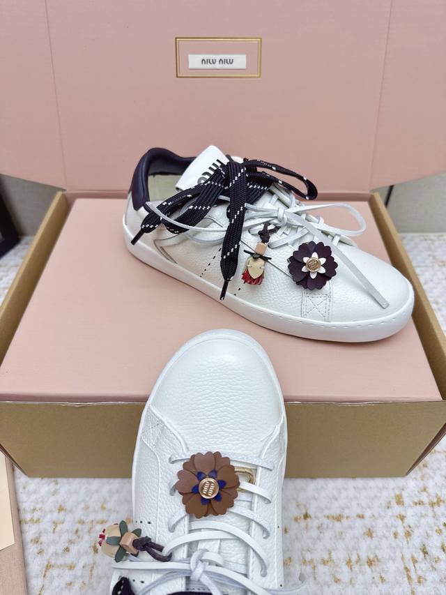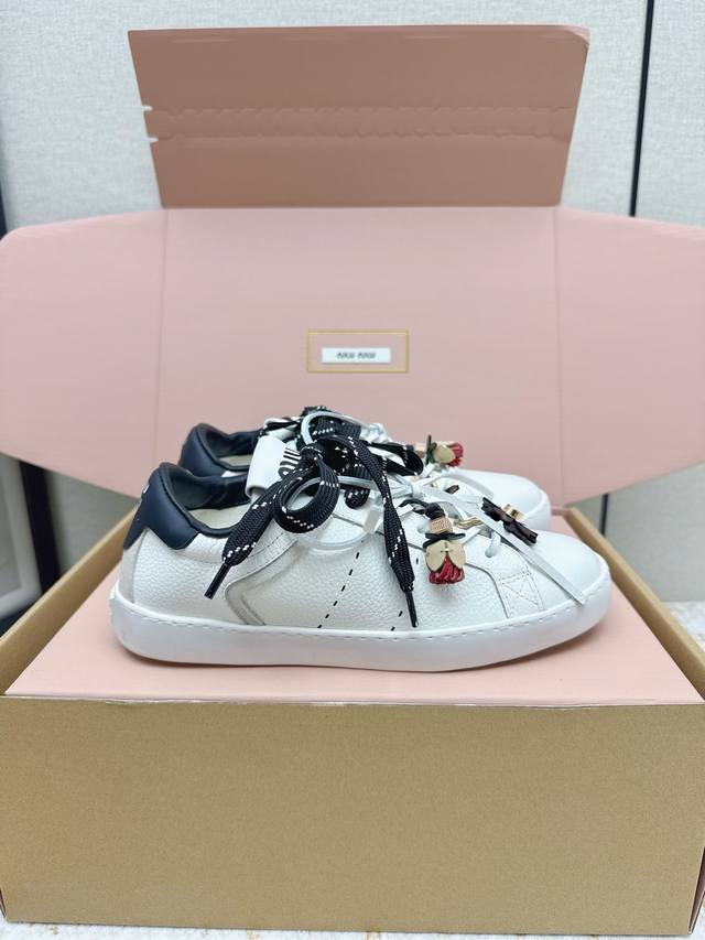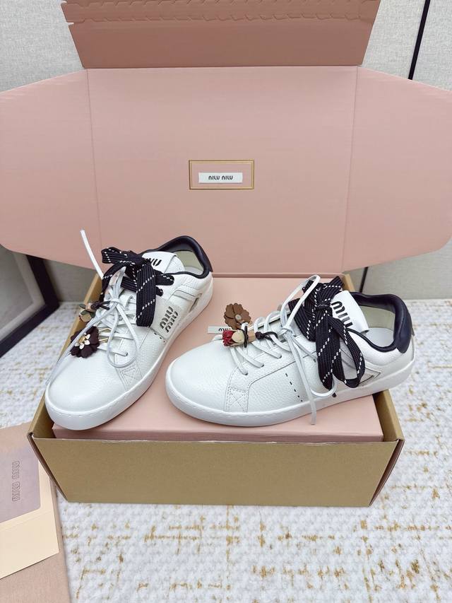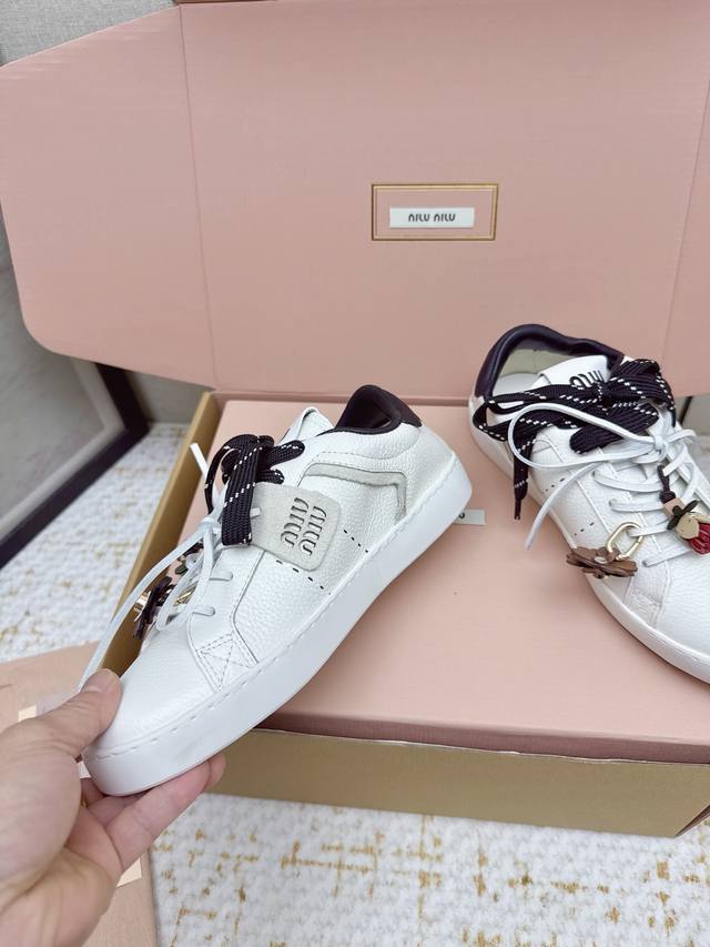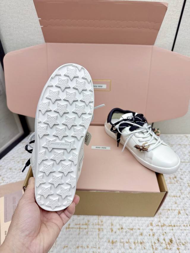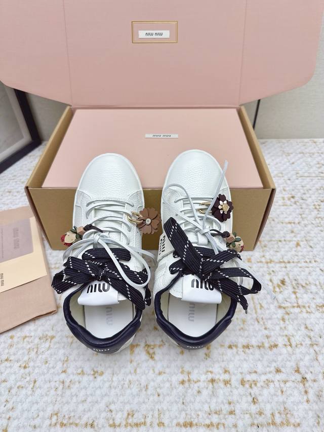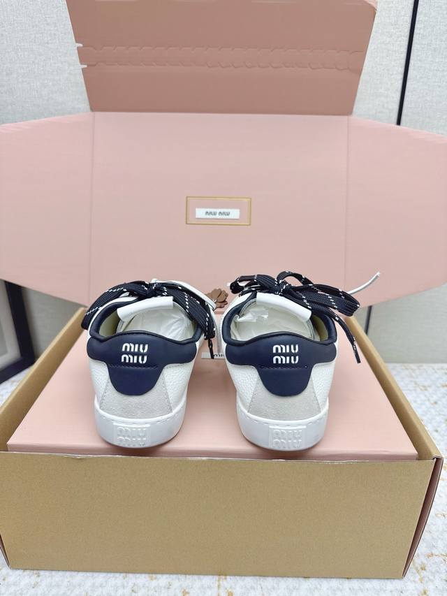 High-quality factory-made Miu Miu 26Ss thin-soled biscuit sole spring/summer new British style lace-up white sneakers. Unique color-rubbing technique from the runway. Detailed close-up of the series' details. New season's trendy elements