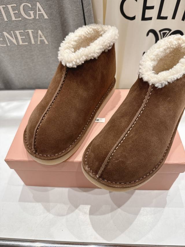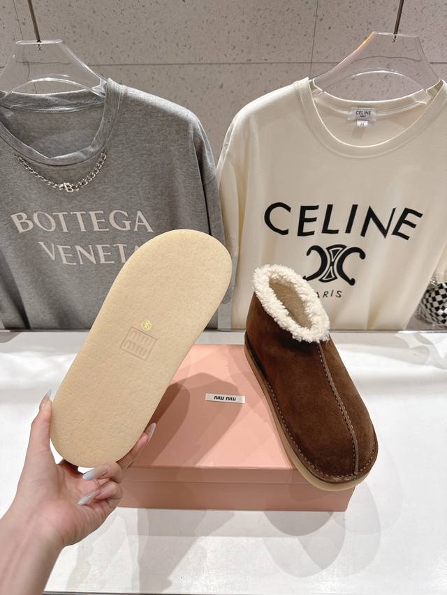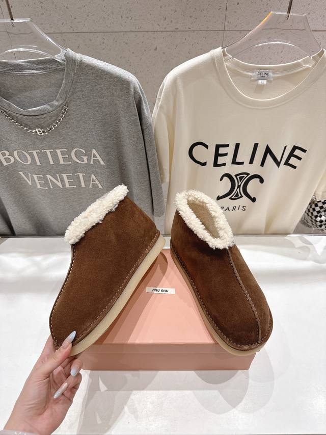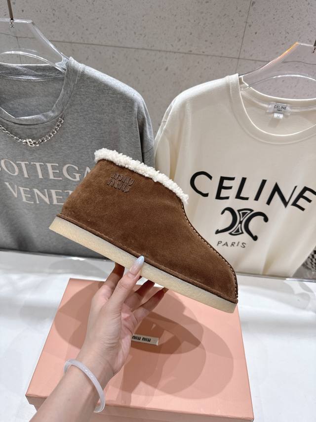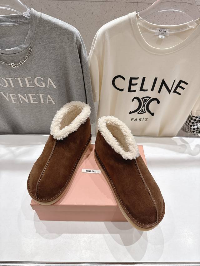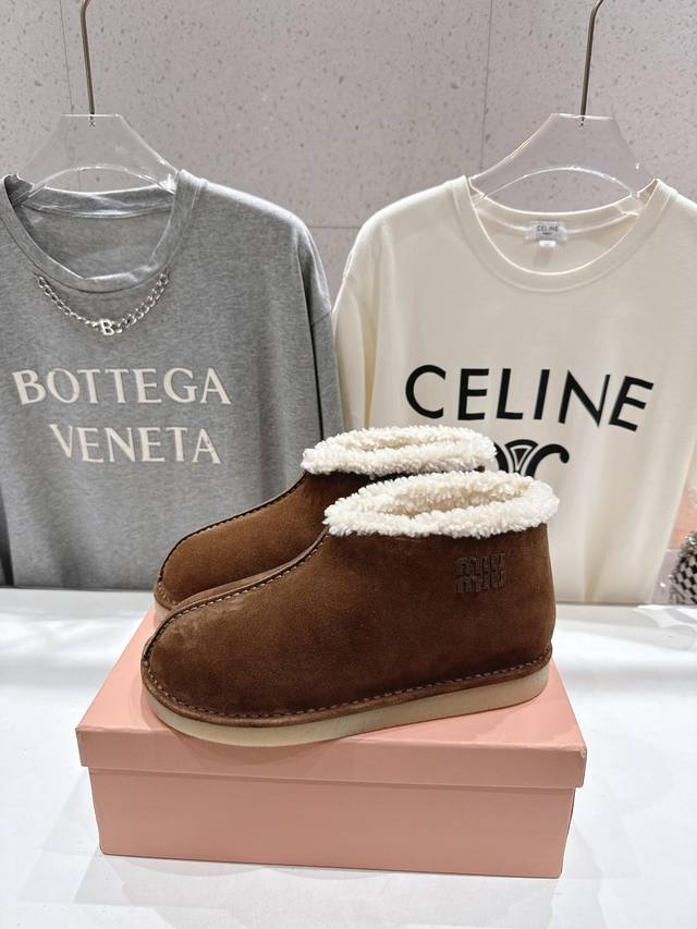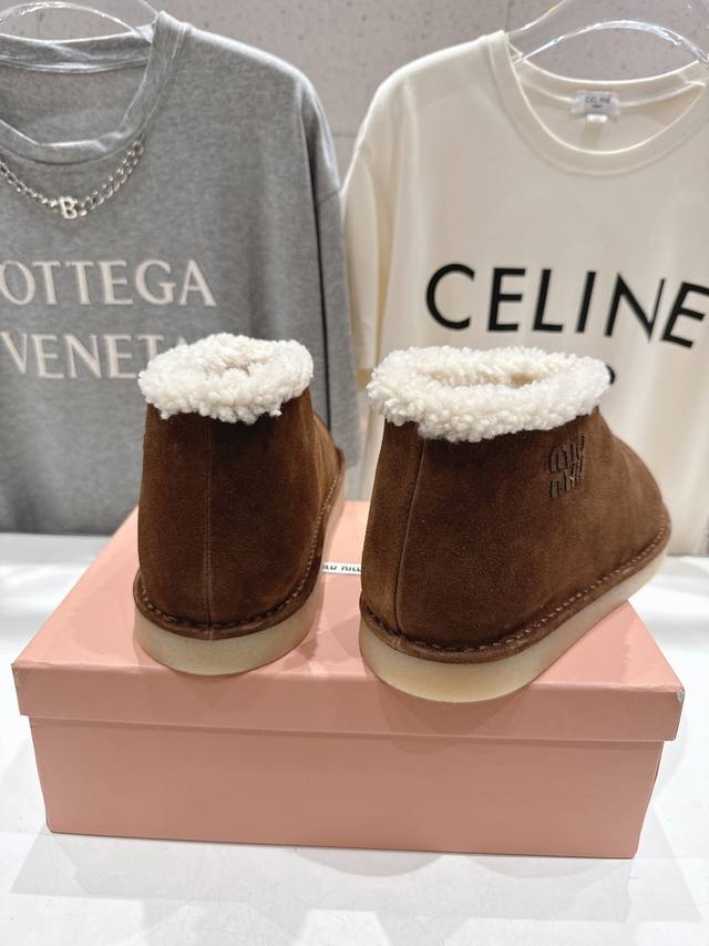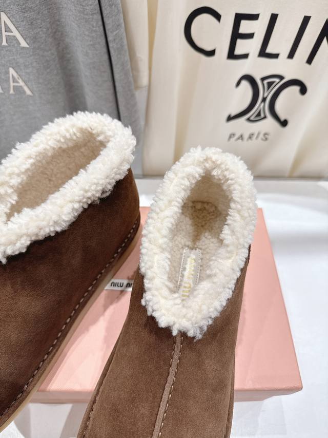 High-quality factory-made Miu Miu F033 2025 Autumn/Winter runway wool ankle boots, snow boots, furry shoes. Frequently featured on the covers of major fashion magazines, loved by celebrities and Xiaohongshu bloggers. They look amazing on, a must-have you won't regret. Extremely comfortable and stable, versatile with various styles. Developed hardware, custom colors. Upper: Imported high-gloss cow suede. Lining: Australian imported sheep wool. Sole: Developed rubber outsole. Sizes: 35-40, 40-41 (customized). Full packaging included.