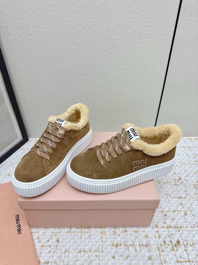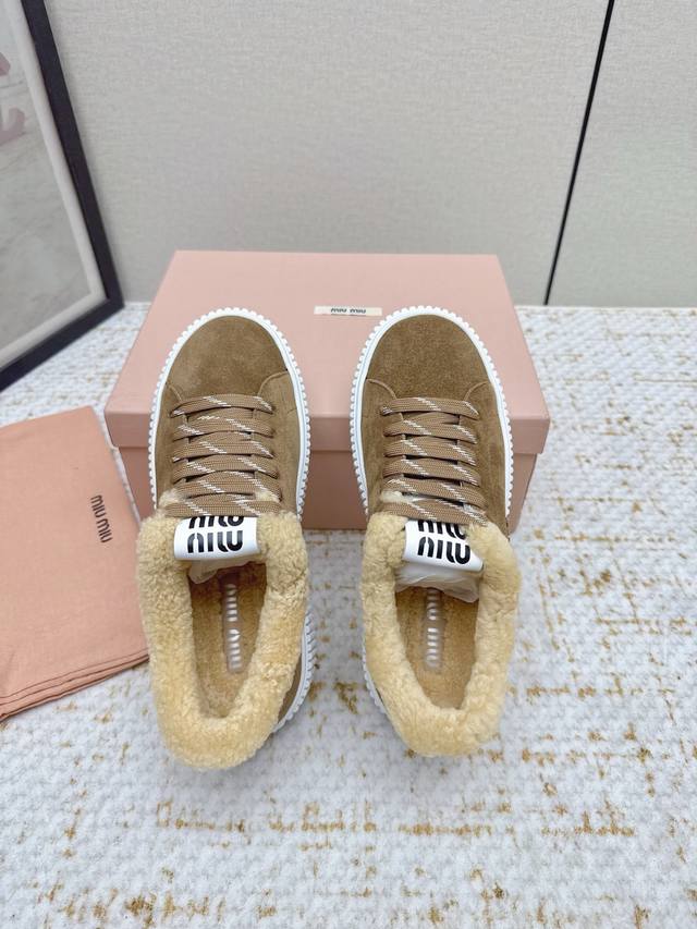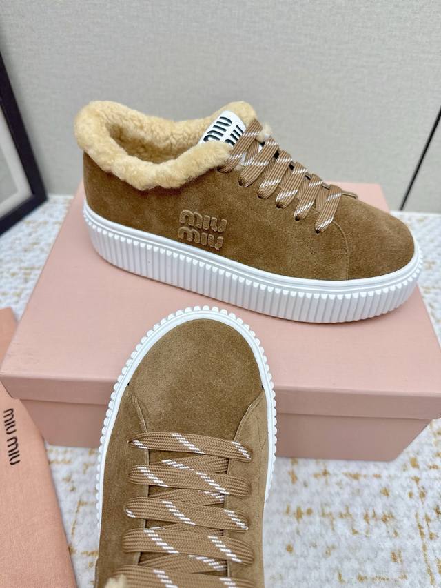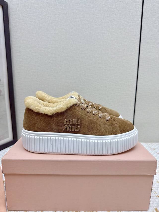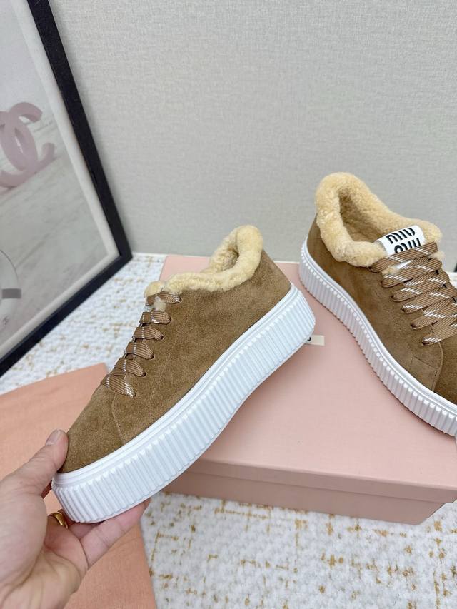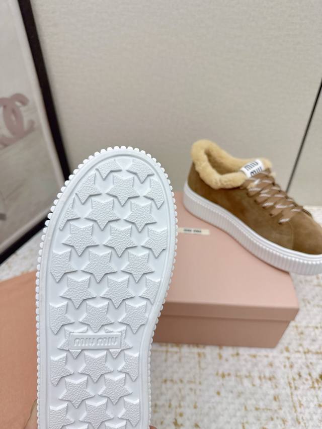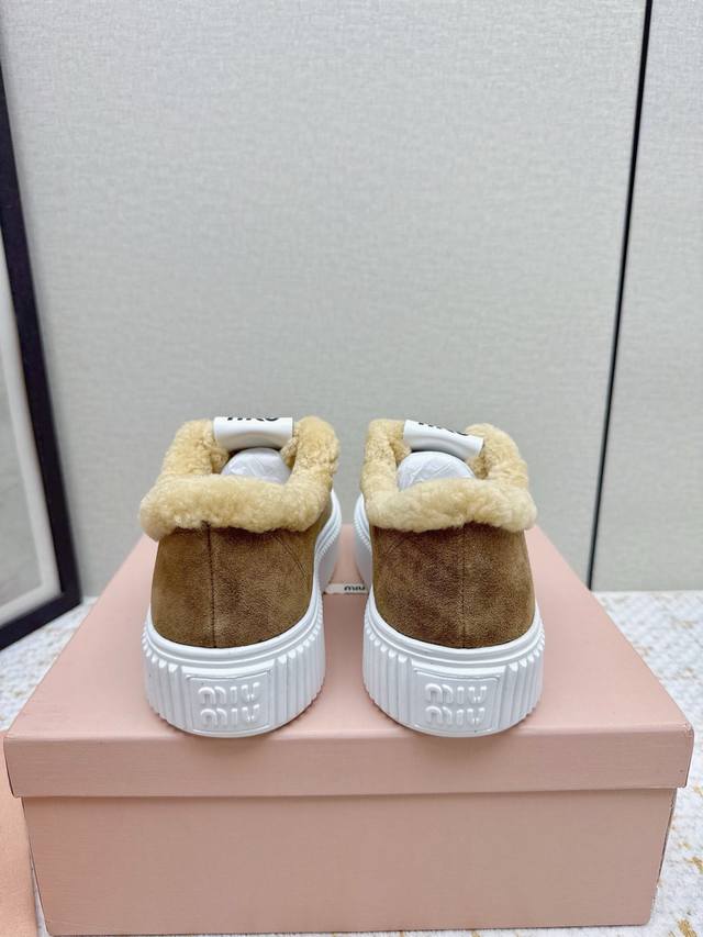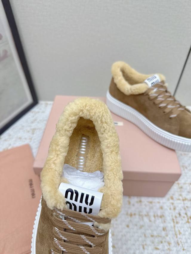 High-quality factory-made Miumiu 2025 Autumn/Winter new wool platform biscuit shoes. A classic winter upgrade with added wool for a 4cm height increase, these shoes combine the elegance and lightness of biscuit shoes with the cuteness and warmth of a woolen texture