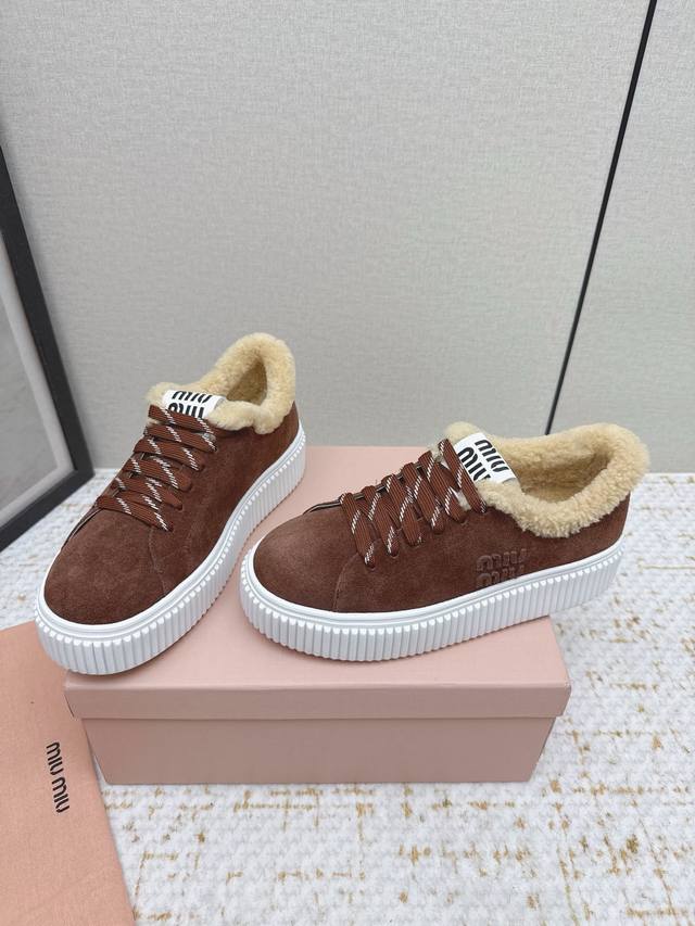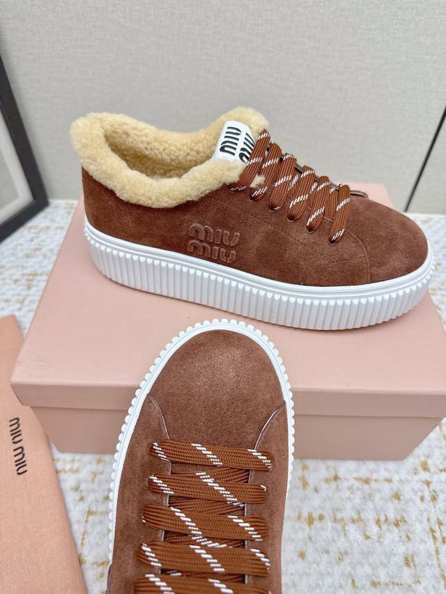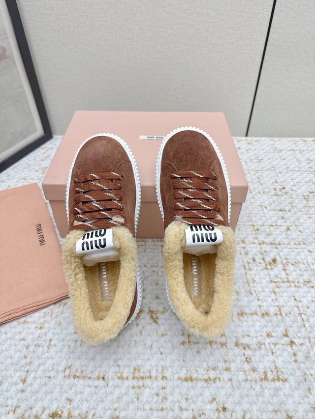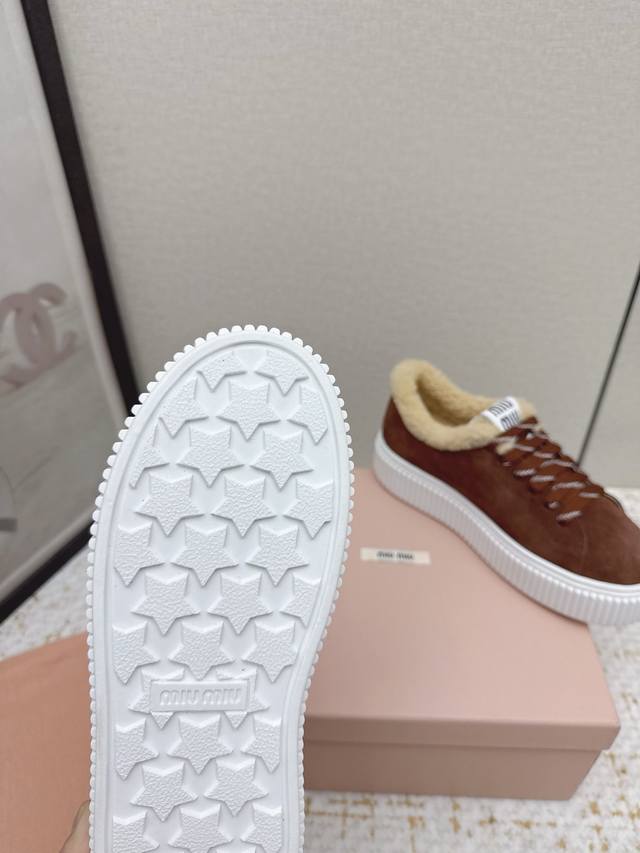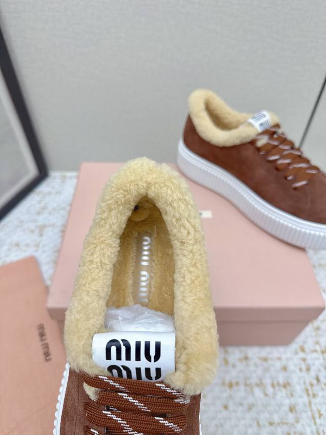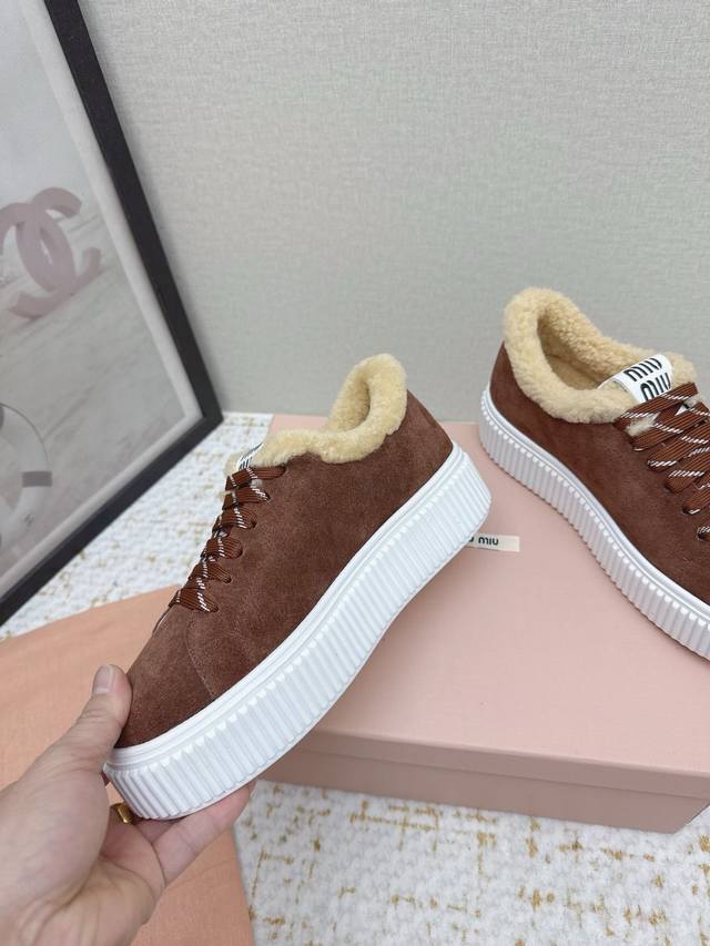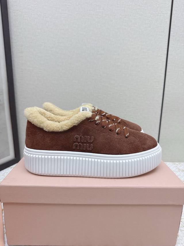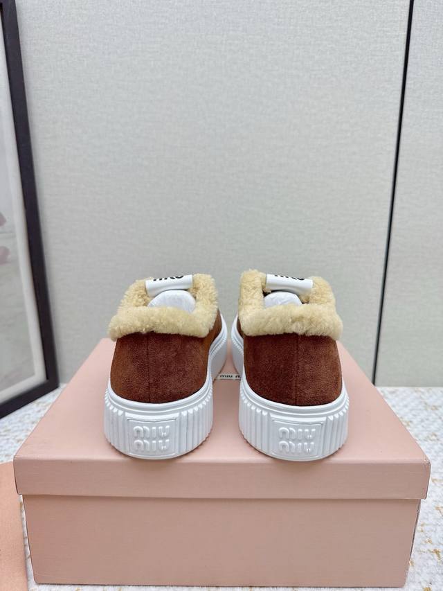 High-quality factory-made Miumiu 2025 Autumn/Winter new wool platform biscuit shoes. A classic winter upgrade with added wool for a 4cm height increase, these shoes combine the elegance and lightness of biscuit shoes with the cuteness and warmth of a woolen texture