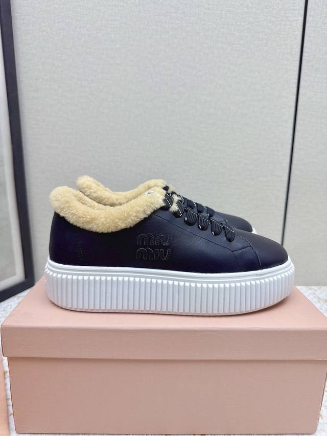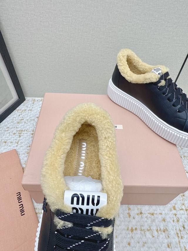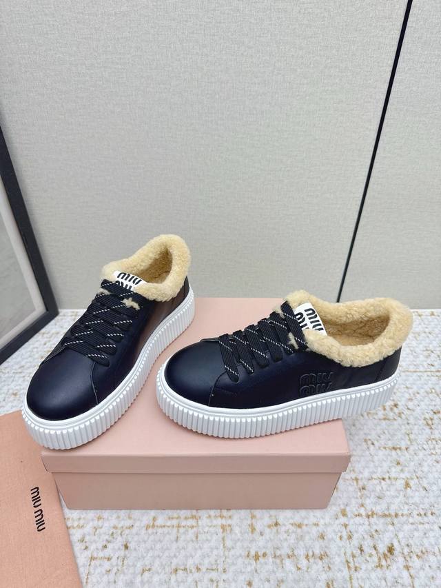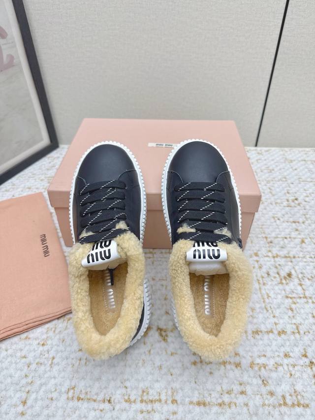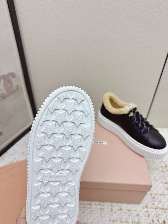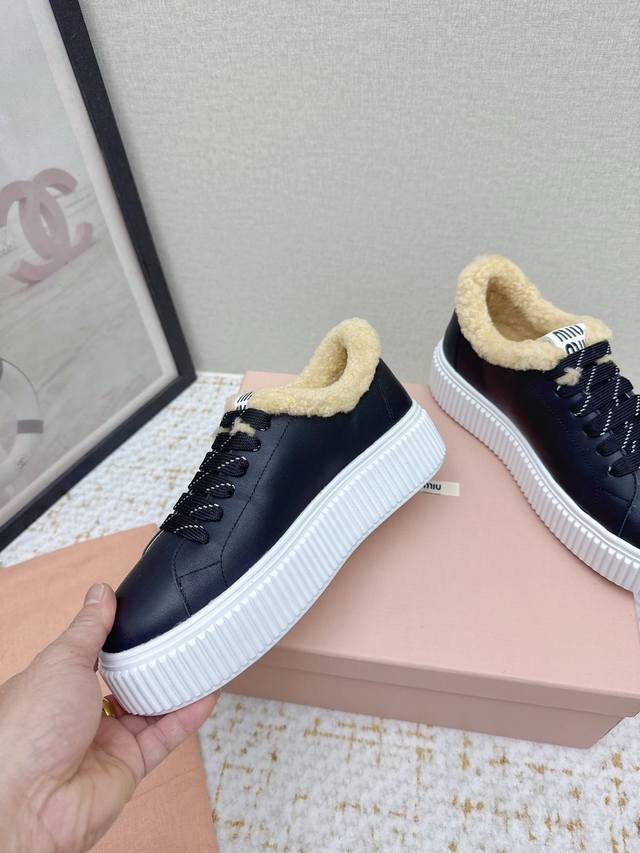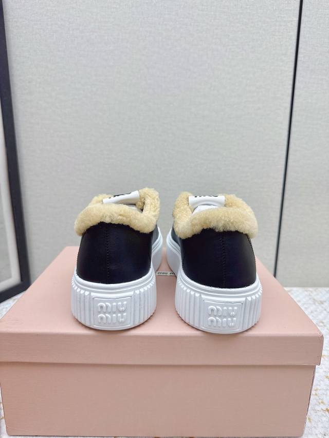 High-quality factory-made Miumiu 2025 Autumn/Winter new wool platform biscuit shoes. A classic winter upgrade with added wool for a 4cm height increase, these shoes combine the elegance and lightness of biscuit shoes with the cuteness and warmth of a woolen texture