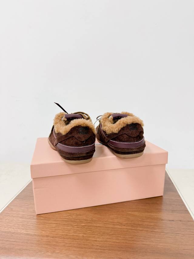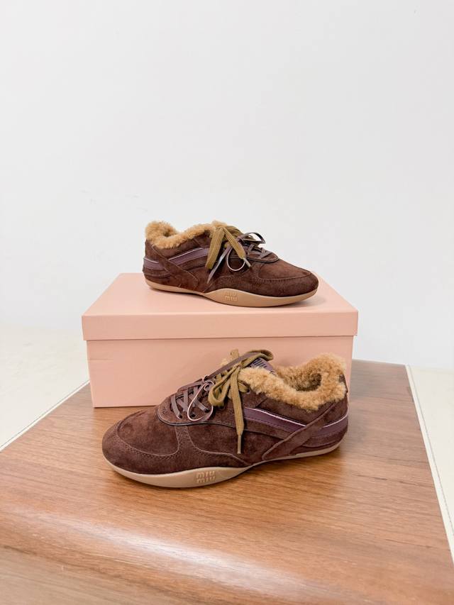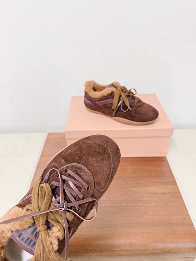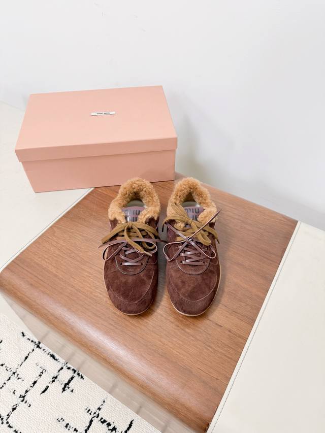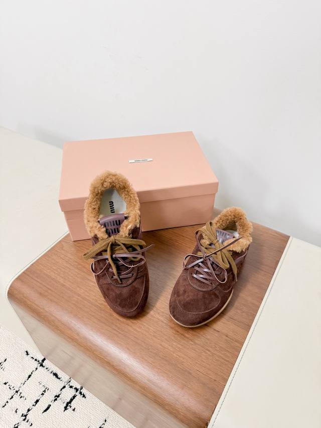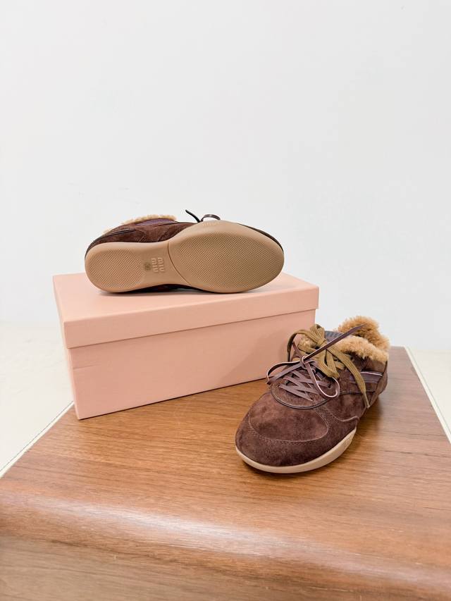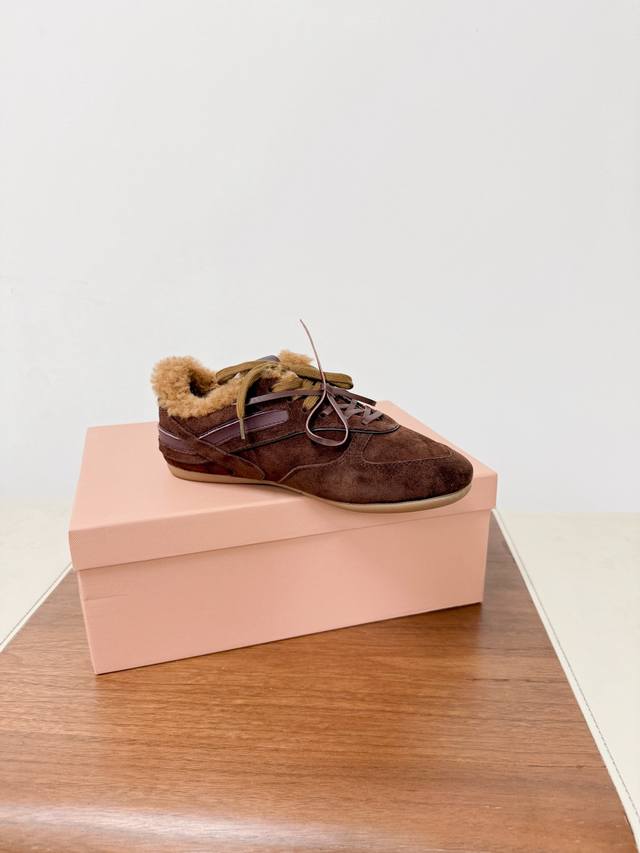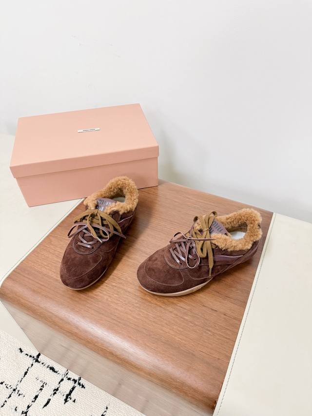 High-quality factory-made suede-lined Miumi* F022 2025 Autumn/Winter runway new lace-up German training shoes, casual sports shoes. These lace-up casual sports shoes are a must-have for everyday wear! Super stylish, comfortable, classic, and versatile! Material: Imported custom suede; Lining: Imported wool; Outsole: Original molded rubber outsole. Sizes 35-40, 41 (custom sizes, no returns or exchanges). Extremely cost-effective factory-made, price is firm.