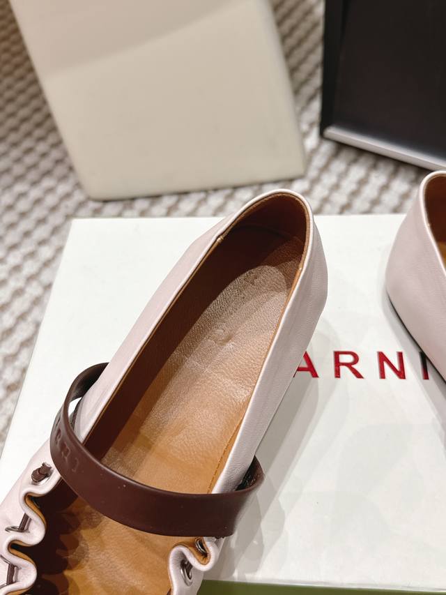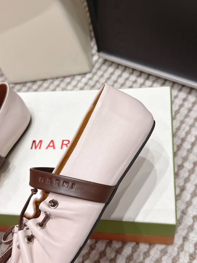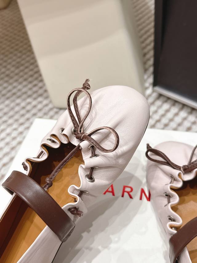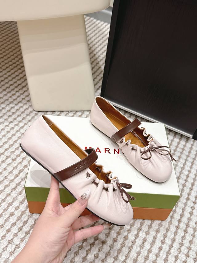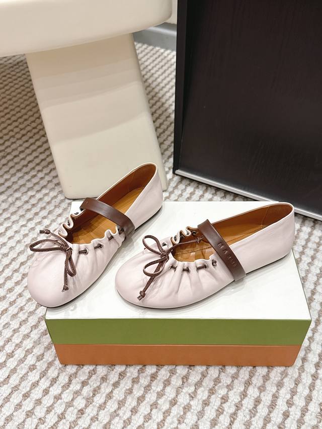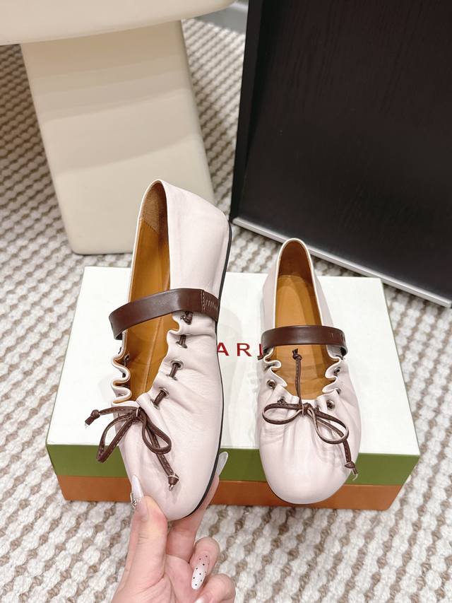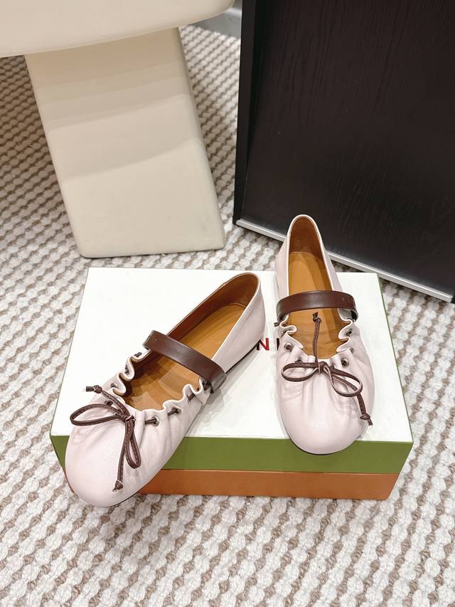 High-quality Ddd Marni 2026 Spring/Summer new bow-adorned ballet flats DDD. Made with calfskin upper and sheepskin lining, soft and comfortable for extended wear. The round toe with a pleated design and brown bow is sweet yet minimalist, while the lace-up detail at the collar adds a unique touch. DDD Available in various color-block styles, easily paired with skirts or jeans for everyday wear or casual occasions, offering an elegant and effortless look. The lightweight sole makes them perfect for spring and summer, a must-have for balletcore style DDD. Sizes: 35-39. Size 40 is custom-made and non-refundable DDD.