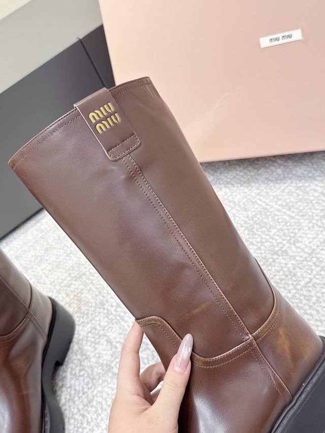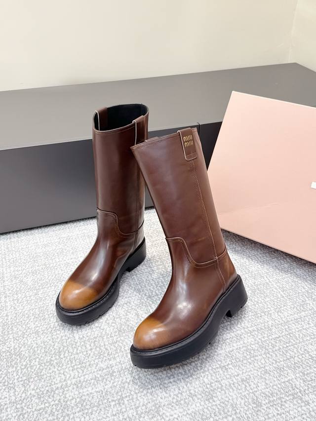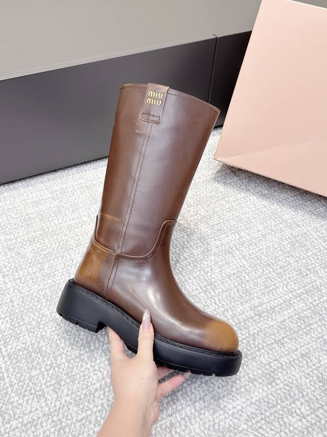 High-quality Miu Miu 2025 Autumn/Winter New High-top Riding Boots, 12-inch Miu Miu platform round-toe boots, always stylish, perfect for autumn/winter fashionistas. Looks a little uncomfortable, but is super comfortable on the feet. Super high-quality craftsmanship, each pair is unique. Incorrect size, special color-rubbing effect, specific color-rubbing cowhide material. Outer material: Original cowhide. Lining: Original lining. Sole: Mold-made sole. Sizes: 35-41. Order 40.41.
