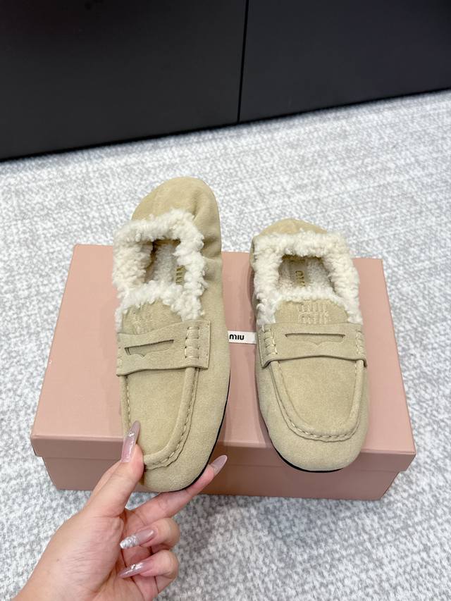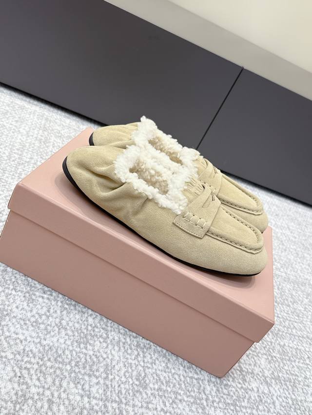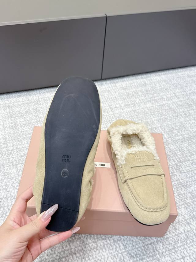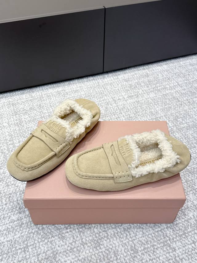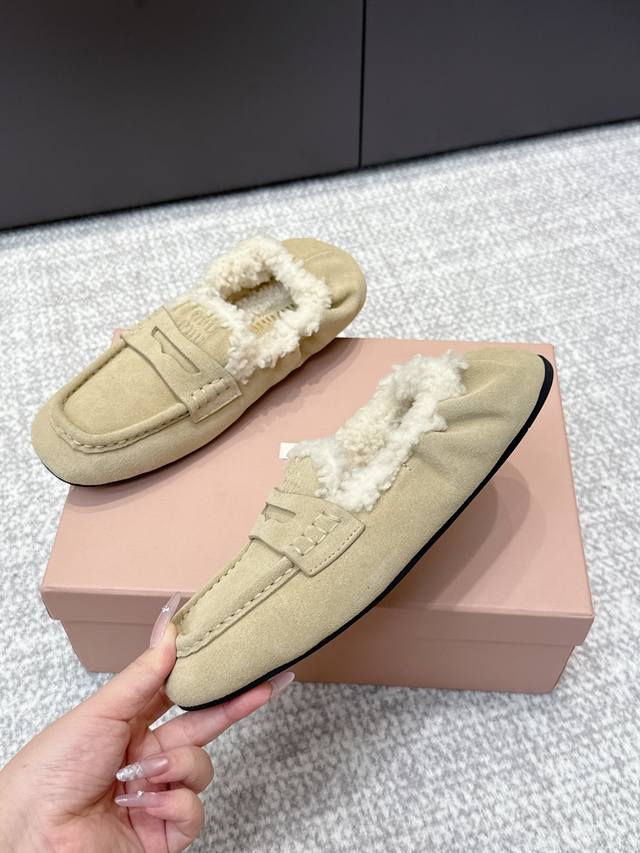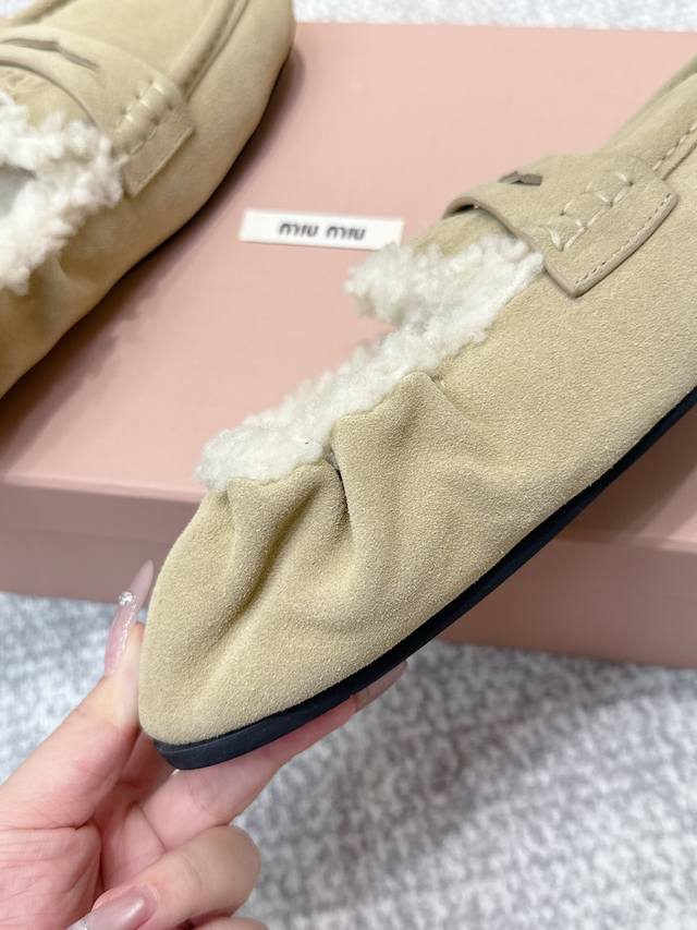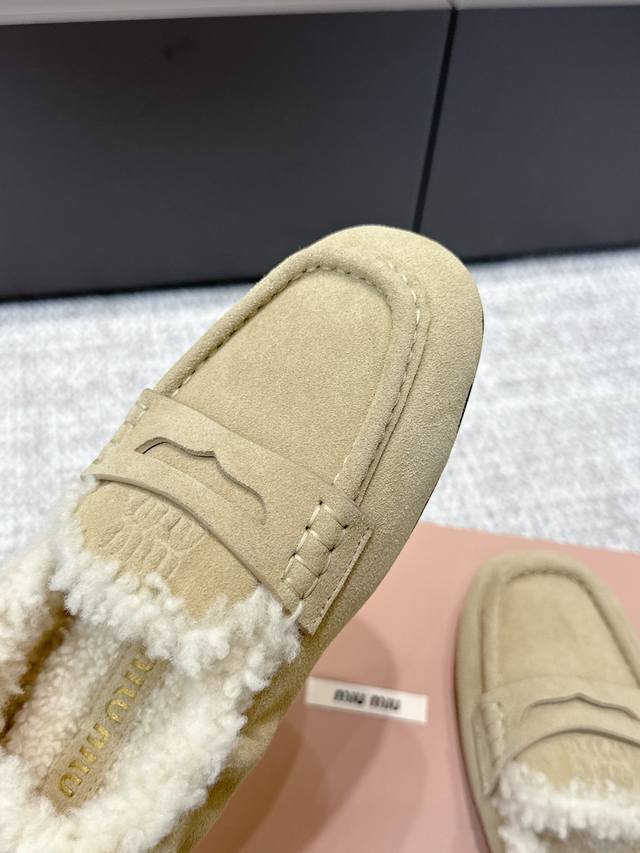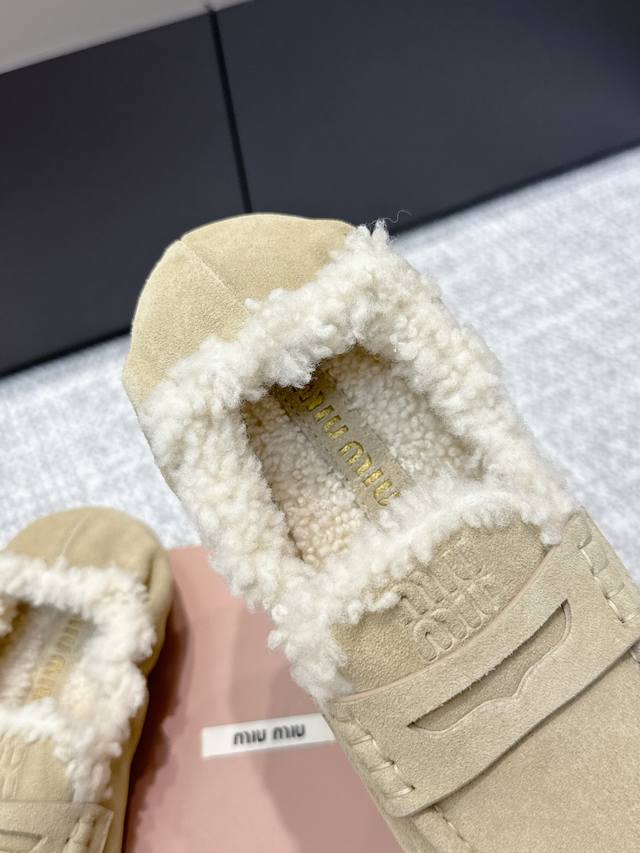 High-quality Miu Miu 25Ss Fall/Winter Wool Loafers (Retail Purchase Item) These loafers offer a new interpretation of ultra-lightweight design through their lambswool lining details. Leather straps and gold logo accents balance elegance and versatility. Very versatile and comfortable. Upper: Calfskin Lining: Lambswool Outsole: Rubber non-slip sole Size: 35-40 Size 40 is custom-made and non-refundable.