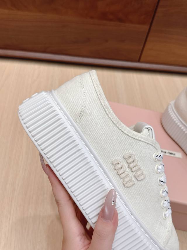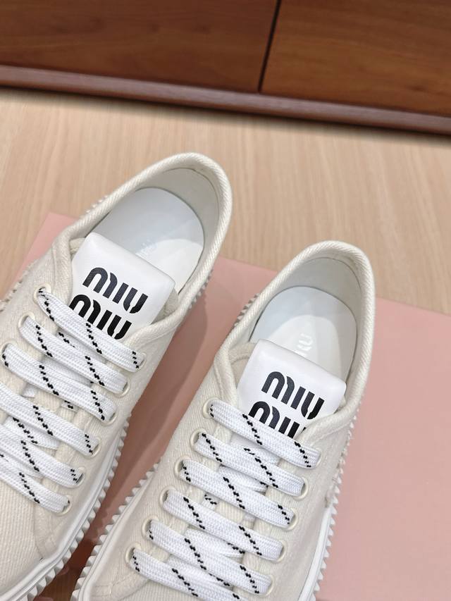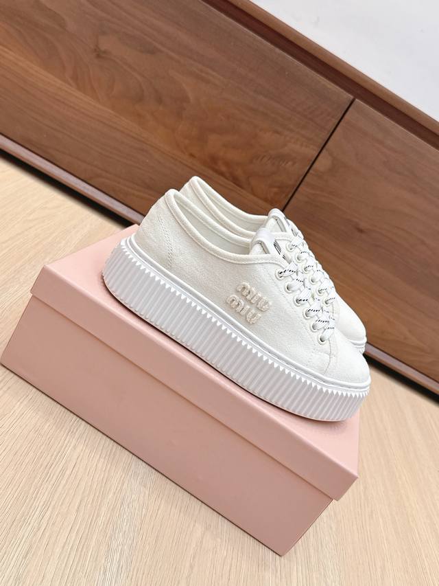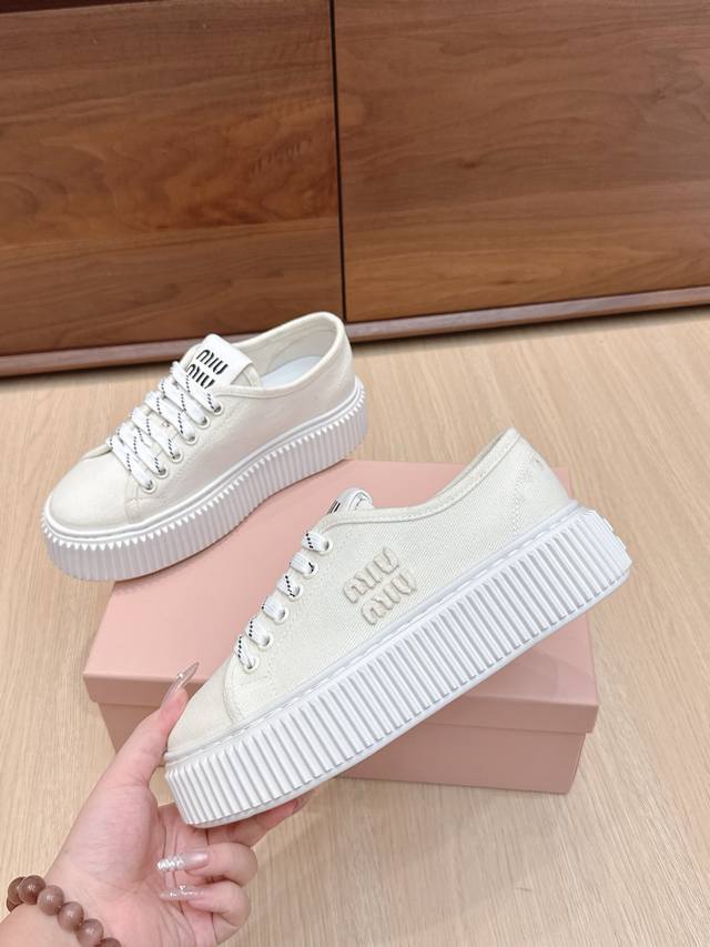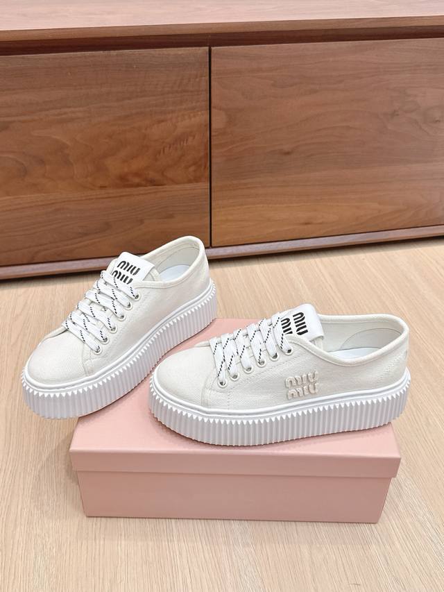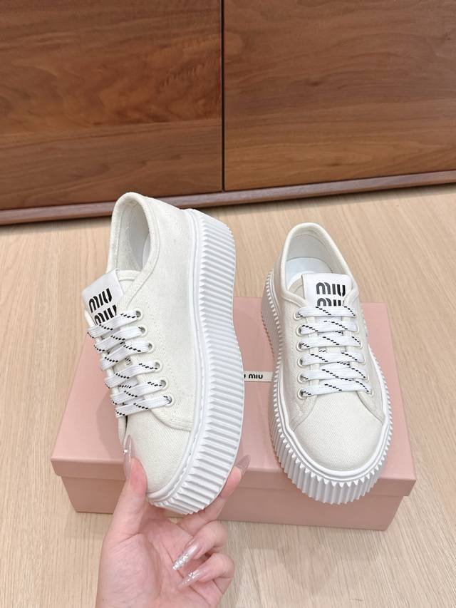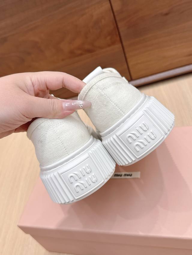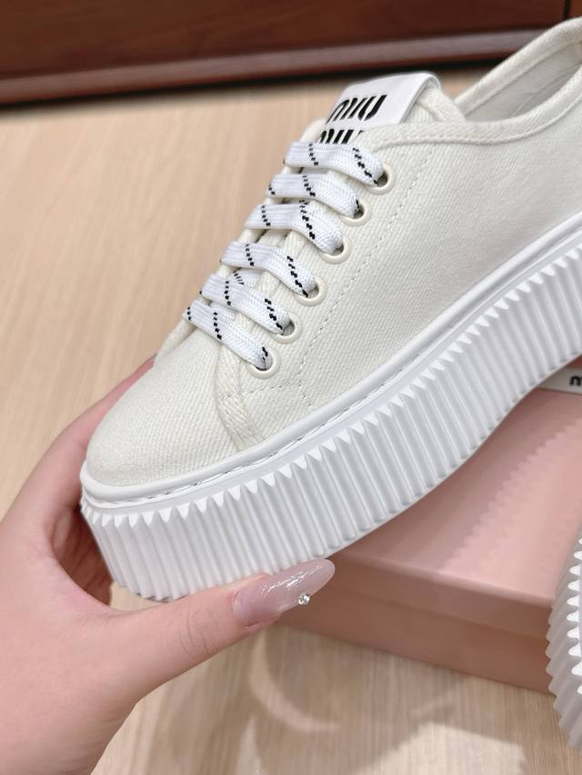 High-quality Miu Miu 25Ss Spring/Summer new style platform canvas slip-on white sneakers. Simple design, ultra-lightweight original mold sole, excellent comfort. Comfortable and easy to match, adds 6cm height. Size: #35-40. Size 40 is custom-made and non-refundable.