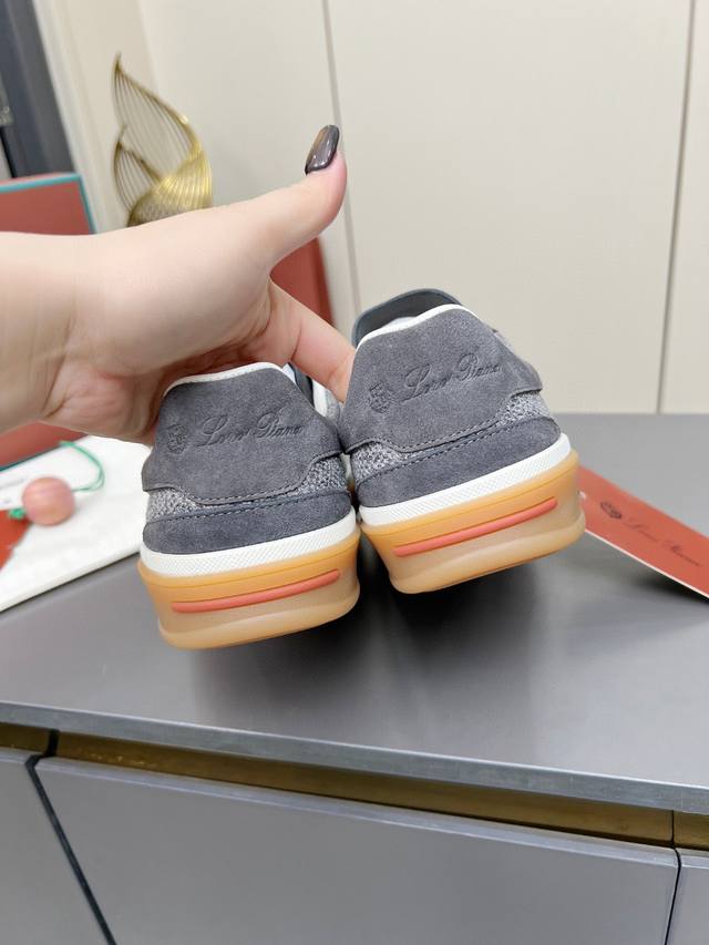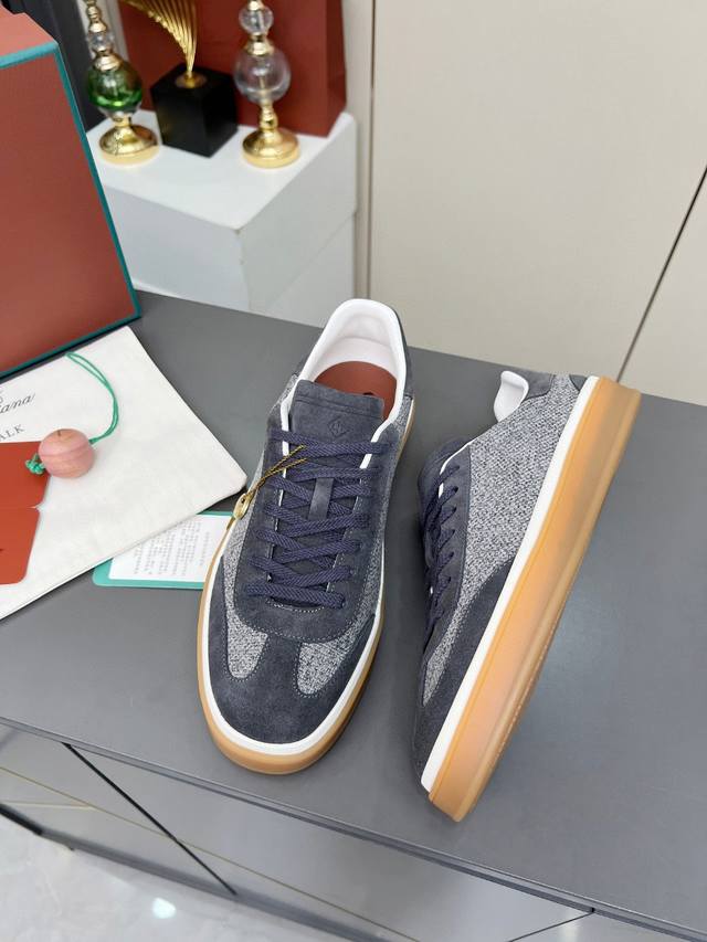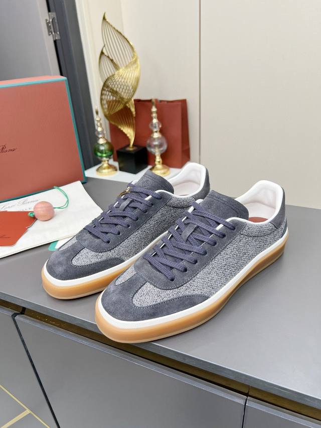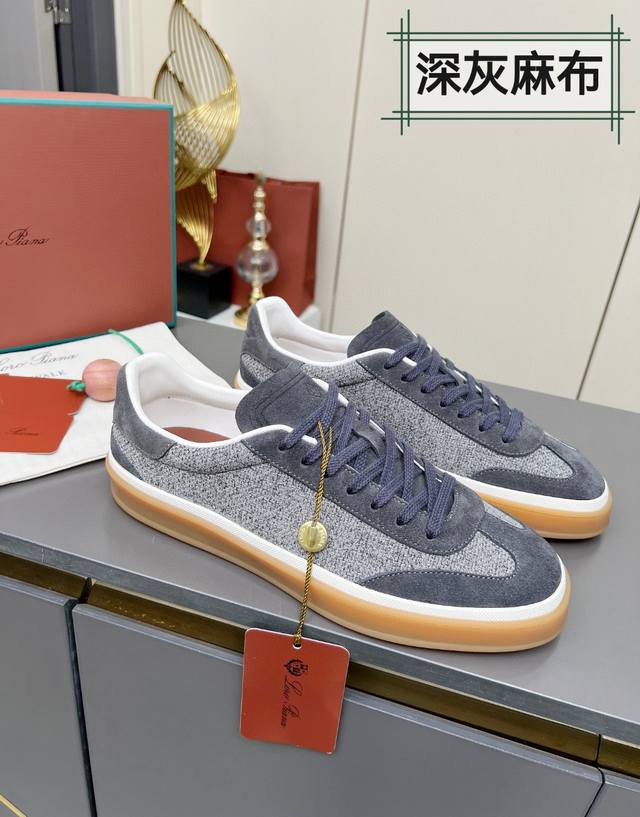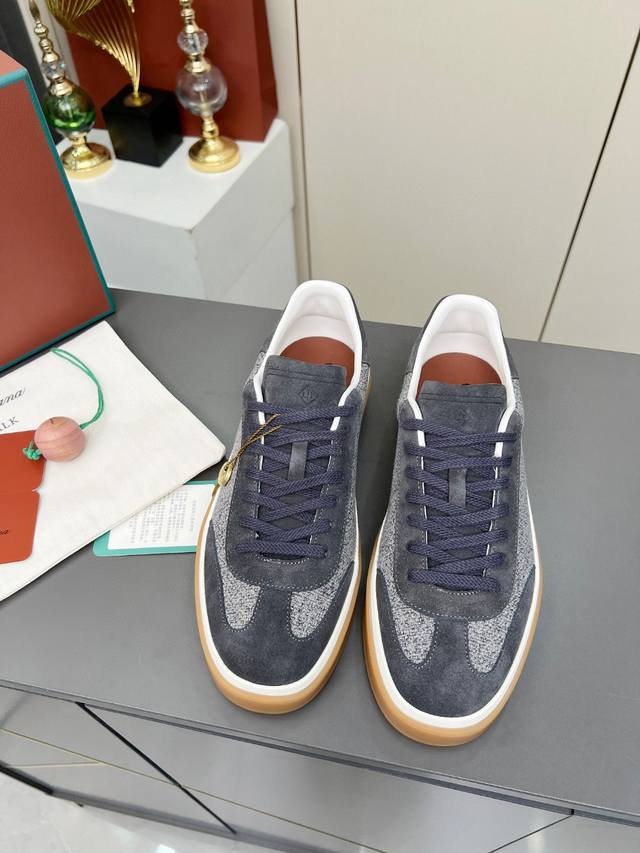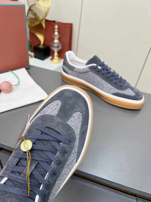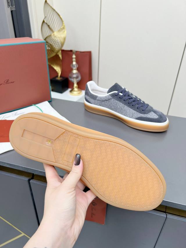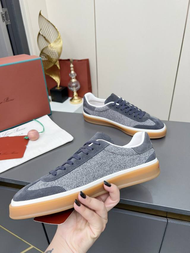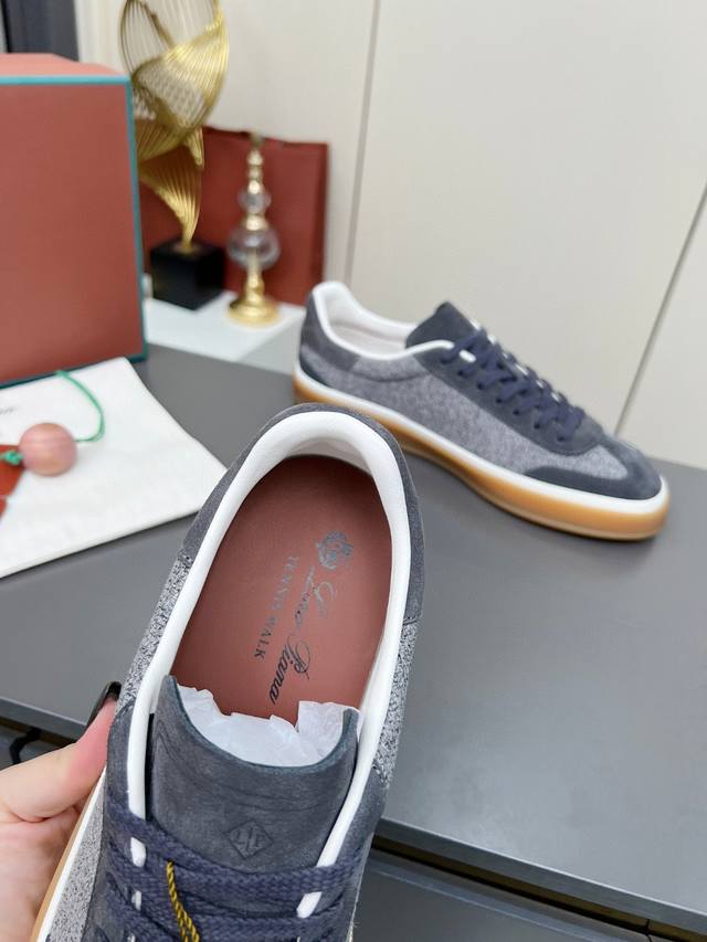 High-quality replica, Italian Loro Piana Tennis Walk series LP couple's tennis shoes, casual sports shoes, sneakers. Original purchase and manufacturing. This new suede tennis shoe features an ultra-low-top design, suitable for year-round wear. The edging and sole create a relaxed and charming color combination, harmoniously blending functionality with a low-key, individualistic style, making it an ideal footwear choice for urban wear. Features include a soft calfskin tongue with a Kummel-colored inlay at the heel, embossed LP logo, cotton laces, suede sole, rubber lining, and calfskin. Upper: Special linen eco-friendly calfskin. Lining: Cowhide lining, cowhide insole. Sole: Original molded Tpr ultra-lightweight outsole. Packaging: Original full packaging. Women's sizes: 35-40, factory price. Men's sizes: 39-45, factory price.