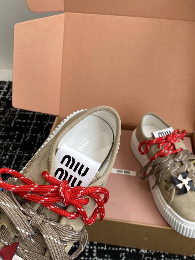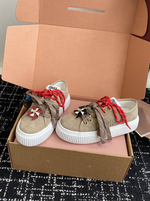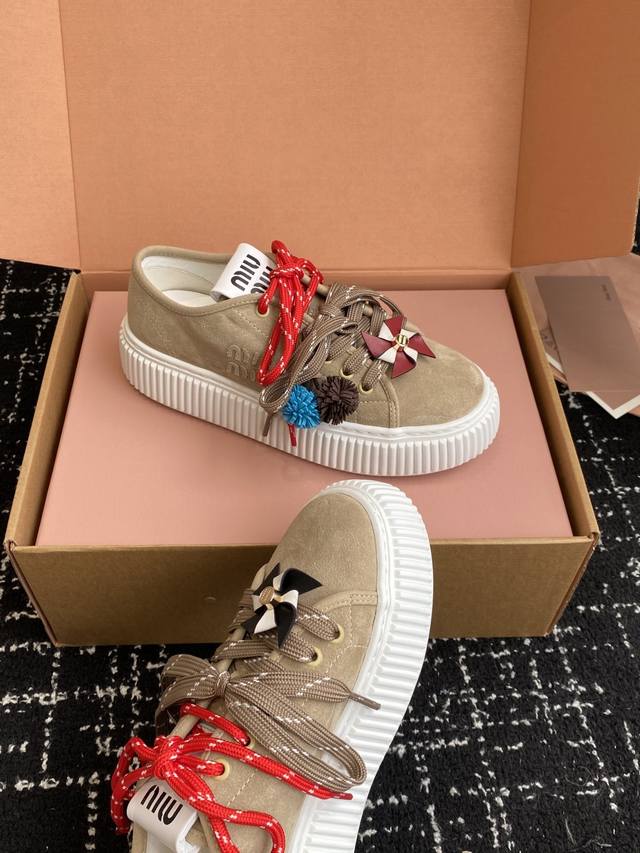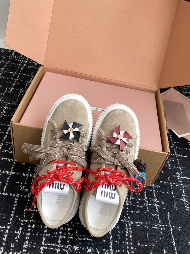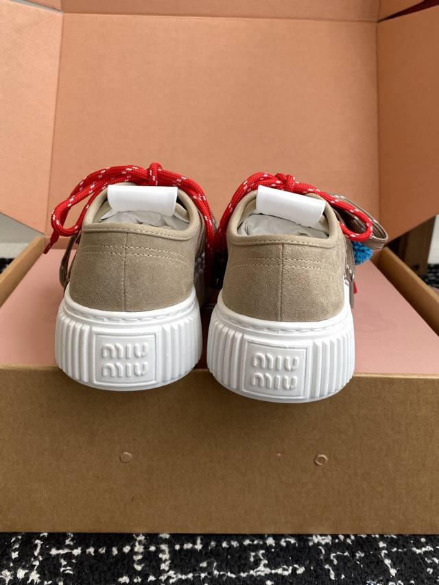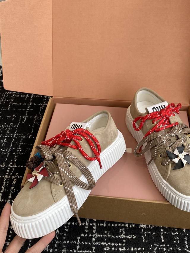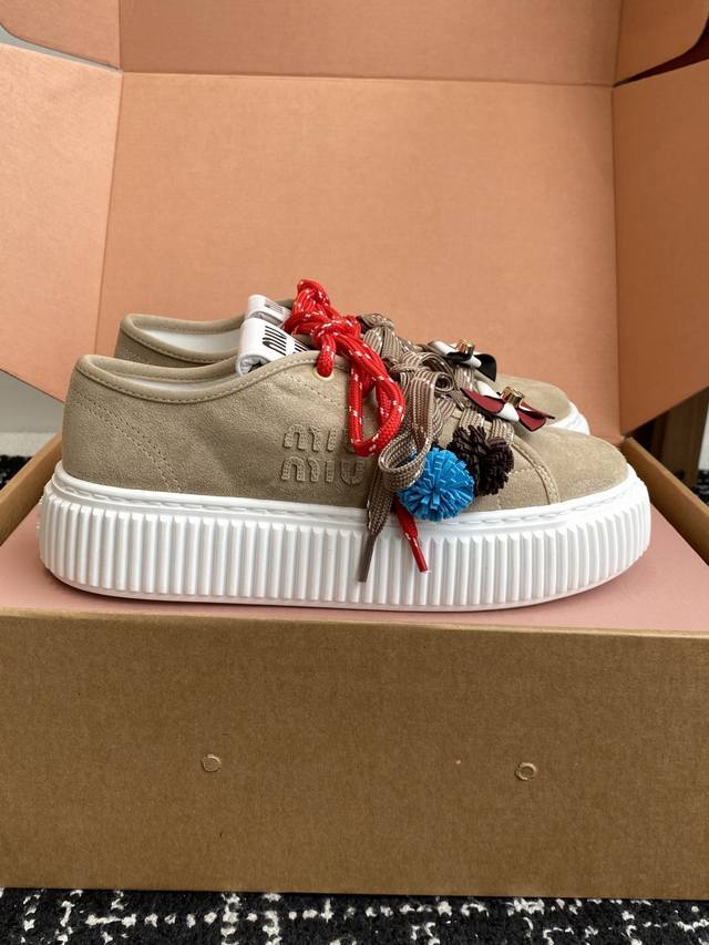 High-quality sheepskin and wool lining, 300 yuan. Miu Miu 25Ss Autumn/Winter New Thick-Soled White Sneakers, Wool Sneakers. Simple design, ultra-lightweight original mold sole, excellent comfort. Comfortable and easy to match, adds 6cm height. Size: #35-41. 40 & 41 are custom-made and non-refundable.