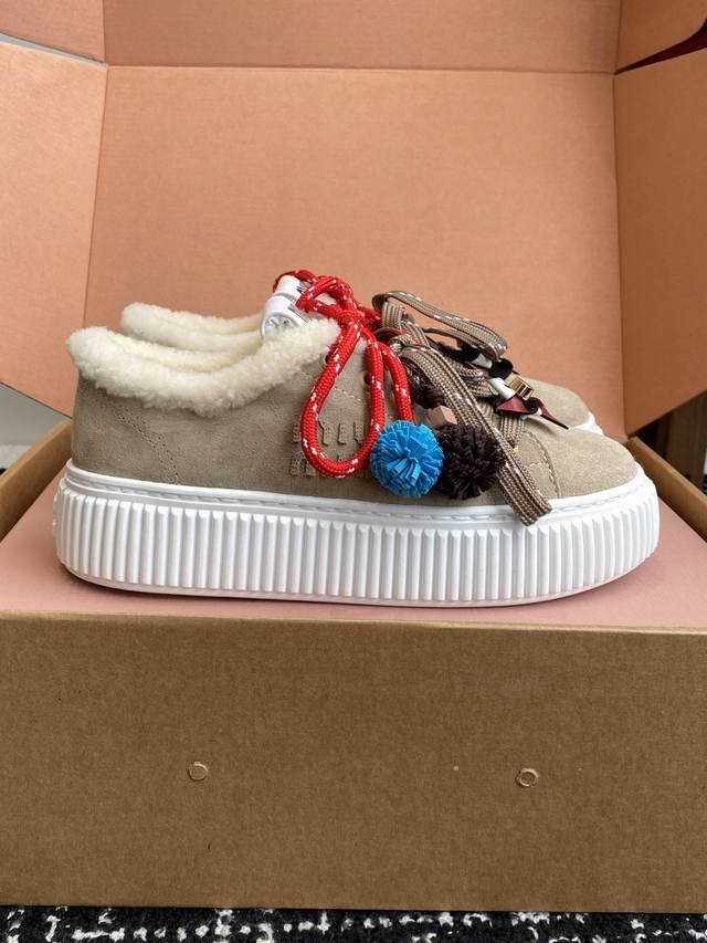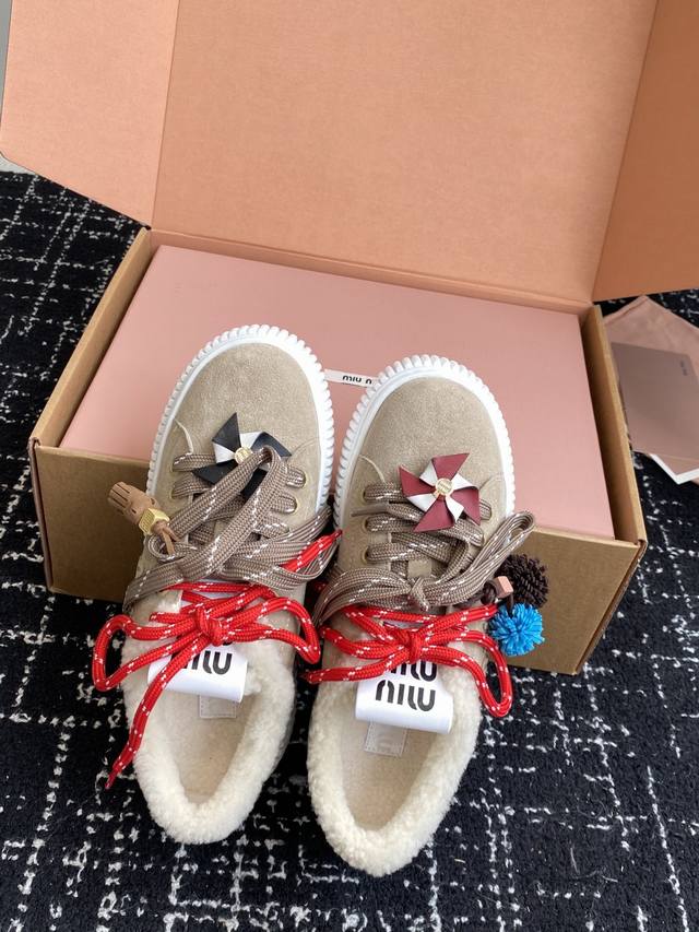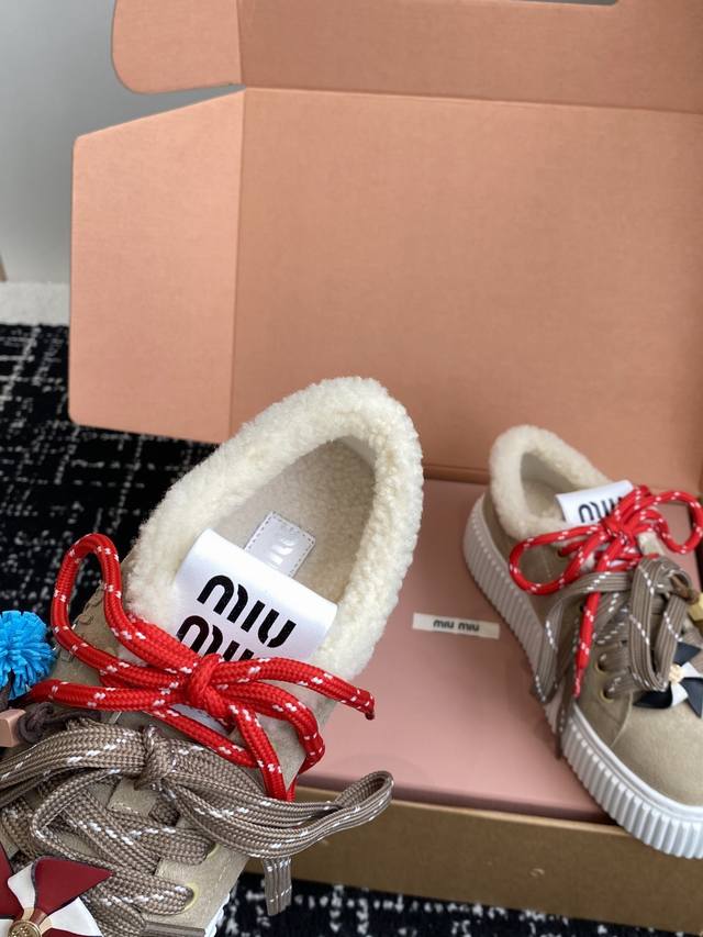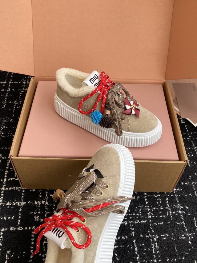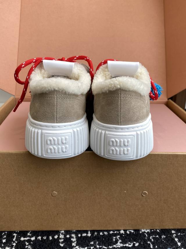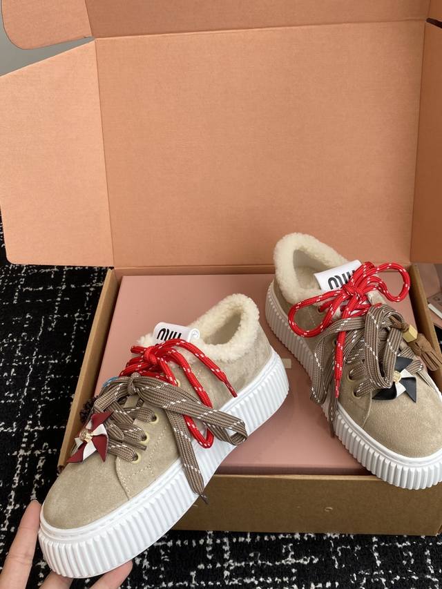 High-quality sheepskin lining, 390 RMB. Wool lining. Miu Miu 25Ss Autumn/Winter New Thick-Soled White Sneakers. Simple design, ultra-lightweight original mold sole, excellent comfort. Comfortable and easy to match, adds 6cm height. Size: #35-41. 40 & 41 are custom-made and non-refundable.