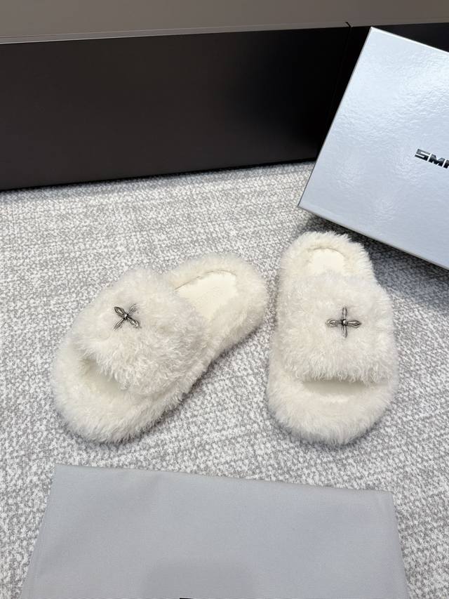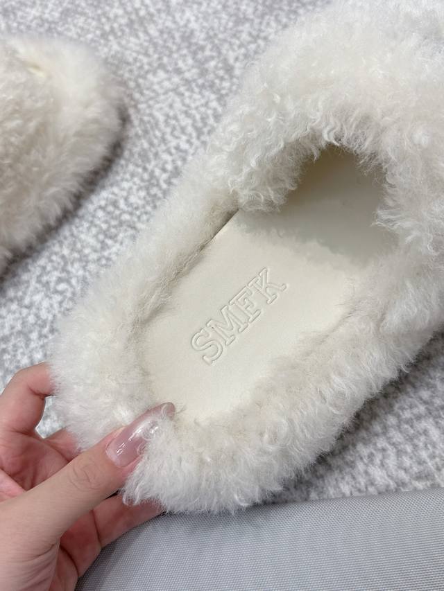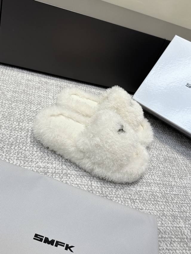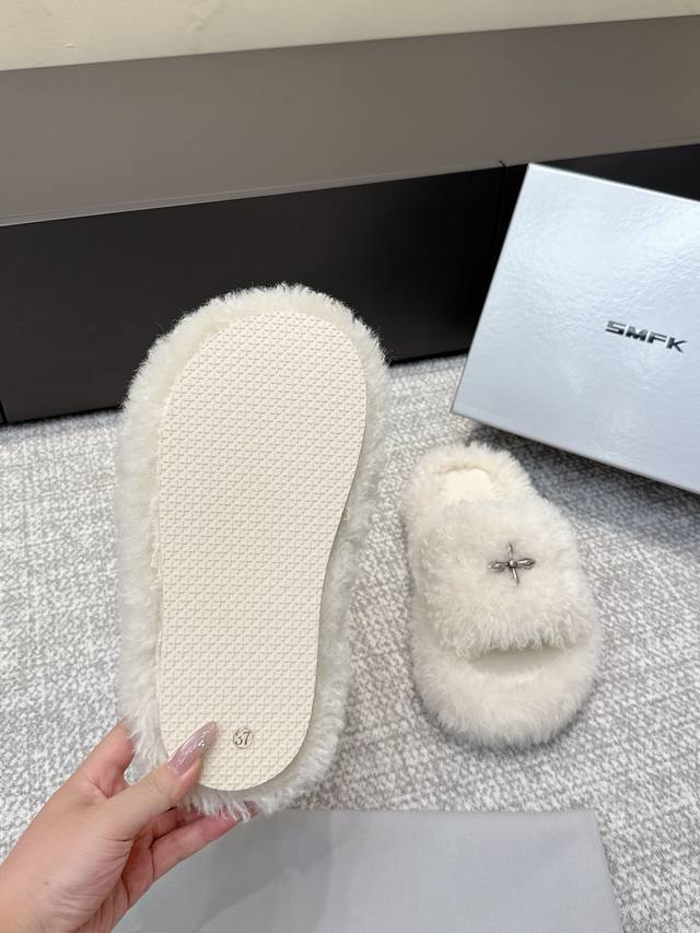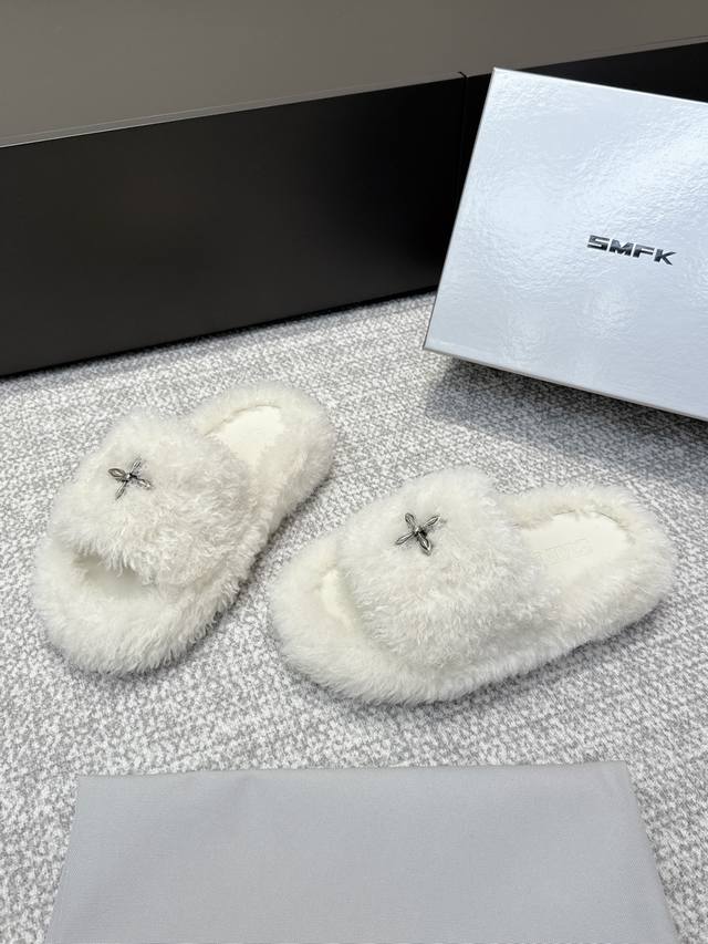 Smfk platform slippers, a super popular style, I've been obsessed with them! Many online influencers and bloggers are wearing them. Cleverly incorporating brand elements, they're fashionable, versatile, and a favorite among hot girls. Material: Wool lining, synthetic leather insole, original metal logo, original TPU anti-slip outsole. Comes with packaging. Size: #35-40. Size 40 is custom-made and non-refundable.
