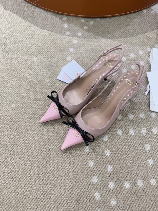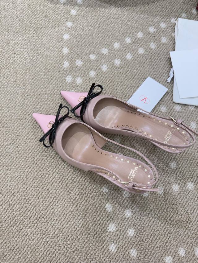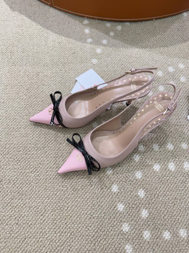 High-quality Vt 25 Spring/Summer new style bow-knot color-blocked open-back high heels Ddd - Imported calfskin upper, sheepskin lining, sheepskin insole. Ddd Patent leather bow decoration with mini Vlogo embellishment. Ddd Italian genuine leather outsole. Ddd Heel height: 4.5cm - 8.0cm Ddd Size: 35-40, 40 is customizable Ddd