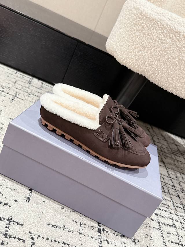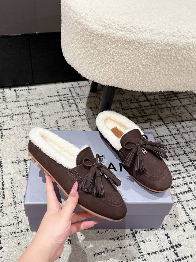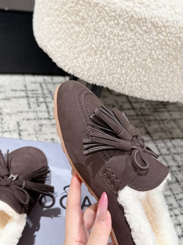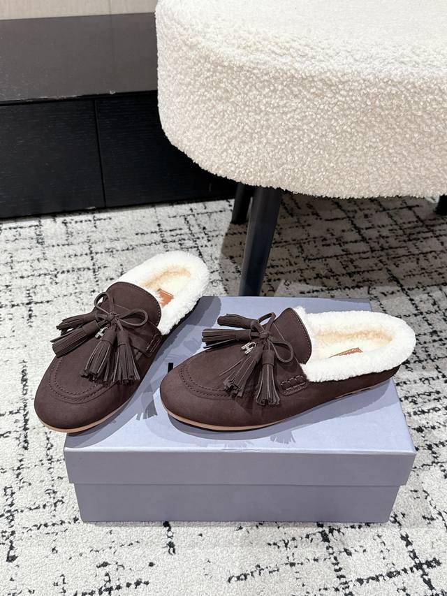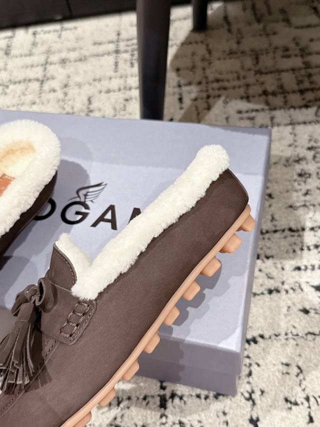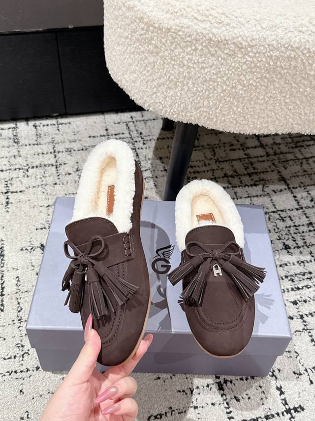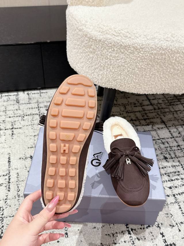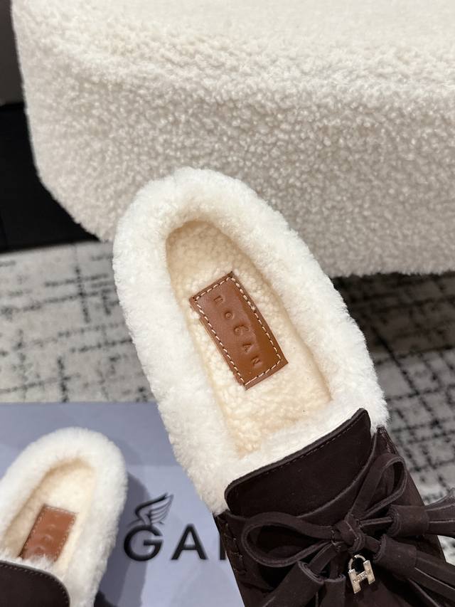 Hogan 25 H625 Series Women's Mules, Liu Shishi's Style, New Furry Slippers DDD This color is so warm! These new furry slippers are light, comfortable, and beautiful. Two colors are available; the lamb's wool paired with camel is so gentle, it looks warm just by looking at it. Furry slippers are so popular, Hogan has also released one, light and warm. The Hogan series of furry mules creates a refreshing autumn/winter look with a simple design, while the playful and unique design showcases a casual and fashionable style. The ultra-light sole enhances comfort. Even in winter, a pair of mules can easily create an effortless sense of style. This pair of mules is lightweight, comfortable, and warm, made of suede leather with a special lamb's wool lining. It features a buckle strap and a branded metal H buckle with tassels, making it super beautiful. The non-slip, moccasin-like sole provides stability and comfort. DDD Upper: Cashmere leather with buckle design and branded metal H buckle DDD Lining: Wool lining DDD Outsole: Original Oxford sole DDD Size: #35-40 Size 40 is custom-made and non-refundable/non-exchangeable DDD