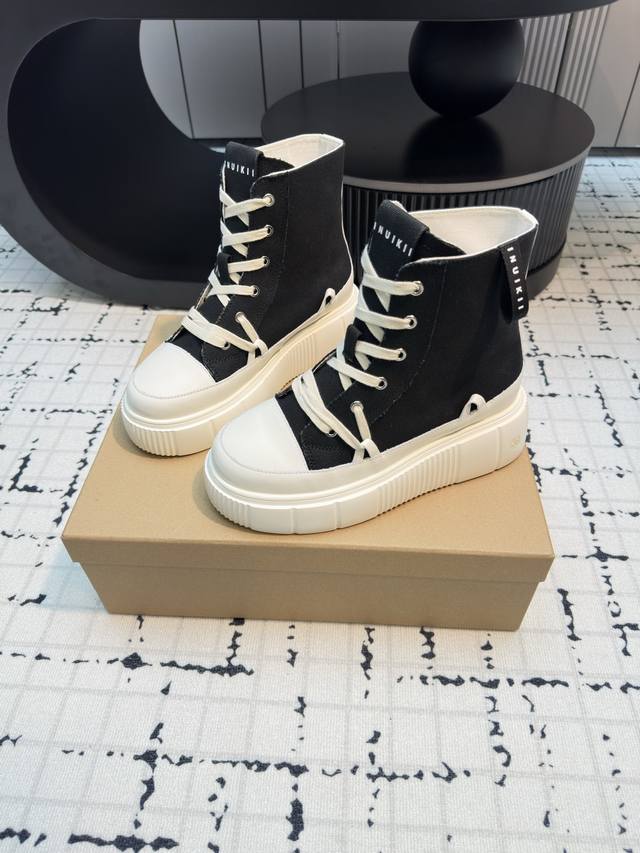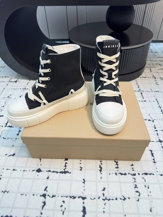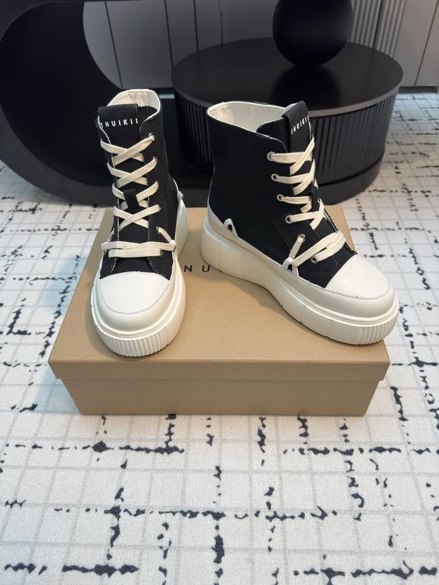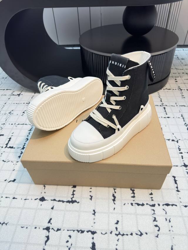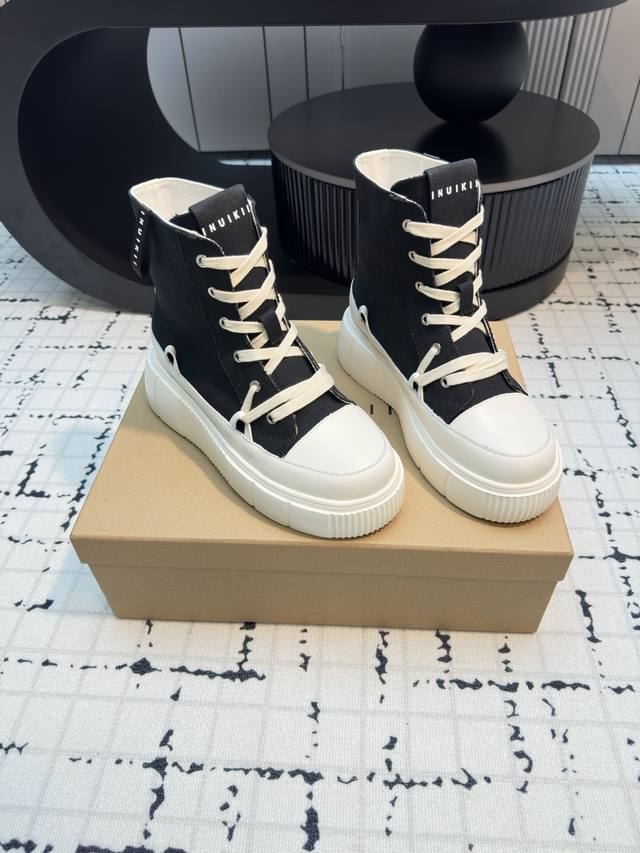 Inuikii's new high-top biscuit shoes! Primarily stylish, featuring a signature deconstructed silhouette. The shoe body boasts simple, three-dimensional lines, with a breathable canvas upper for added softness and comfort. It features a chunky rubber sole, creating a slimming and leg-lengthening effect. The sneaker style is suitable for various everyday outfits, offering a casual, lightweight, and comfortable feel. Material: Original custom canvas Lining: Original custom canvas Outsole: Rubber PU outsole Sizes: 35, 40. Sizes 40 are custom-made, no returns or exchanges.