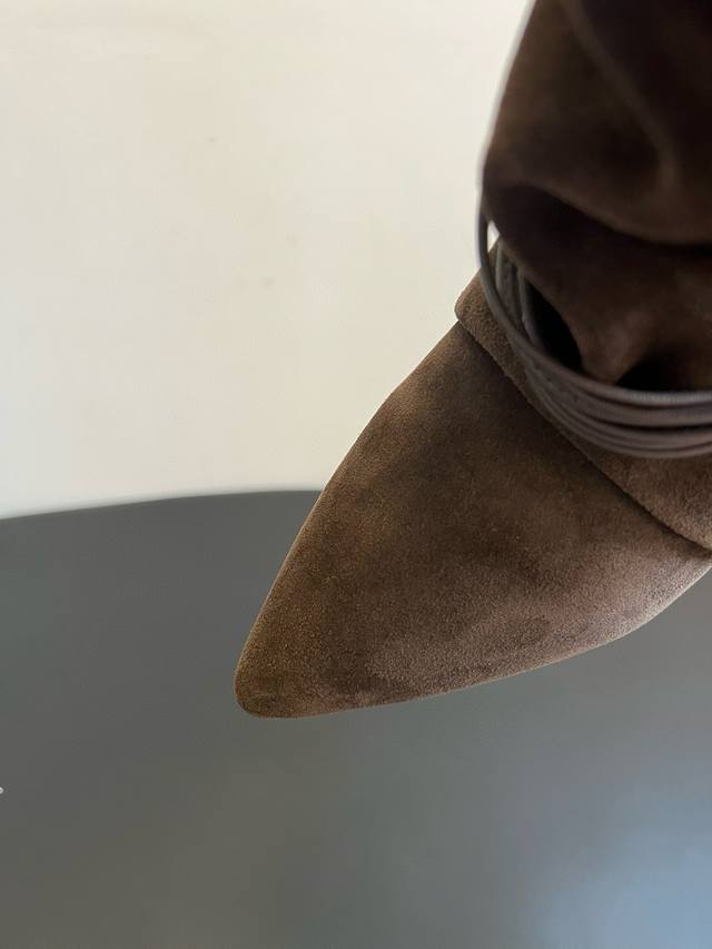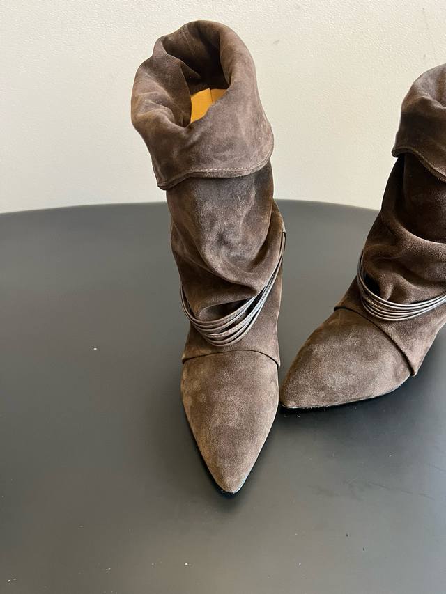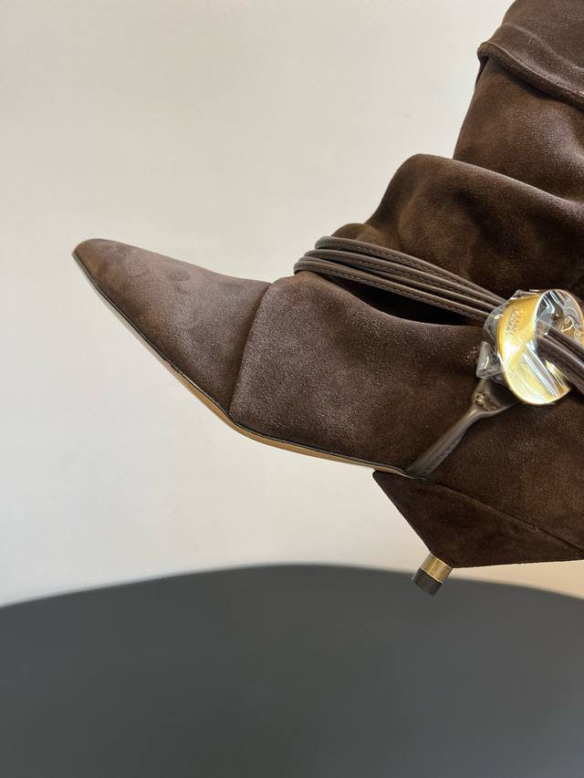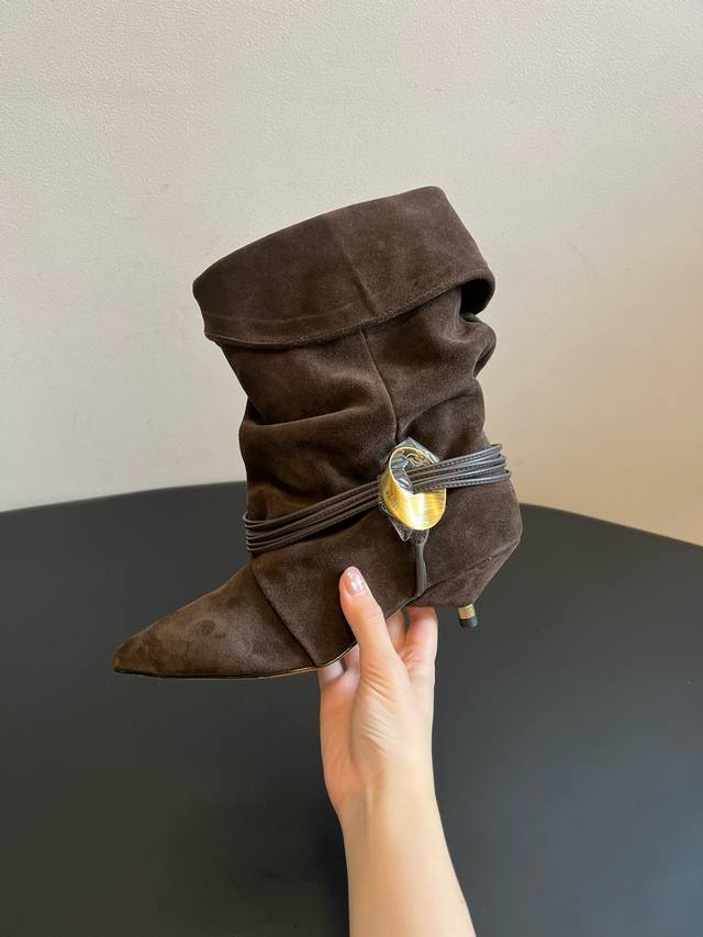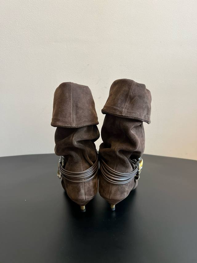 . Made of suede, these boots offer a warm, soft feel and a vintage vibe. The foldable shaft adds a casual touch. The shoe features multiple brown straps adorned with metal rings, adding a touch of design and sophistication. The pointed toe and stiletto heel flatter the foot while adding a touch of feminine elegance. The stiletto heel is also easier to manage than a high heel. Pair this with a midi skirt featuring a vintage floral pattern for a retro French look, perfect for everyday outings or dates, showcasing a romantic, vintage vibe. Pair this with black leggings or jeans and a white sweater or simple shirt to highlight the design, creating a simple yet stylish everyday look.