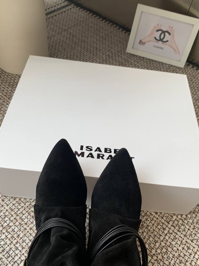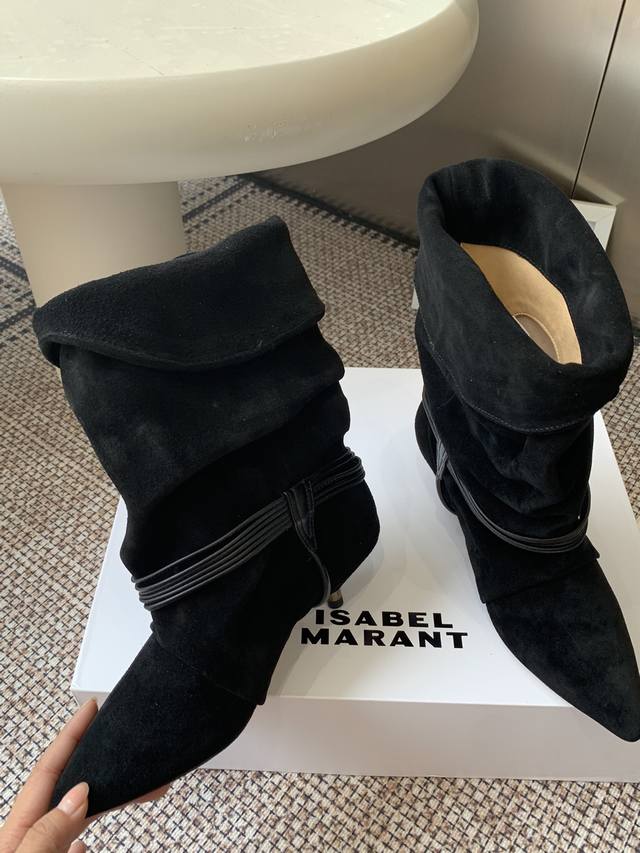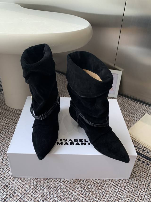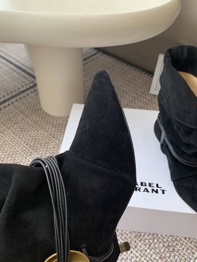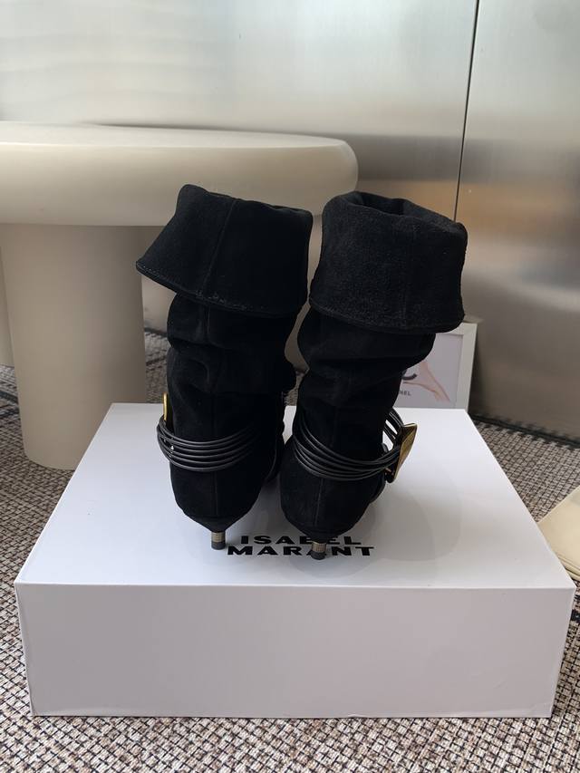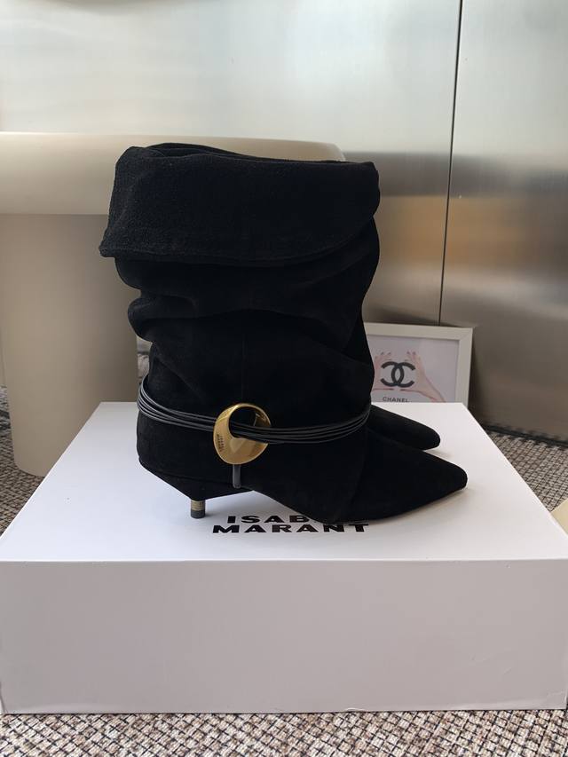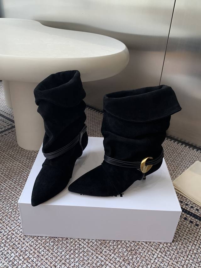 Isabel Marant 25Ss New Suede Kitten Heel Slouch Boots. Made with suede for a warm and soft texture, these boots have a retro vibe. The fold-over shaft adds a casual touch. The upper features multiple brown straps with metal ring embellishments for enhanced design and sophistication. The pointed toe and stiletto heel flatter the foot shape and add a touch of feminine elegance. The stiletto heel is also easier to wear than a high heel. The retro French style is perfect for everyday outings or dates, creating a simple yet stylish look . Upper: Cowhide suede; Lining: Cowhide leather; Outsole: Genuine leather. Sizes: 35-40; Size 40 is custom-made.