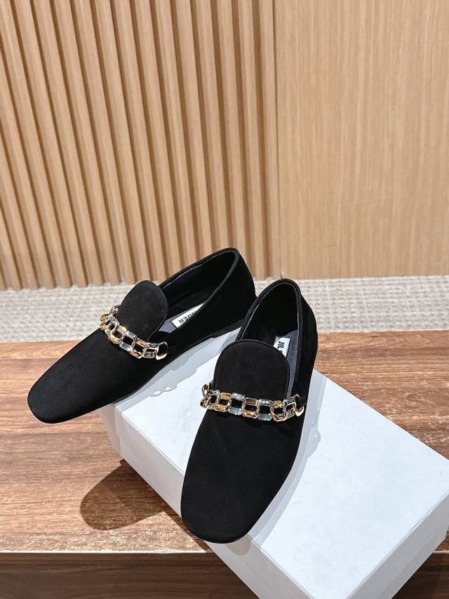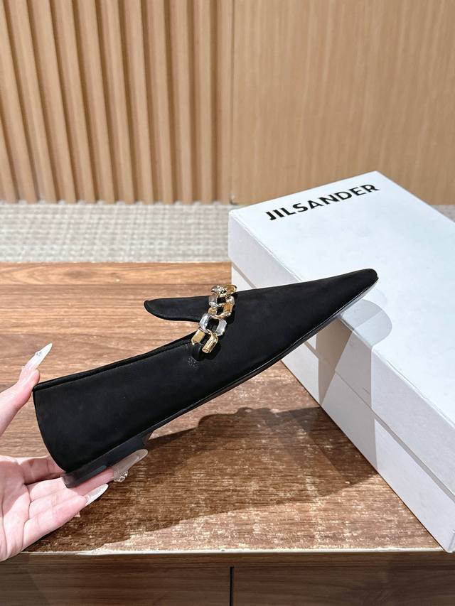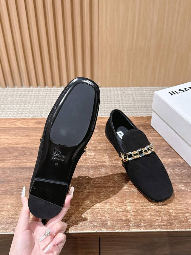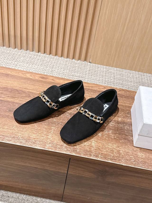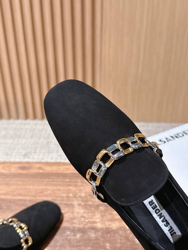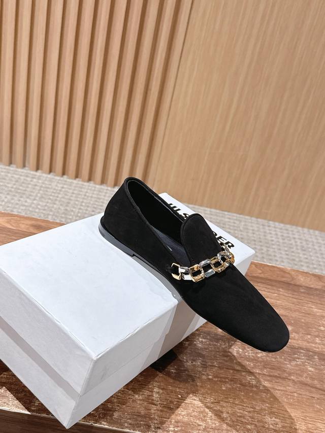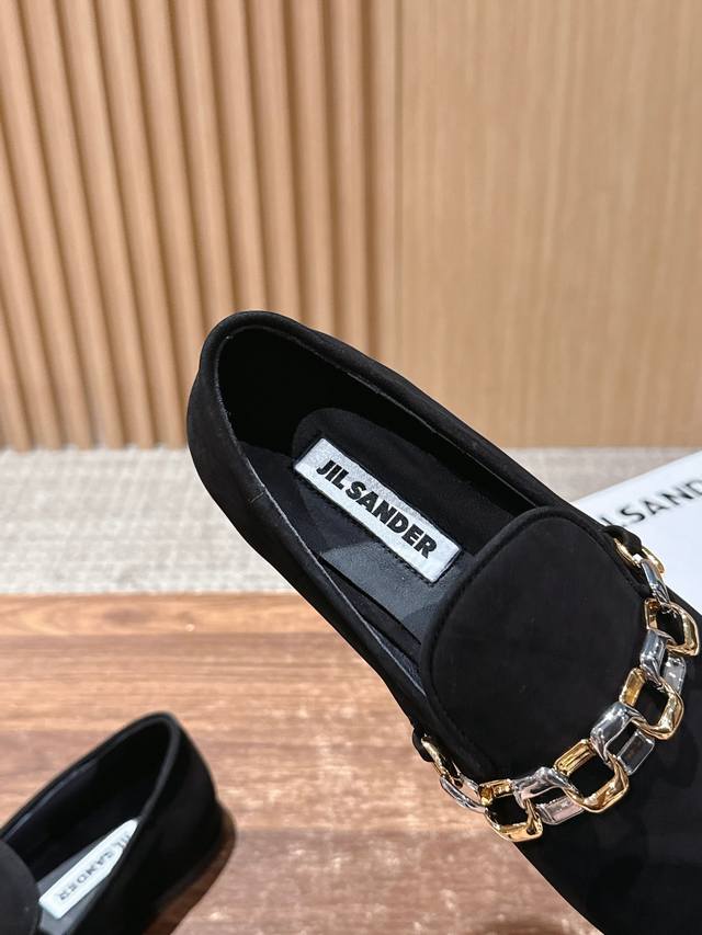 Jil Sander Two-Tone Knotted Chain Loafers Square Toe Slip-On Flat Kitten Heel Single Shoes DDD A typical loafer style, slip-on for easy on and off. The square toe design is retro and sophisticated, flattering the foot shape while providing ample space for the toes, unlike pointed toes which can feel too constricting. Comfort is ensured both visually and practically. DDD The most eye-catching embellishment on the upper is a metal chain, featuring a gold and silver color scheme. The combination of these two metallic colors is neither too monotonous nor too ostentatious, adding a touch of glamour and style to the shoe. This is the finishing touch, instantly making the classic loafer style more individual and trendy, reflecting Jil Sander's attention to detail and quality, cleverly combining simplicity and luxury. DDD Upper: Sheepskin oil leather/suede leather DDD Insole: Sheepskin DDD Outsole: Italian injection-molded genuine leather outsole DDD Heel height: 6.5cm (flat heel) DDD Sizes: 35-39 Sizes 40 and 41 are custom-made and non-refundable DDD