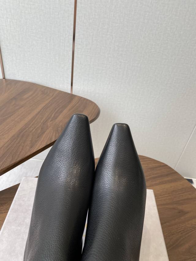 The elegant pointed toe upper is made of brushed leather, cleverly spliced with exquisite knit socks, eye-catching with signature