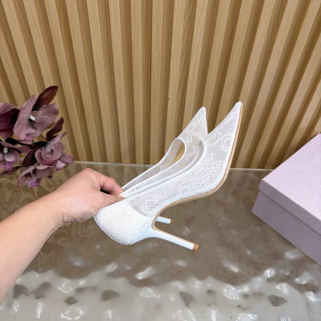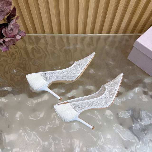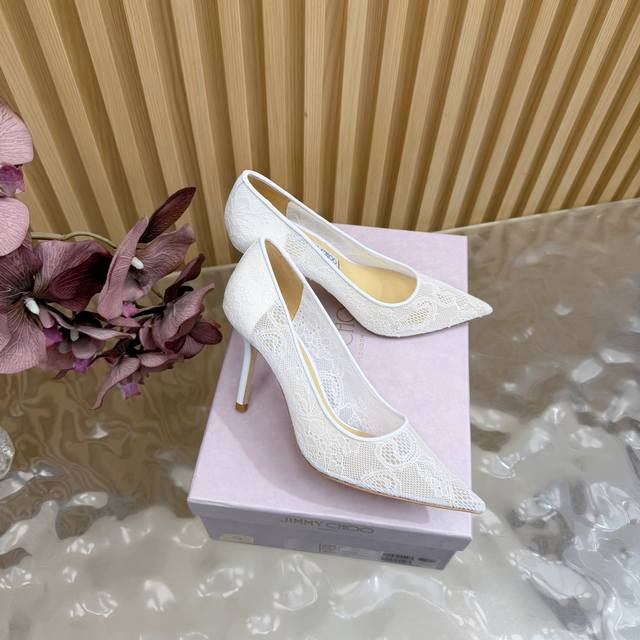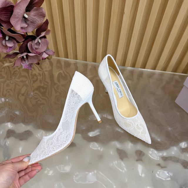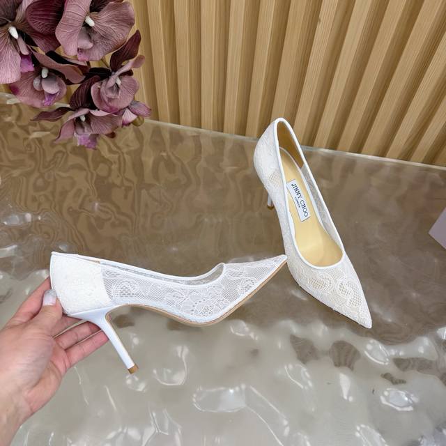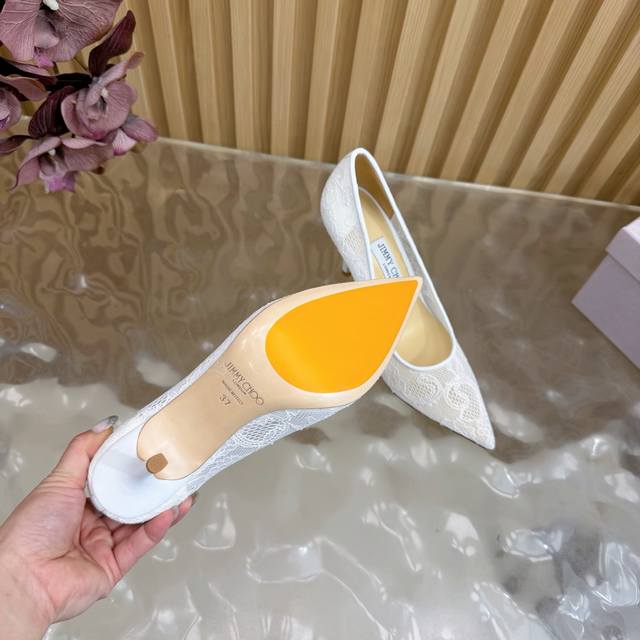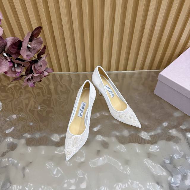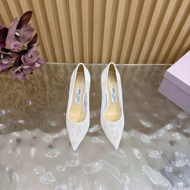 Jimmy Choo classic lace pointed-toe high heels, an absolutely ethereal pair! The lace element is dreamy, romantic, playful, and cute, exuding a sophisticated charm while maintaining a modern and fashionable feel, revealing a touch of elegant allure! JC shoes fulfill every girl's fantasy of high heels, offering both a youthful look and a goddess-like style! The upper features original custom lace, the insole is lined with pearlescent sheepskin, and the outsole is made of original Italian genuine leather. Heel height: 6.5cm (flat), 8.5cm (wide). Sizes: 35-39, 34, 40, 41 (custom-made).