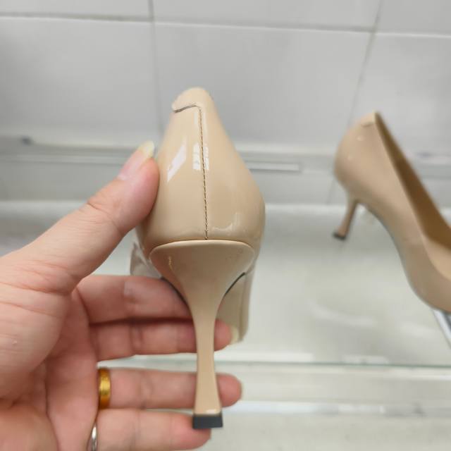 Jimmy Choo high heels, crafted from high-gloss patent leather for a modern silhouette. The striking pointed toe and exquisite crystal-embellished straps shimmer, enhancing the allure of your feet. Upper: Imported patent leather; Lining: Sheepskin; Heel height: 8.5cm; Outsole: Italian genuine leather; Sizes: 35-39, 34, 40-42 (Made to order, no returns or exchanges).