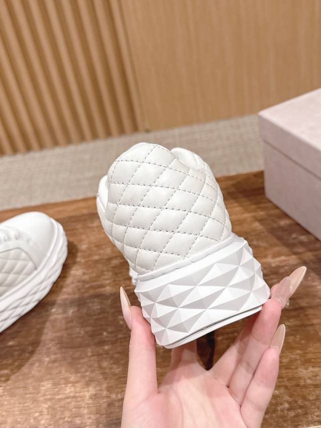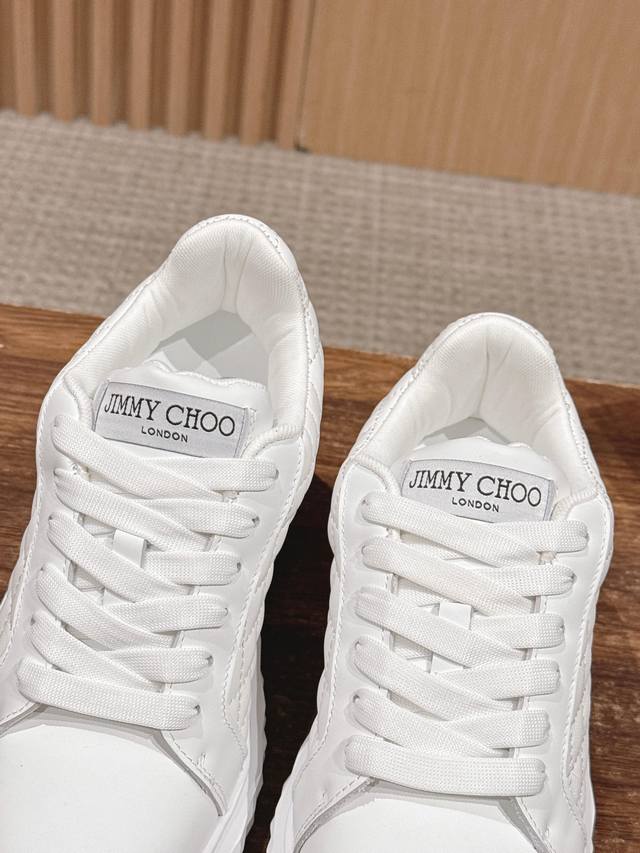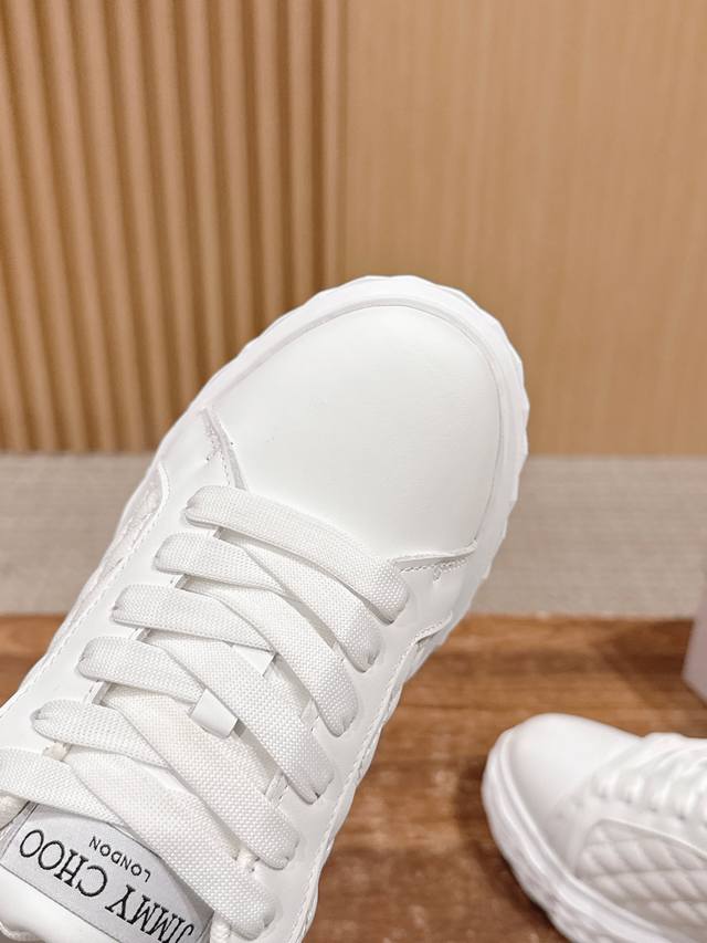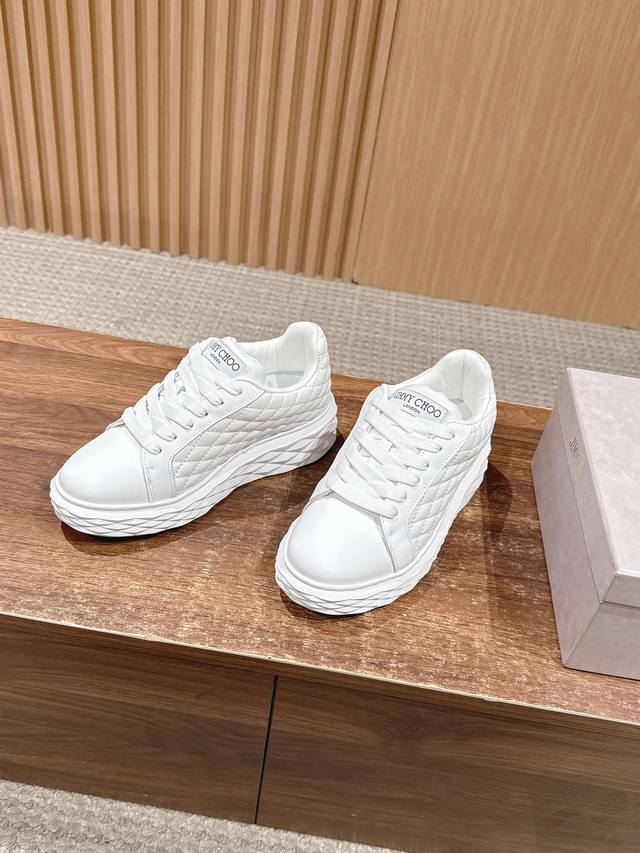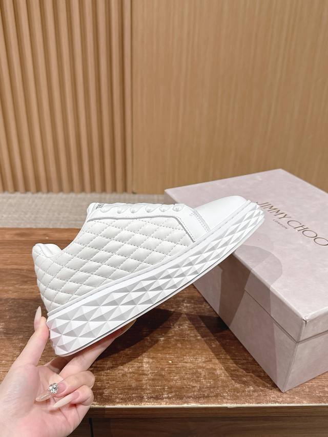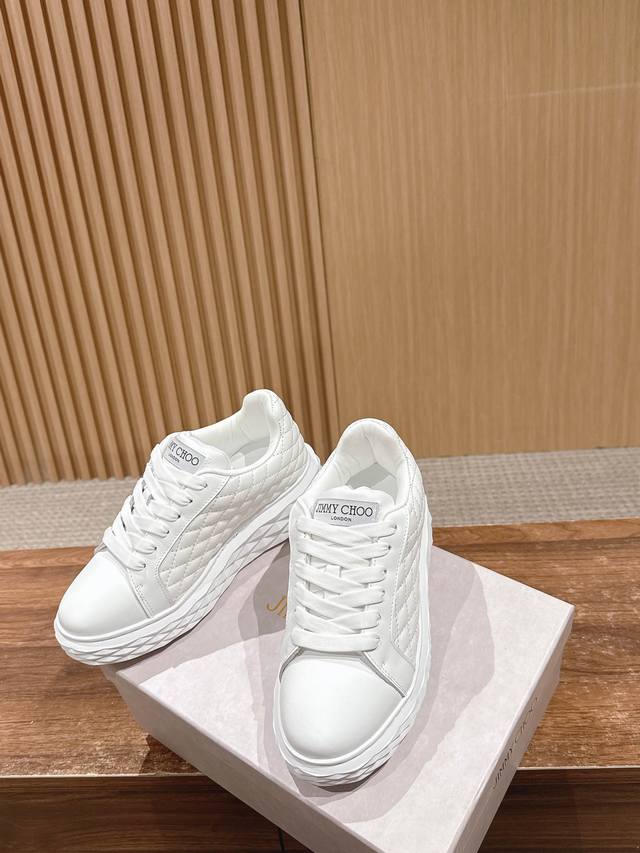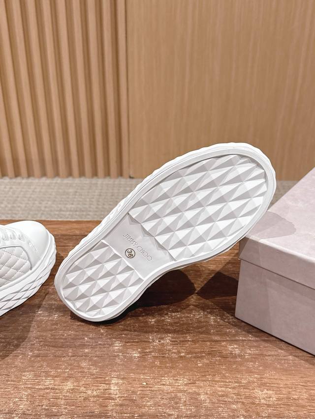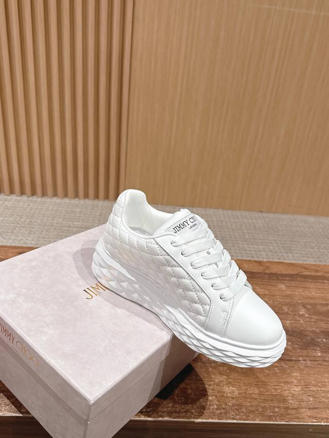 Jimmy Choo's new casual shoes, made of Diamond-patterned quilted leather. The sole features the brand's signature Diamond-cut design, a futuristic style, and an exaggerated, three-dimensional silhouette that creates a comfortable, snug fit and visually elongates the legs. The shoes are lightweight, agile, and comfortably fitted. Sizes: 35-39. Size 40 is custom-made and non-refundable.