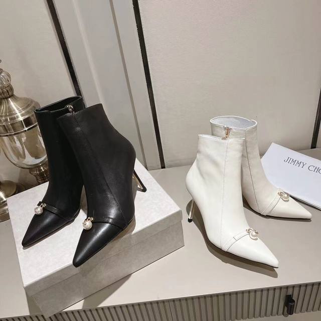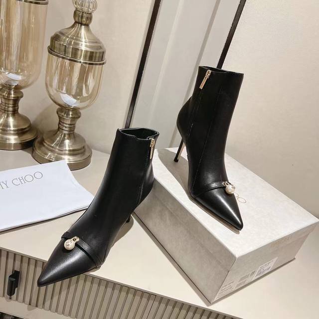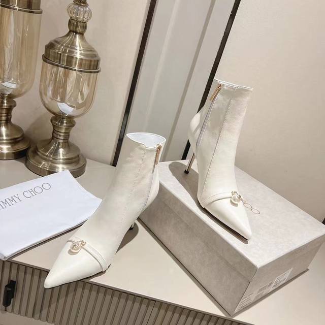 Jimmychoo Ankle Boots: Exquisite, fashionable, luxury brand, top-quality, same style as boutiques. Features exquisite craftsmanship with buckles and handmade genuine leather sole. Breathable and delicate sheepskin lining. Material: Cowhide upper. Heel height: 8.5cm. Standard sizes: 35-39. Custom sizes: 34, 40, 41. Colors: Black (cowhide), Beige (cowhide). Factory direct price.