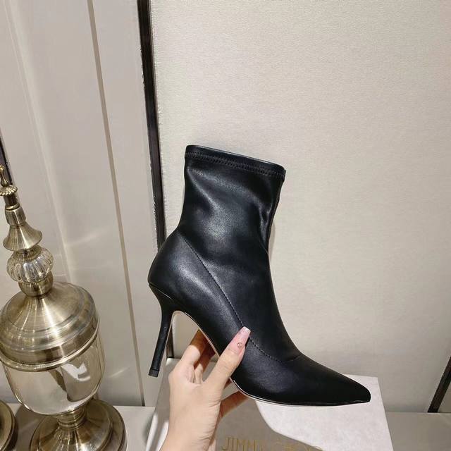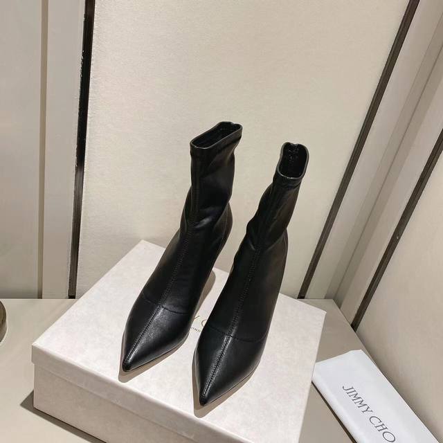 Jimmychoo (Jimmy Choo) High-Heeled Elastic Ankle Boots. Original Design. Top Quality. Fashionable and Sexy. A mainstream style in the boot world. The toe is pointed and full, slightly upturned, capturing the essence of the original. Custom-made Nappa elastic leather ensures softness without sagging. One-to-one matching cut, correct stitching at the joints, double-stitched and tight. Upper: Soft elastic cowhide. Insole: Sheepskin lining. Outsole: Imported Italian genuine leather. Sizes: 35-39, custom sizes 34-40. Heel height: 8cm. Factory direct price.