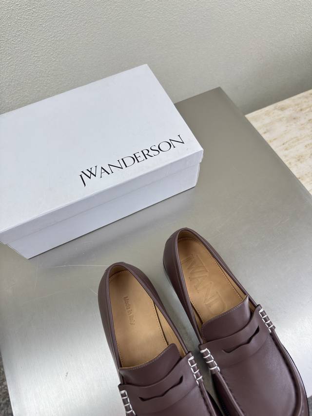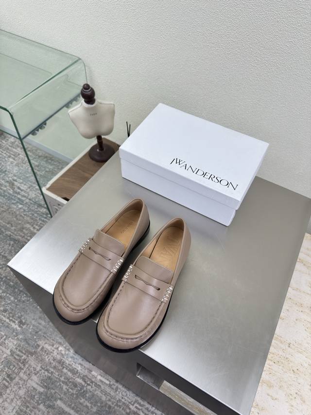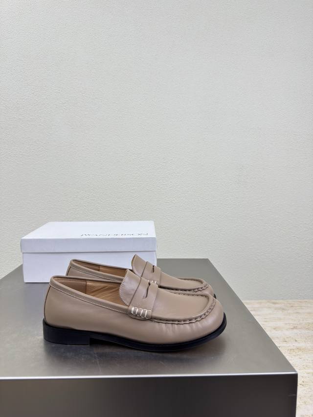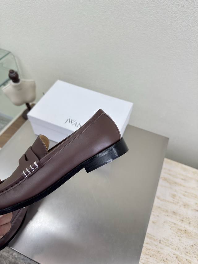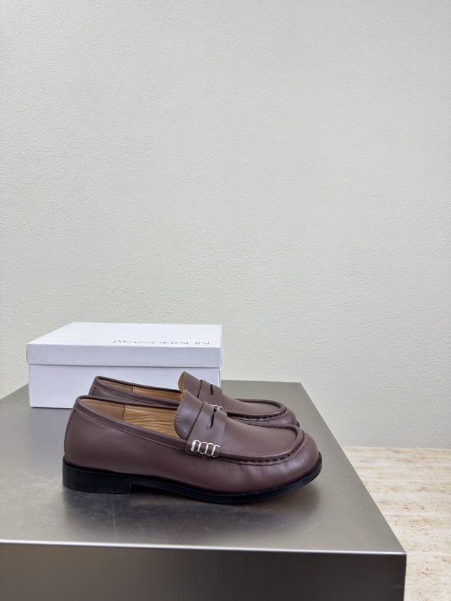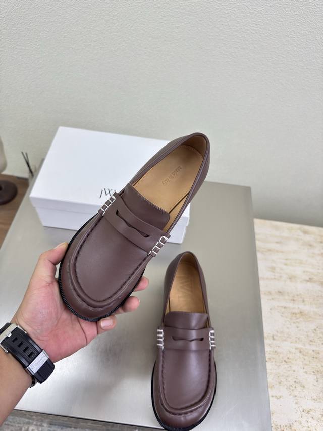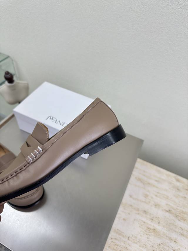 Jw Hand-stitched classic loafers, designer brand women's shoes, coffee & khaki cowhide leather, high-end style, non-slip outsole design, subtly charming. The addition of Ddd elements injects more rebelliousness and strength into the exquisite shoe body, showcasing a slender yet far from weak stance. Sizes: 34 35 36 37 38 39 40 41. Customized with original packaging.