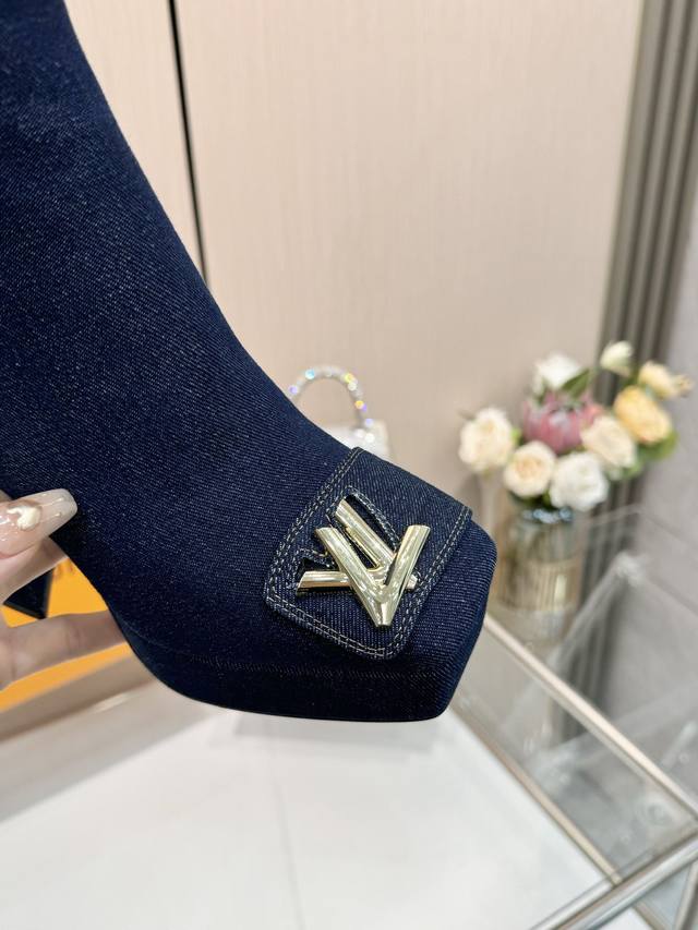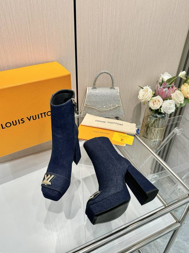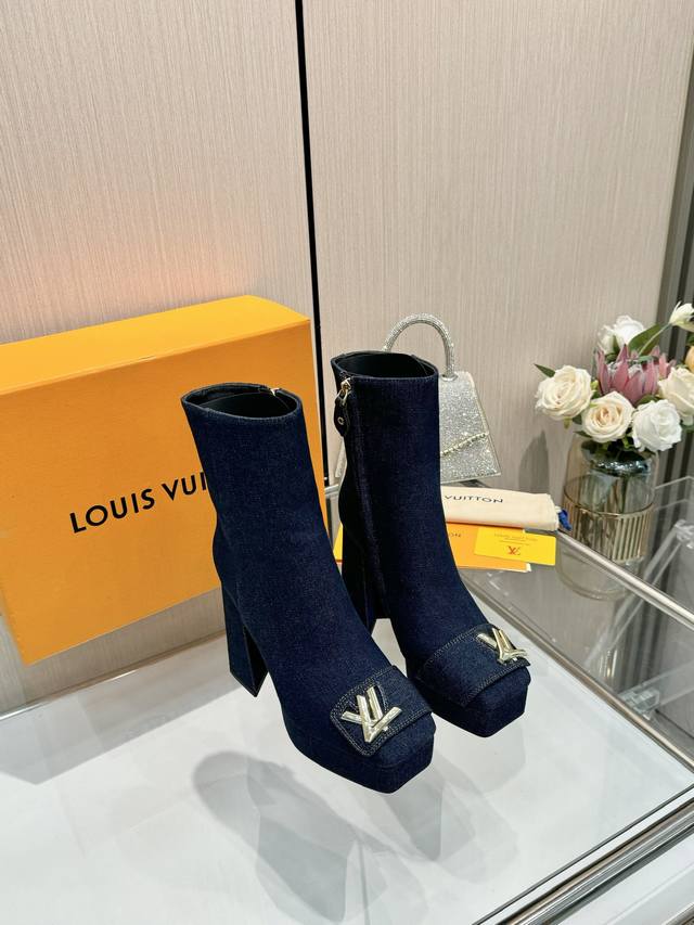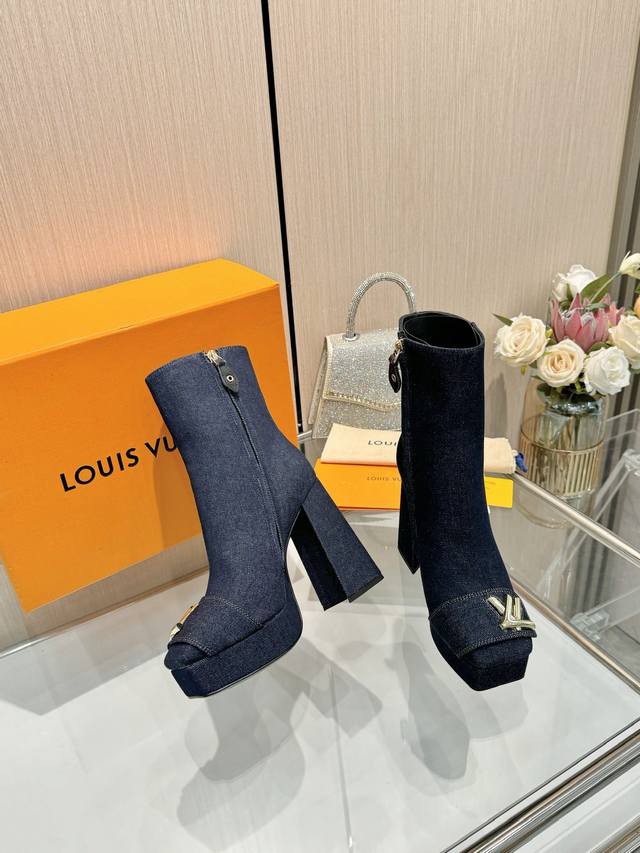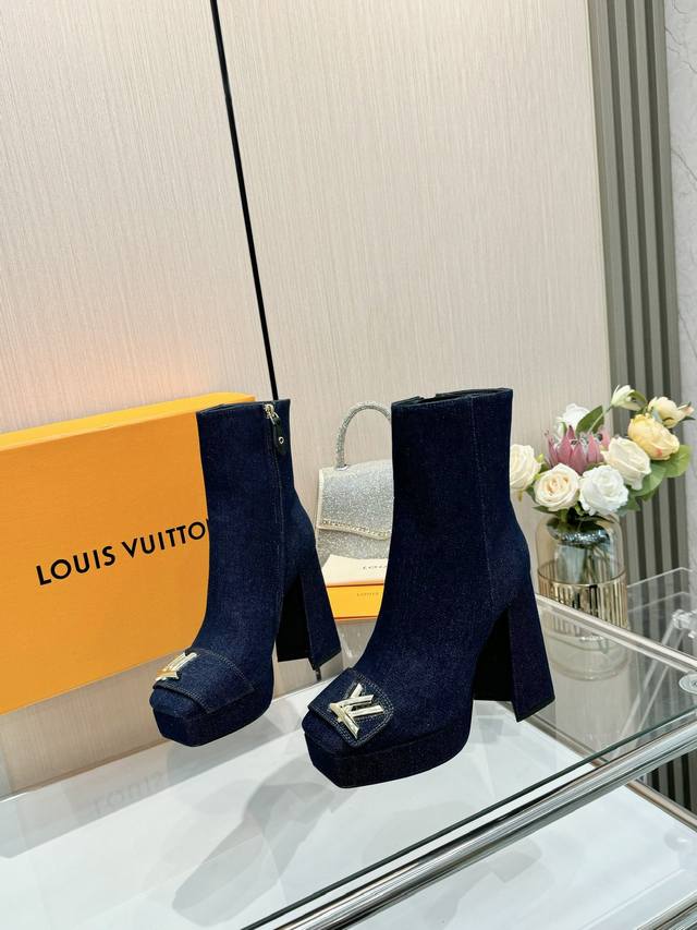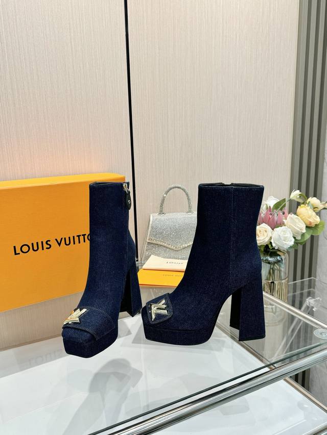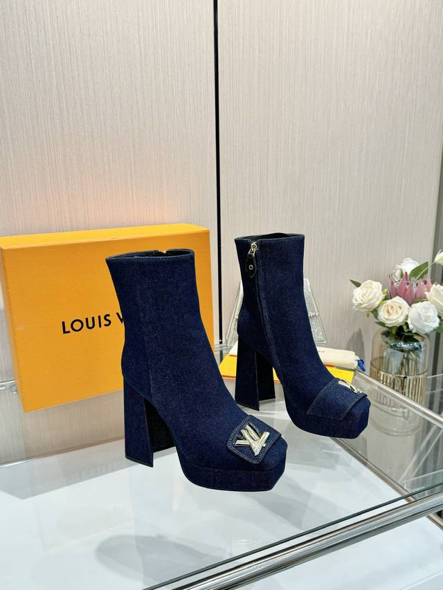 Latest Autumn/Winter L's runway style ankle boots, updated simultaneously with the official website series, factory direct wholesale: Perfect last + platform design, elegant temperament, comfortable to walk in, original molded last, perfect 1:1 shape, high-end quality, imported high-end fabric presents exquisite texture! Material: Classic monogram cowhide imported patent leather denim; Lining: High-quality soft sheepskin; Insole: Imported goatskin; Custom-made A-grade high-density private mold sole, luxurious packaging! 3cm platform + 12cm embroidered leather heel; Sizes: 35-40, 34, 40, 41 (custom orders are non-refundable).