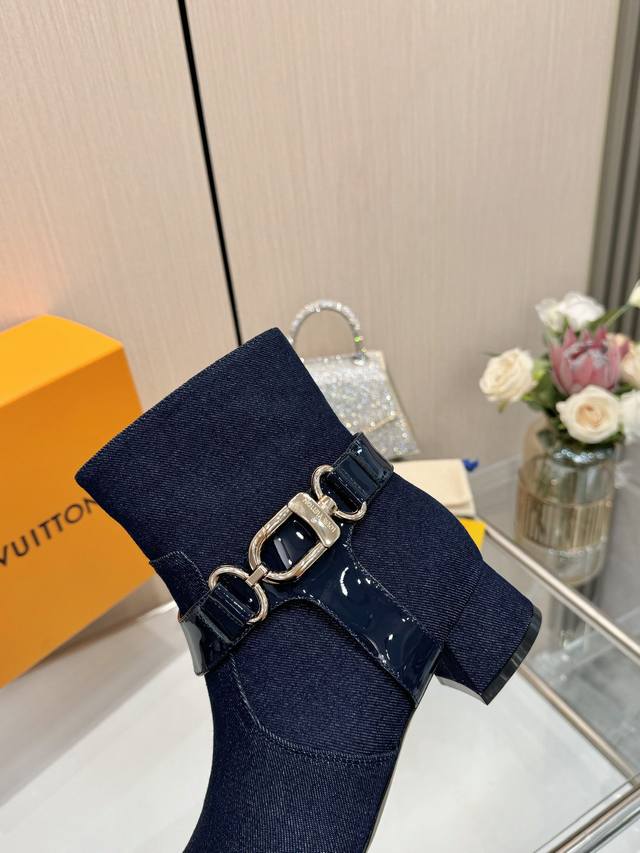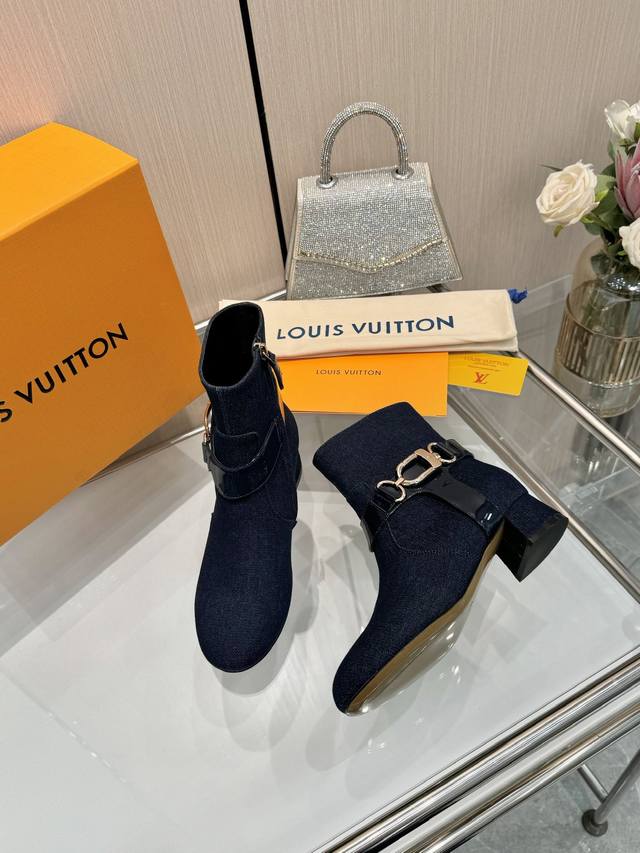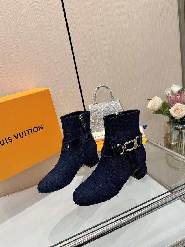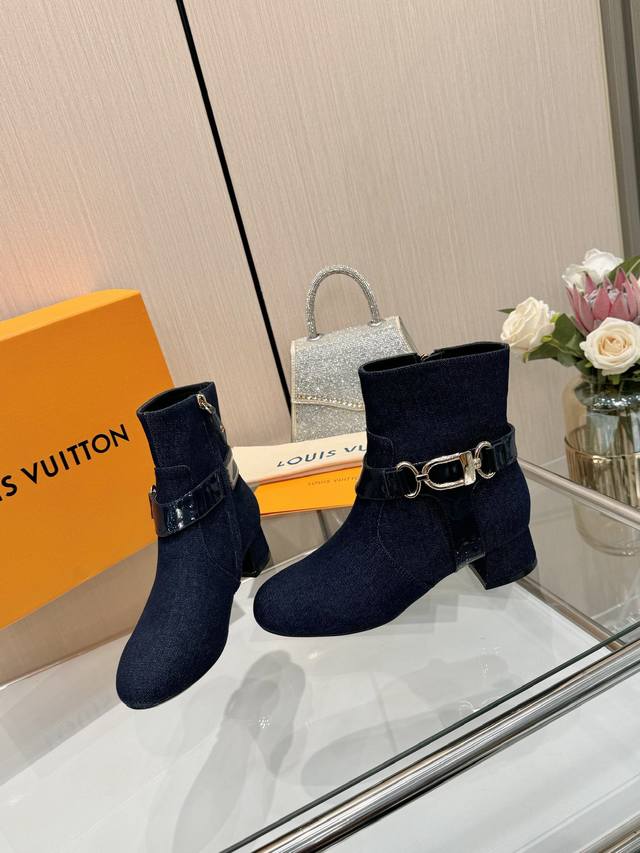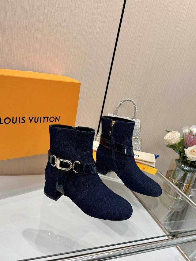 Latest L brand autumn/winter runway style ankle boots, factory direct wholesale: Perfect last + new element buckle, extremely intricate craftsmanship, comfortable flat design, no foot fatigue while walking, original molded last, ultimate 1:1 shape, high-end quality, imported high-end fabric presents exquisite texture! Material: Classic monogram denim, imported calfskin, imported patent leather. Lining: High-quality soft sheepskin lining. Insole: Imported goatskin. Custom-made A-grade high-density private mold outsole. 4cm leather heel. Sizes 35-40, 34, 40, 41 (custom orders are non-refundable).