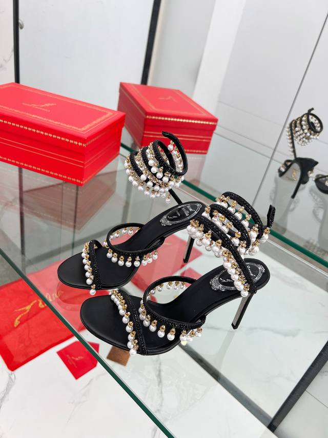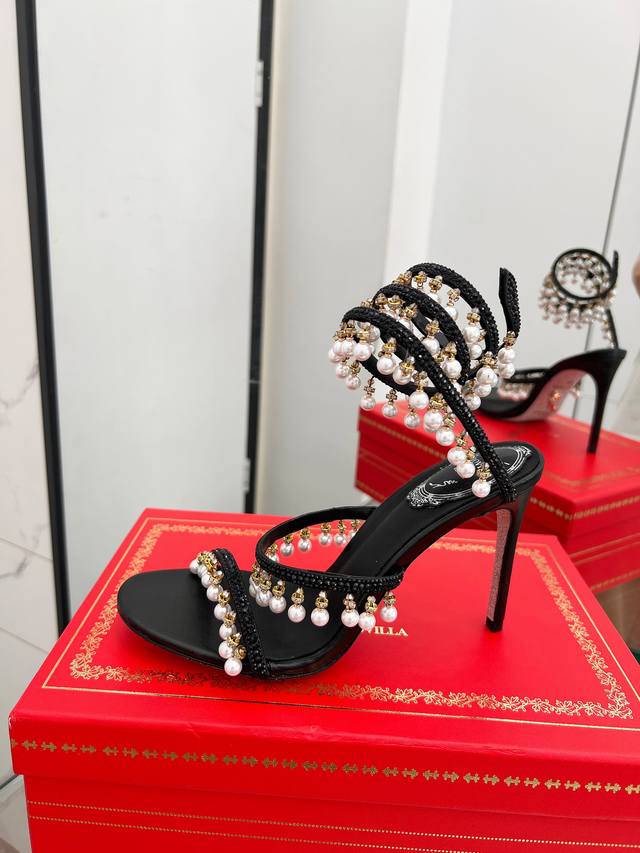 Latest Rene Caovilla Rc high-end version Spring/Summer hot-selling series, alluring and glamorous top-tier quality, Cleo crystal pearl lampshade sandals, a heavyweight flagship item of the year! Crystal pearl strappy high heels DDD Globally sold-out sandals with hand-stitched pearl pendants and rhinestone straps! Celebrity style, showcased by platform anchors and influencers, fashionable and elegant. Thousands of rhinestones and pearls are neatly arranged together, encircling the ankle, exuding sexy and alluring femininity. Custom-made from the original boutique design, extremely heavy-duty workmanship, using imported machines and meticulous handcrafting to create a three-dimensional arched rhinestone strap for perfect quality. The goal is to ensure that every girl who owns this item retains the most beautiful romantic memories, radiating ethereal beauty. Classic, noble, and elegant. Material: Original custom-grade silk + Clio crystal pearl rhinestones. Lining: Imported sheepskin lining and insole. Outsole: Original Blingbling shimmering silver gold-label genuine leather sole. Heel height: 9.5cm. Color: Black, white, champagne. Size: 35-39, 34, 40, 41, 42, 43 (custom orders are non-refundable and non-exchangeable, standard size). Packaging: Comes with a cloth bag, card, and spare rhinestones.
