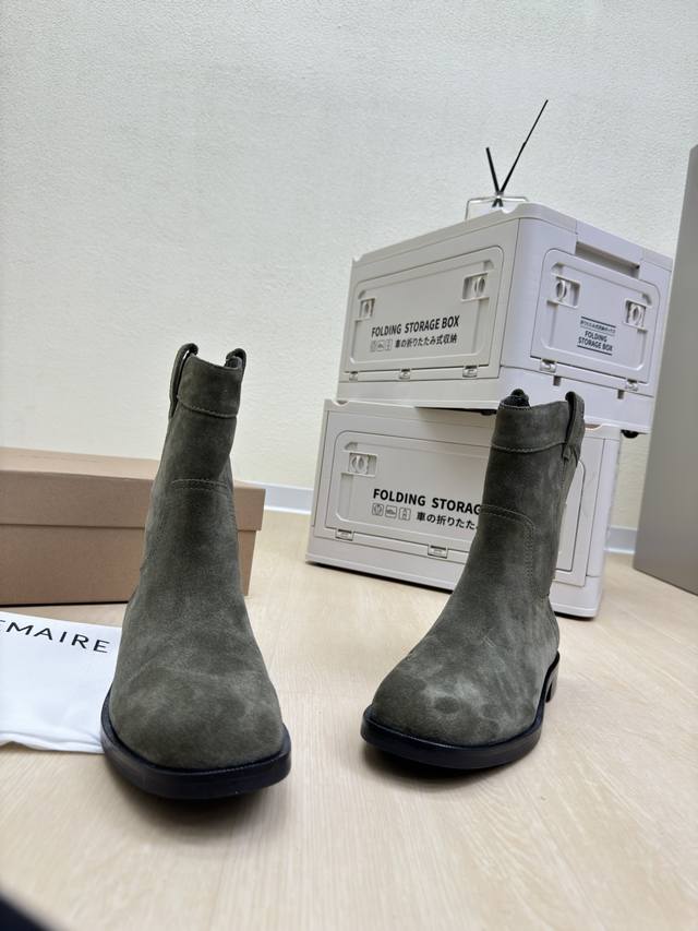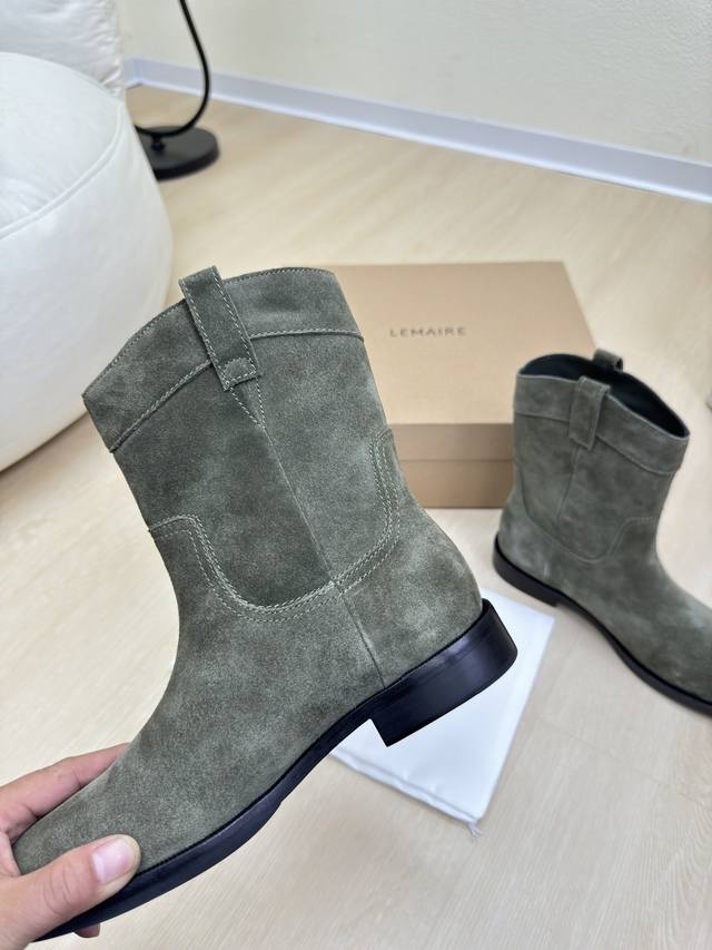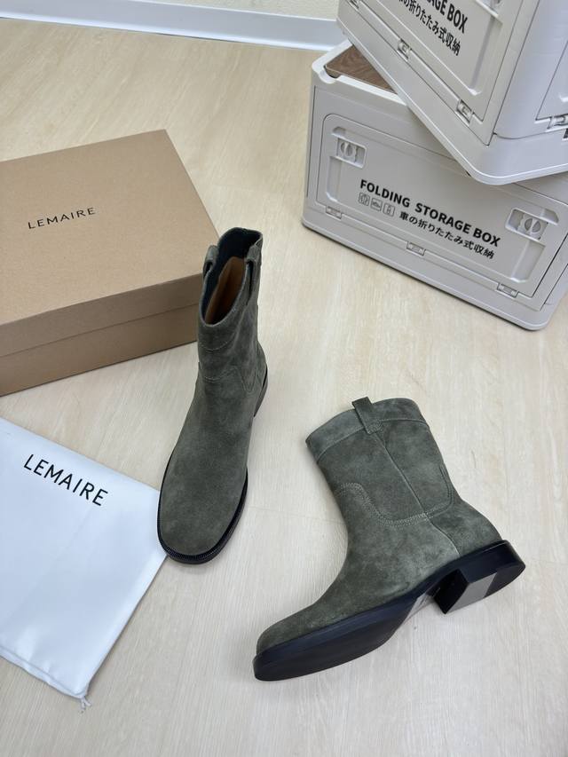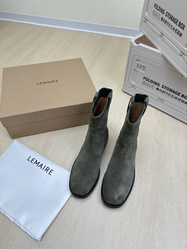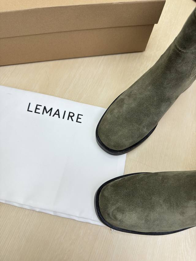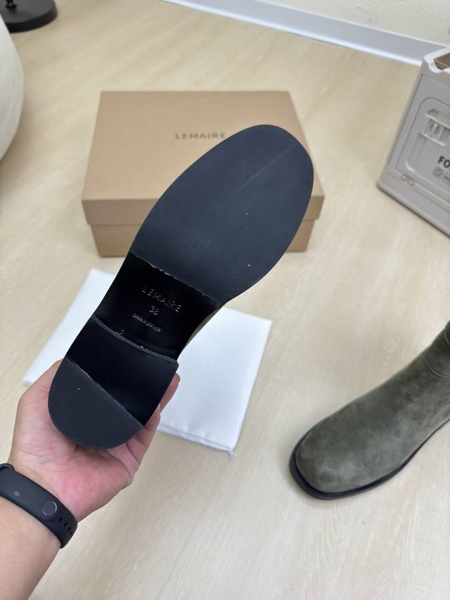 Lemaire riding boots, women's shoes from the Parisian designer brand. Made of top-grain suede cowhide leather with a high-end heel. Deep green color. Features a non-slip outsole design that visually divides the shoe into sections, creating a subtly alluring look. The addition of elastic elements injects more rebellious energy and strength into the refined shoe, showcasing a slender yet undeniably strong silhouette. Original genuine leather outsole. Sizes: 34 35 36 37 38 39 40 41. Customized sizes available. Comes with original packaging.