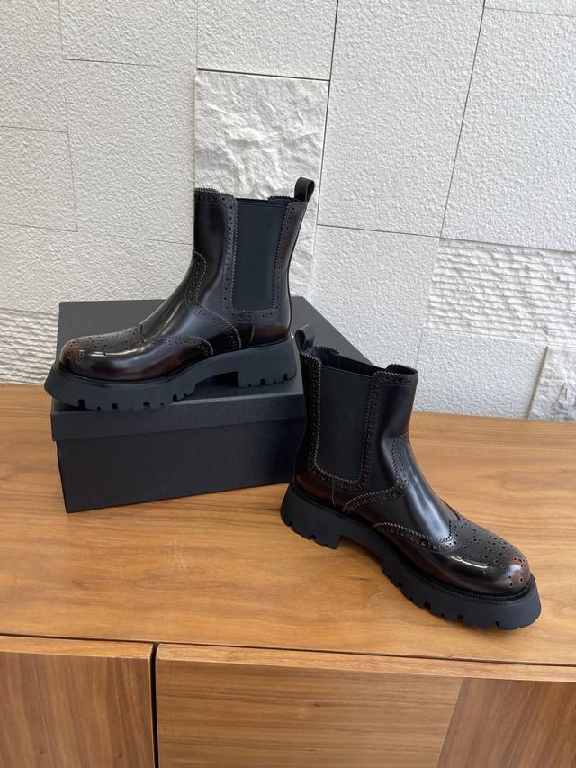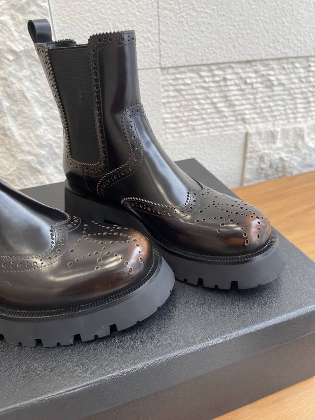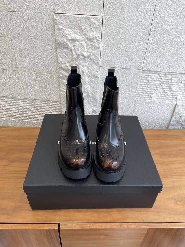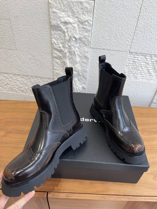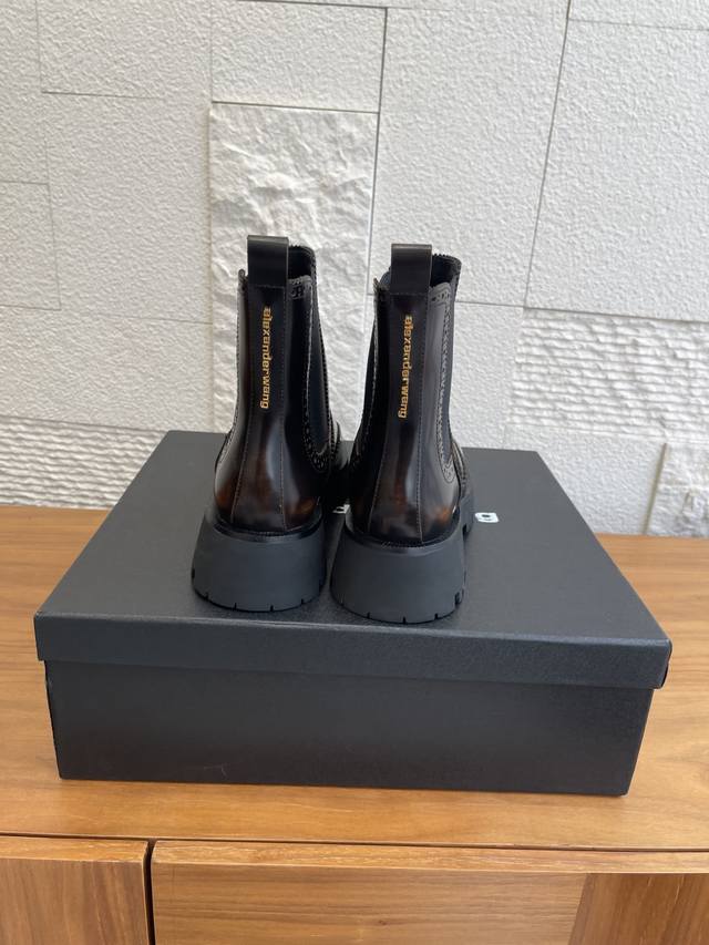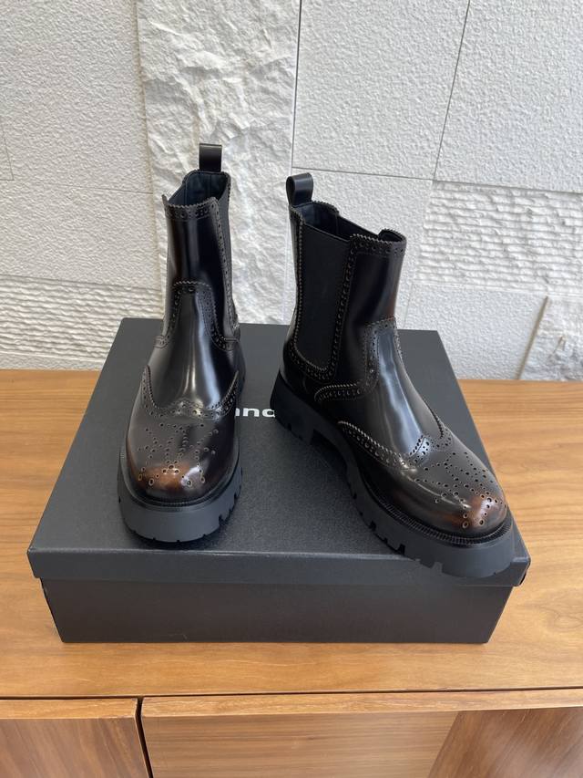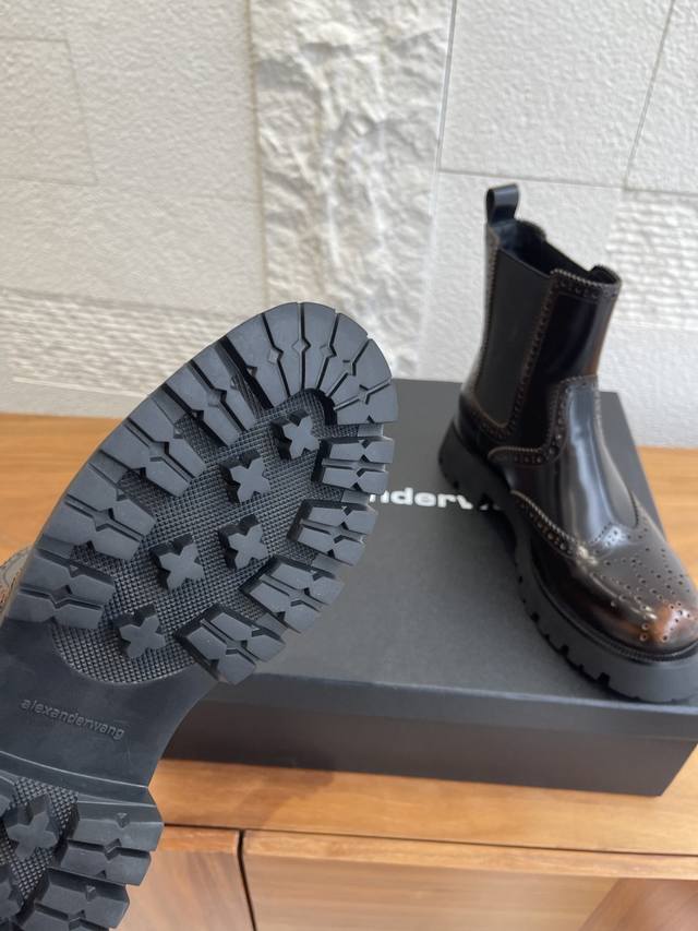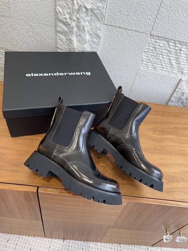 Level Version: Alexander Wang 25Ss Autumn/Winter New Retro Brogue Thick-Soled Chelsea Boots DDD These boots effortlessly combine a cool, androgynous vibe with a sophisticated style. The glossy leather has a built-in "reflector" effect, shimmering with a high-end sheen in the light. The elastic side straps fit snugly around the ankle, flattering all foot shapes for a sleek and effortless look. DDD From biker jackets to sweet and spicy skirts, from Cityboy hoodies to minimalist suits, these boots are a style-mixing "cheat code," and a key to creating a stylish atmosphere in your autumn/winter wardrobe. When you want to stand out from the crowd, slip them on and instantly become the coolest fashionista on the street. DDD Fabric: Original custom-made distressed edge beads DDD Lining: Imported silk sheepskin lining DDD Outsole: Original molded rubber foam outsole DDD Size: 35-40 40 is custom-made and non-refundable DDD