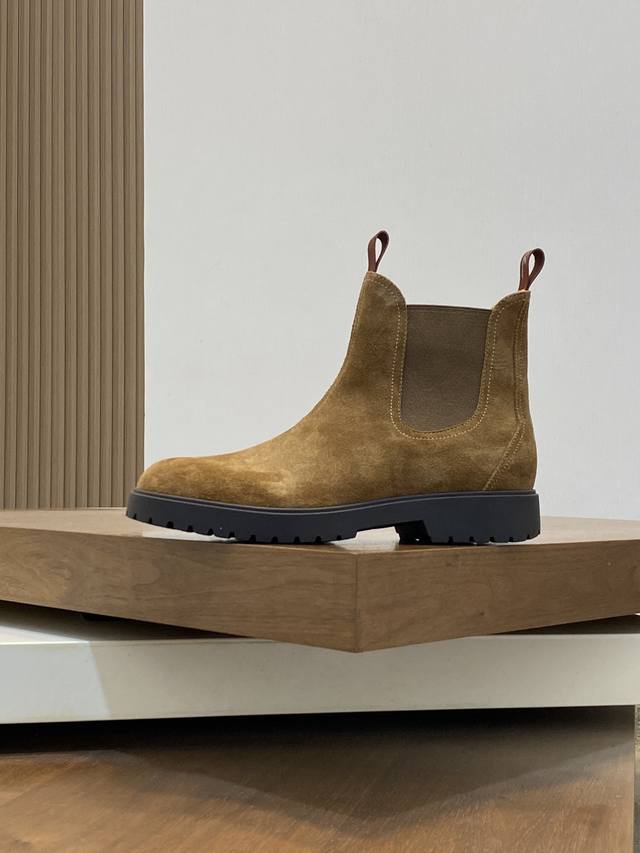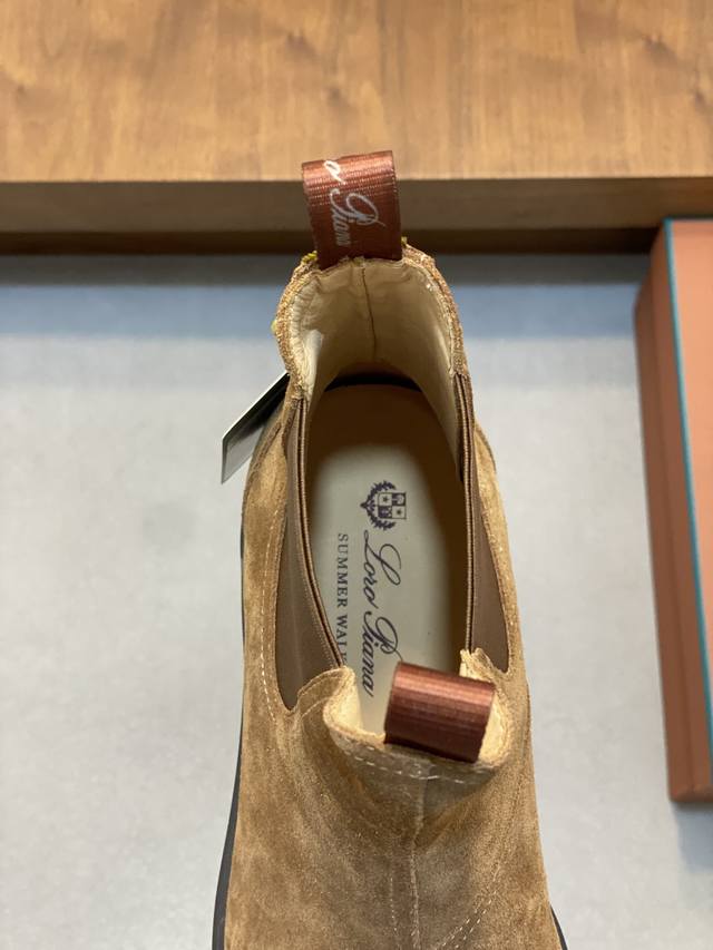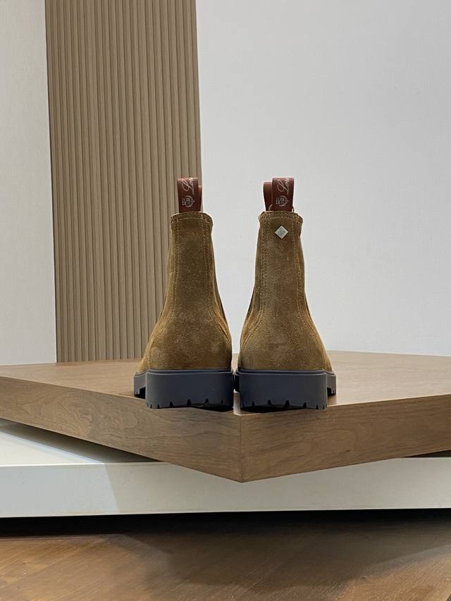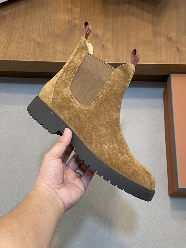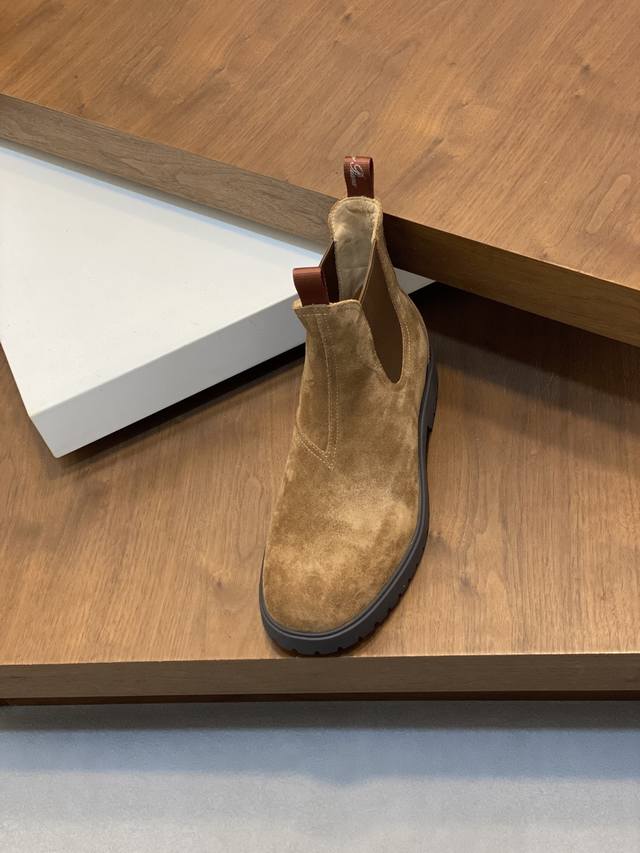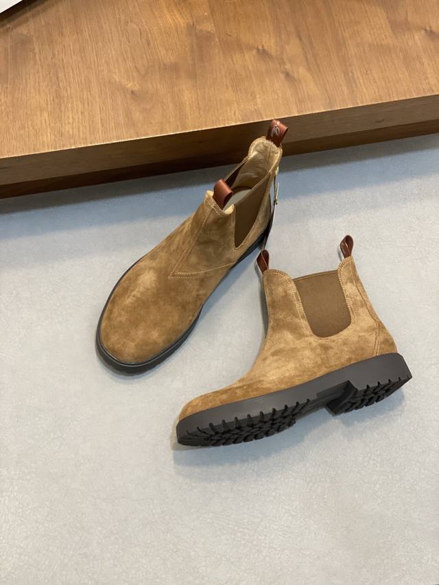 Loro Piana Autumn/Winter New Men's Suede Leather Chelsea Ankle Boots! Made with premium raw materials from Dongguan! These ankle boots are crafted from soft suede tumbled cowhide leather, featuring elastic fabric on both sides of the shaft and a webbing pull tab at the heel for easy on and off. The delicate texture of the suede complements the iconic silhouette. The slightly rounded toe, combined with a genuine leather and lightweight rubber sole, and a full-grain leather lining, ensures comfortable wear, prevents stuffiness, colorfastness, and slip resistance. Clean and glue-free. Superb quality, visible luxury! Comes with a folding outer box and a shoe storage bag! Sizes: 39-40-41-42-43-44, 45 (custom sizes available).