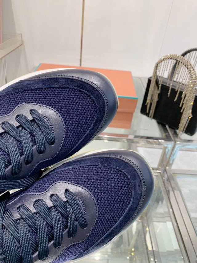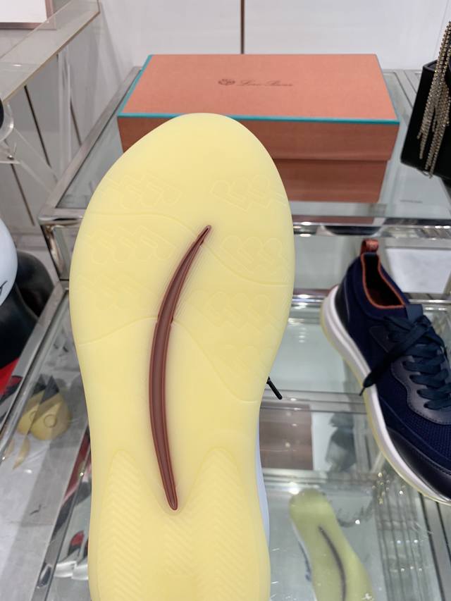 Loro Piana Flexy Walk Men's Sneakers. These sneakers feature a lightweight and comfortable upper crafted from Wish knit wool using a specialized process, perfect for casual wear. The upper is made from select imported wool, knitted like a sweater on a loom, and then paired with a lightweight sole. Features include a ribbed elasticated collar with Kummel trim, a white outsole with a Kummel sole featuring a repeating Loro Piana initials pattern, a Kummel pull tab with the Loro Piana logo, tonal cowhide leather details, and a Naba cowhide leather insole. Sizes: 39-45.
