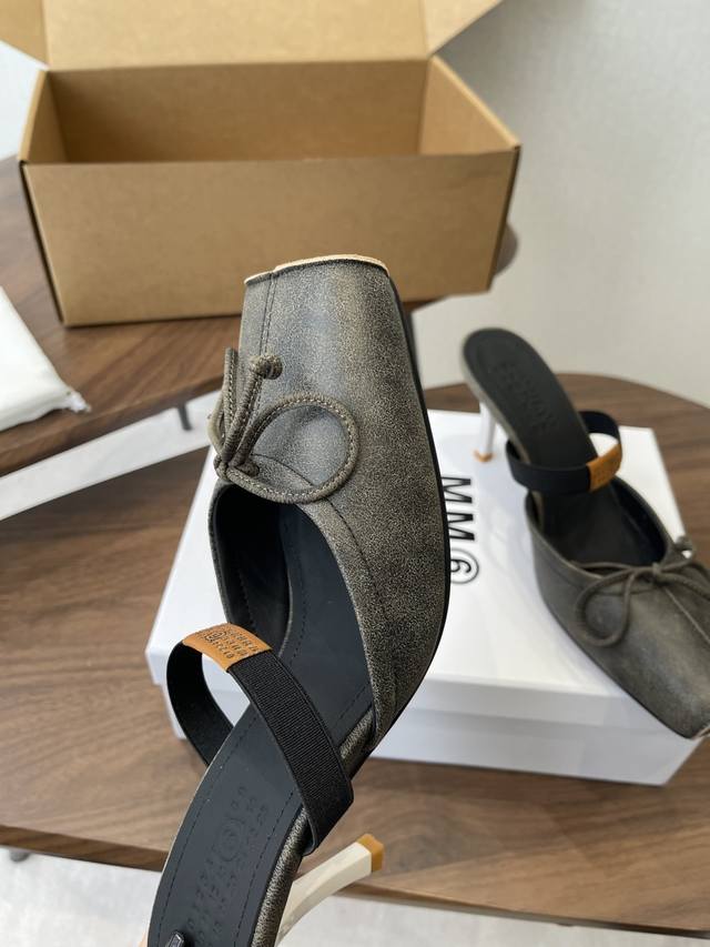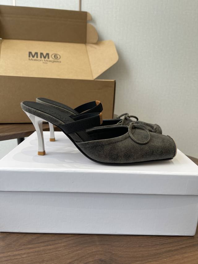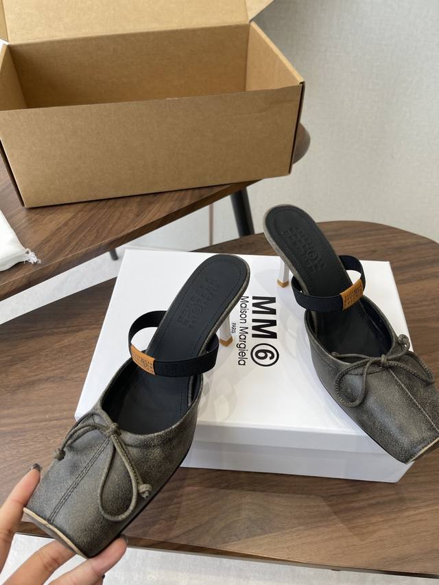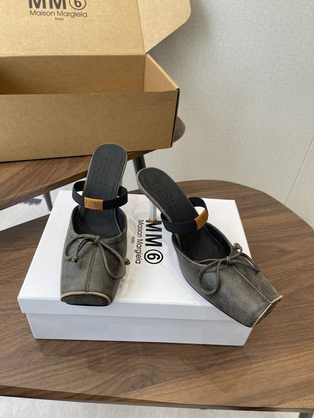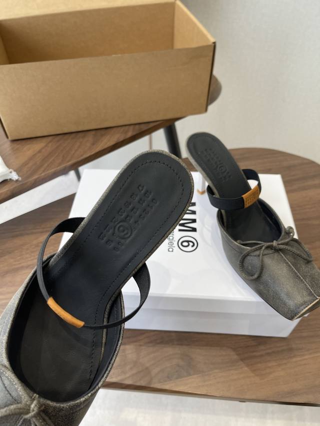 Maison Margiel Square-Toe Elastic Band Ballet Flat Sandals DDD Featuring the brand's signature sculpted silhouette that conforms to the foot, the upper is soft and flowing, balancing comfort and design. A fusion of square toe and ballet elements: the classic square toe design is given a modern twist, complemented by a bow embellishment on the upper, reconstructing the elegant silhouette of the ballet flat. The open-back mule design combines casualness and sophistication. DDD The heel features the signature white single-stitch stitching, and the elastic band on the upper bears the Mm6 logo, key to brand recognition. The open-back mule structure simplifies on and off, combining the grace of ballet flats with the casualness of mules. DDD Upper: Vintage cracked leather Ddd Lining: Silk sheepskin lining Ddd Outsole: Genuine leather outsole Ddd Heel lift: 7cm Ddd Size: 35-41 Sizes 40 and 41 are custom-made and non-refundable DDD