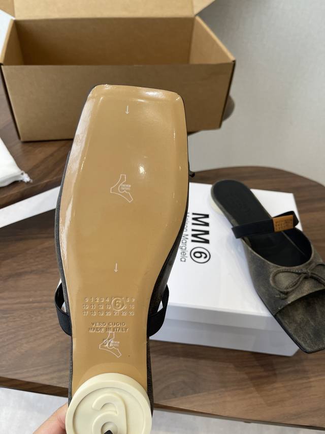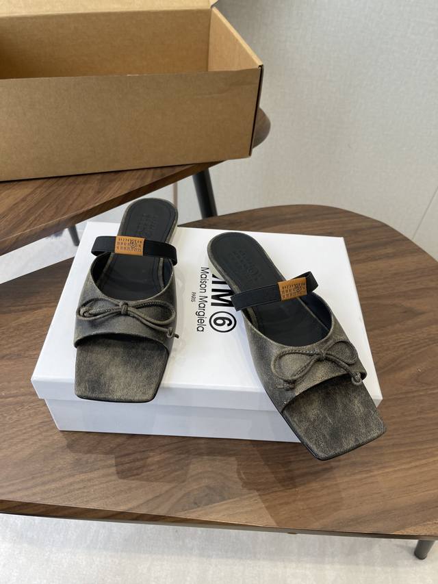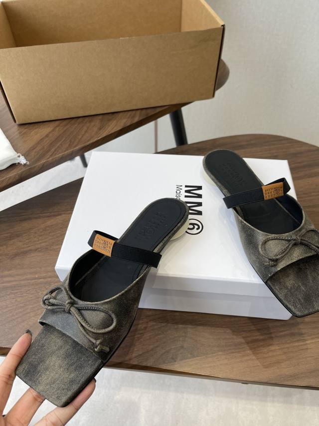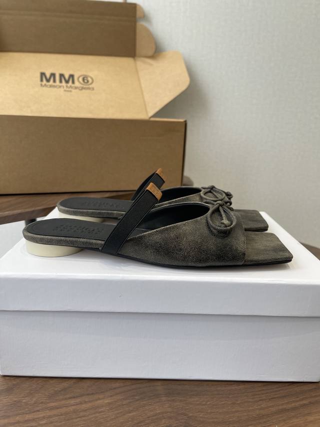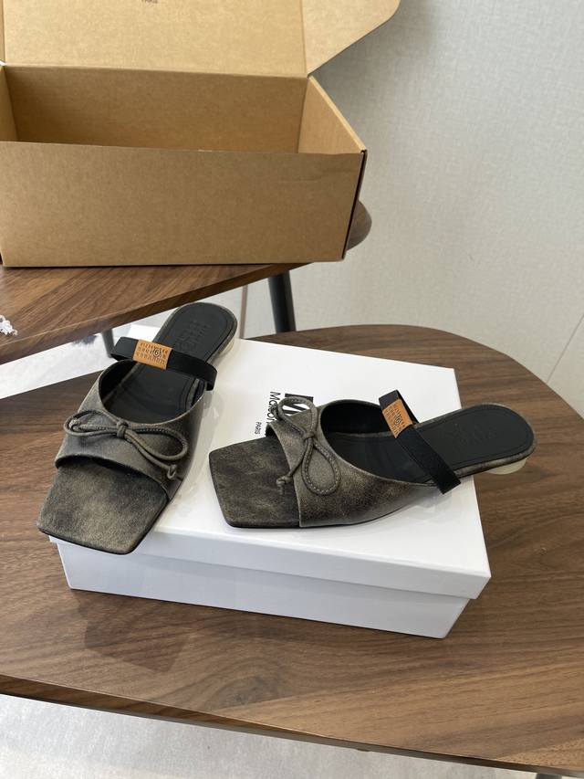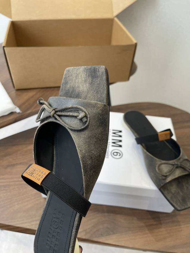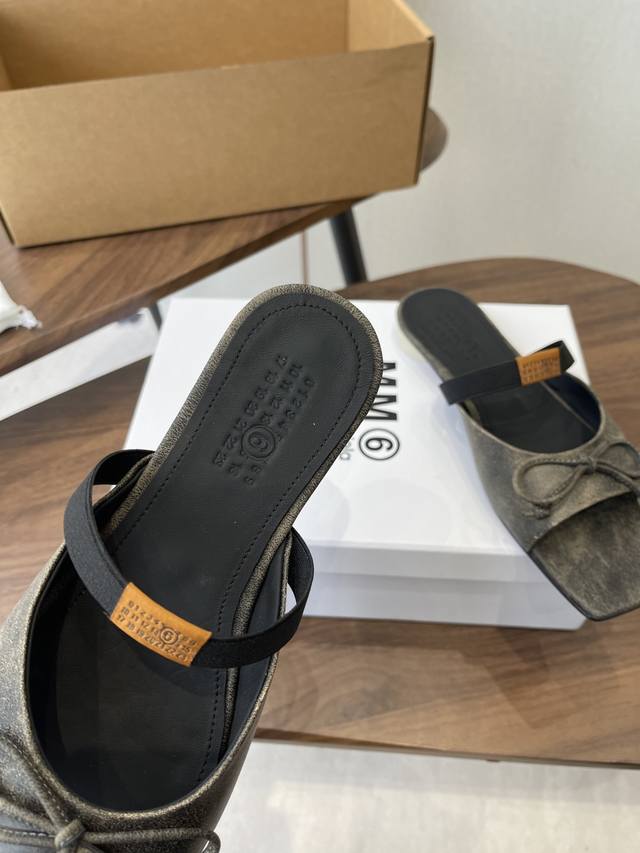 Maison Margiel Square-Toe Elastic Band Ballet Flat Sandals DDD Featuring the brand's signature sculpted silhouette that conforms to the foot, the upper is soft and flowing, balancing comfort and design. A fusion of square toe and ballet elements: the classic square toe design is given a modern twist, complemented by a bow embellishment on the upper, reconstructing the elegant silhouette of the ballet flat while incorporating a mule-like open-back style, combining casualness and sophistication. DDD The heel features the signature white single-stitch stitching, and the elastic band on the upper bears the Mm6 logo, key to brand recognition. The open-back mule structure simplifies on and off, combining the grace of ballet flats with the casualness of mules. DDD Upper: Vintage crackled leather Ddd Lining: Silk sheepskin lining Ddd Outsole: Genuine leather outsole Ddd Heel lift: 2.5cm Ddd Size: 35-41 Sizes 40 and 41 are custom-made and non-refundable DDD