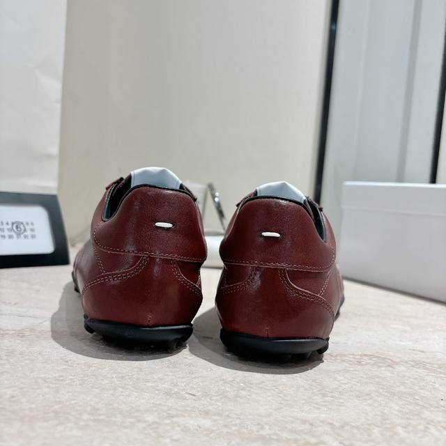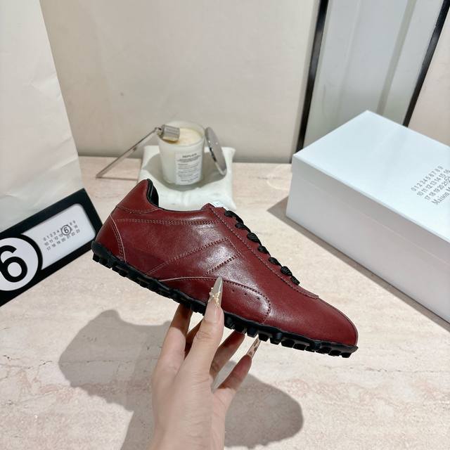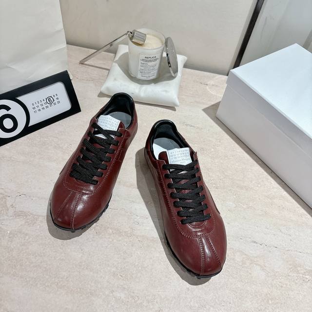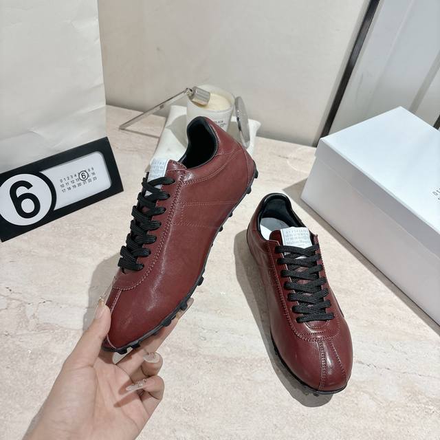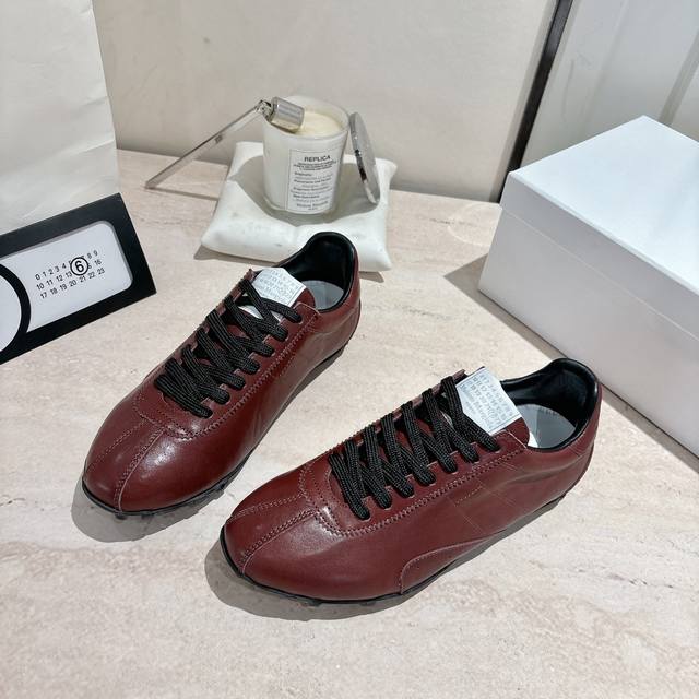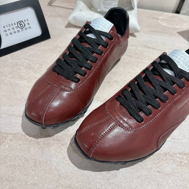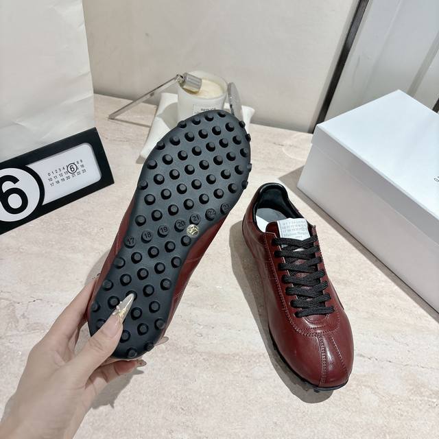 Maison Margiela 2025 Fall/Winter Collection Couple Sprinters (Training Shoes) The new Sprinters sneakers are crafted from distressed, plant-blend leather, inspired by retro running shoes. Through distressing, stitching, and patchwork techniques, the shoes are given new life and beauty. The tongue features the classic number logo, paired with a non-slip studded sole, and the heel is adorned with the iconic white stitched logo, exuding a sense of craftsmanship. Material: Leather Original Rubber Outsole Sizes: 35-39, 40-44 (Women's 40, Men's 45, custom-made) Comes with original packaging.