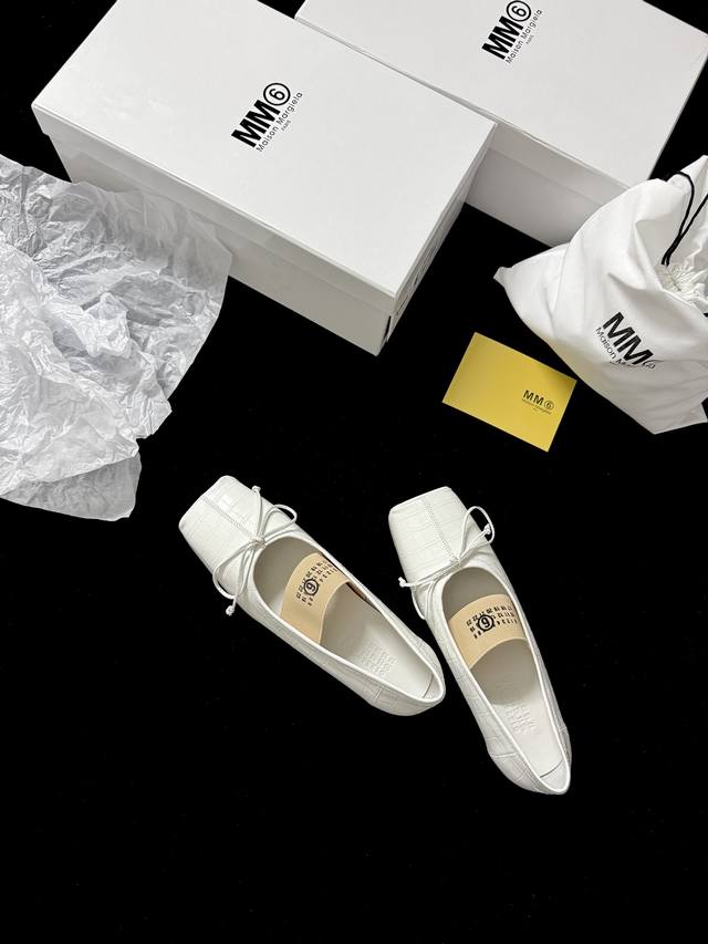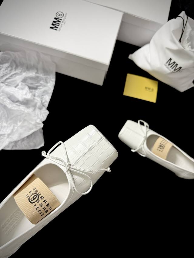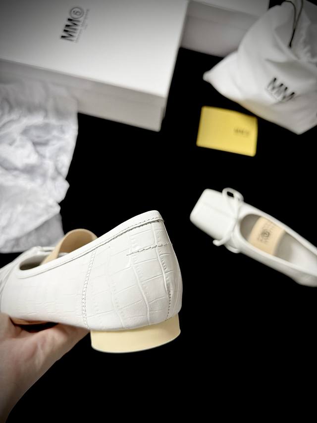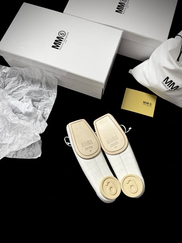 's square toe is cut with sharp corners, and the straps sway gently, exuding a French lazy vibe. Crocodile embossing subtly hides a cutting-edge texture. The milky white hue maximizes the sense of clarity and sophistication.