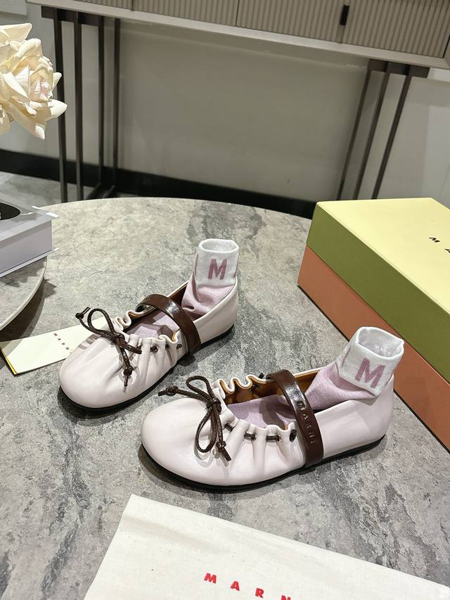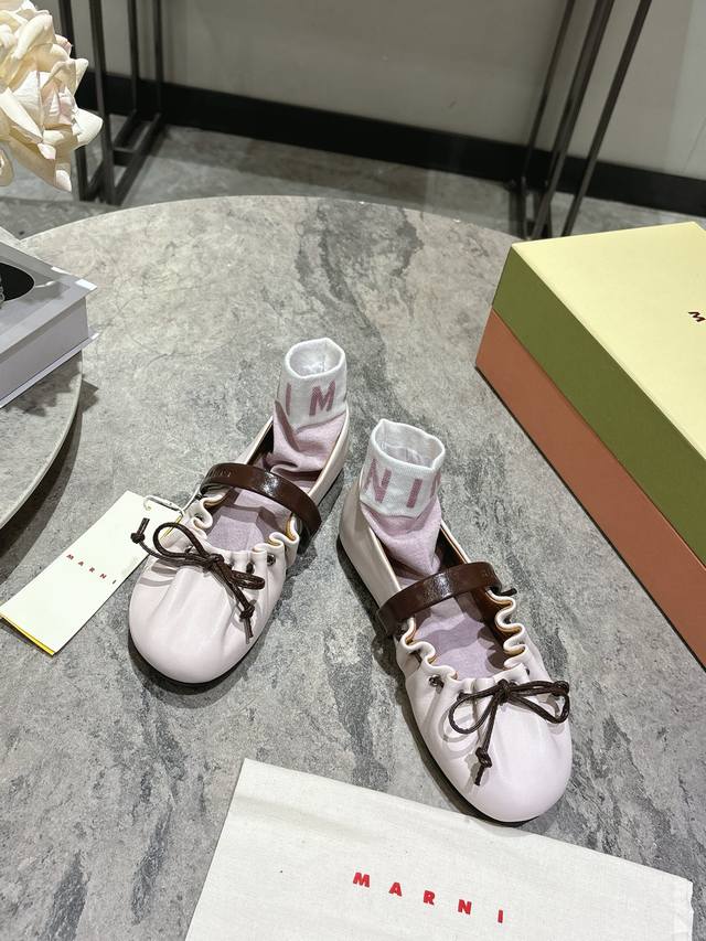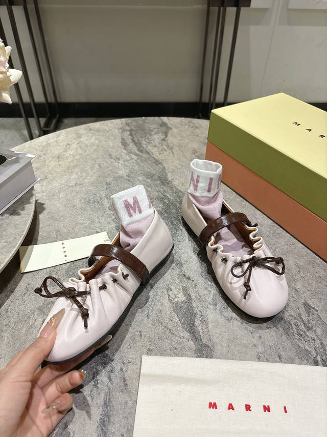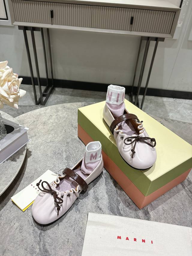 Marni 2026 Spring/Summer New Bow Ballet Flats, made of soft lambskin, with a highly recognizable color-blocked design. Sizes: 35-39, 40 custom-made. Comes with socks.