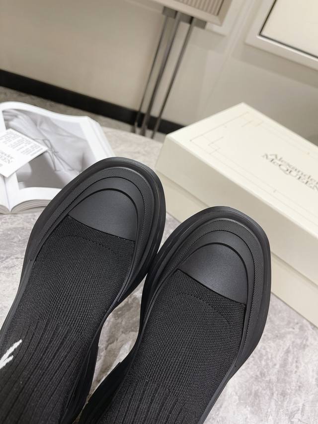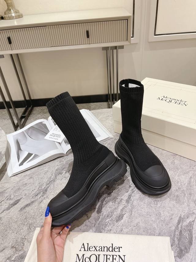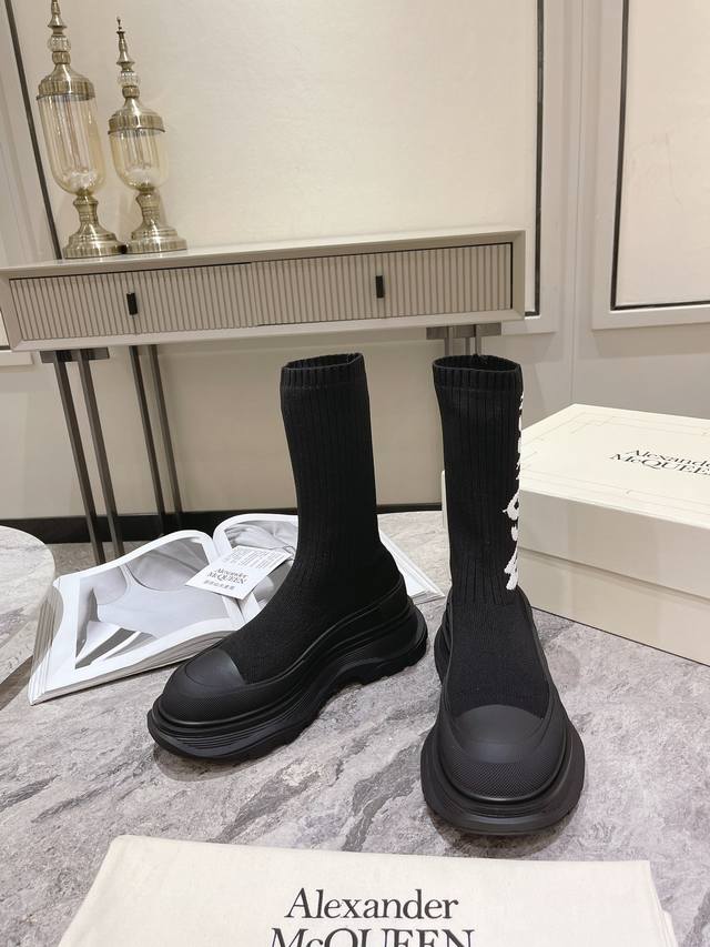 McQueen Graffiti Knit Tread Slick Boots, new fall models. These boots have a unique, personalized design that enhances height and slims the legs. They're a stylish addition. #McQueen Graffiti Knit Tread Slick Boots feature a ribbed knit sock-like upper with an original TPU outsole and embroidered Alexander McQueen logo. Available in sizes 35-40 for women.
