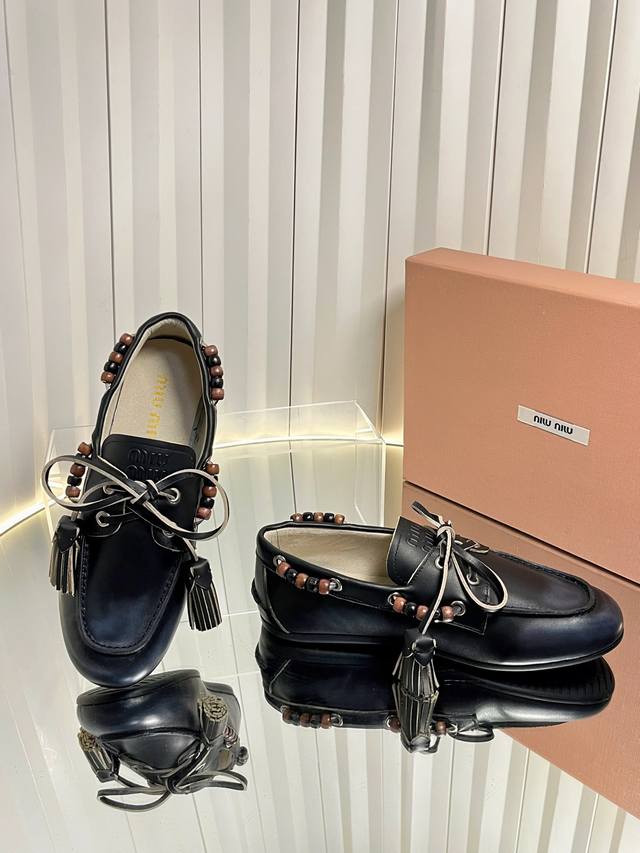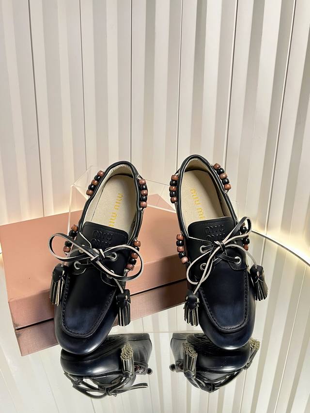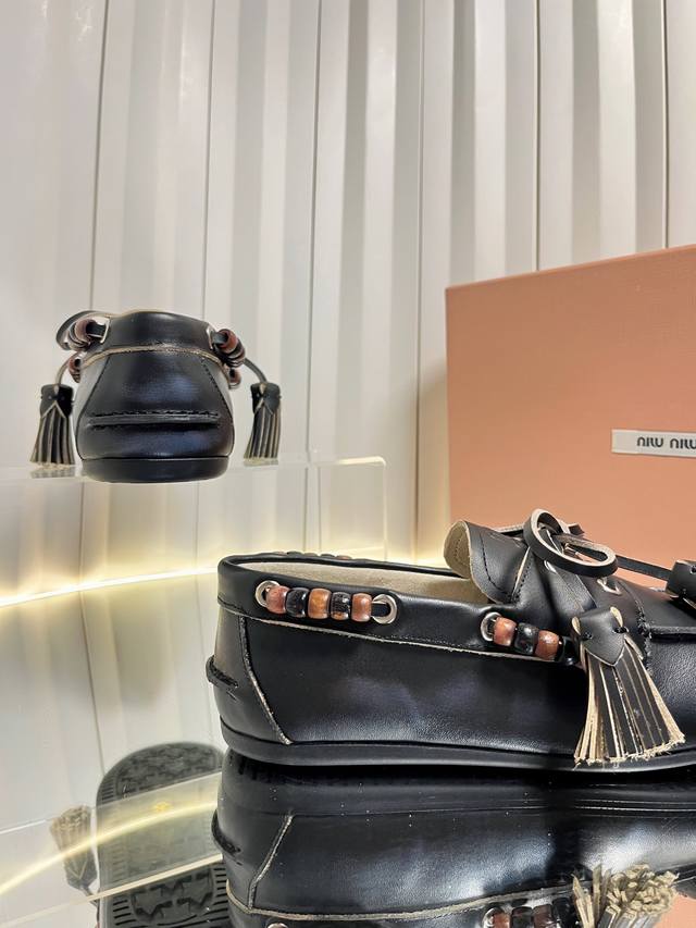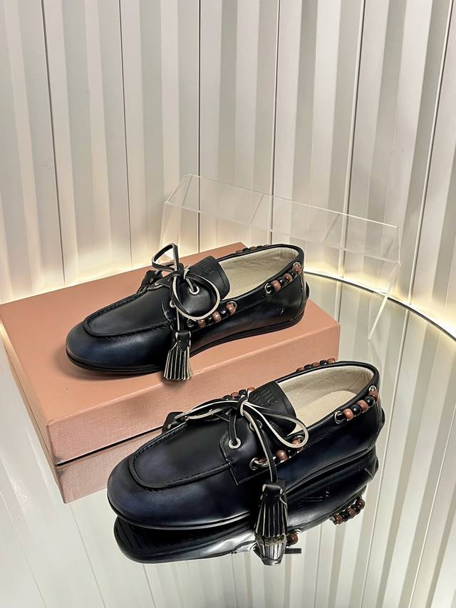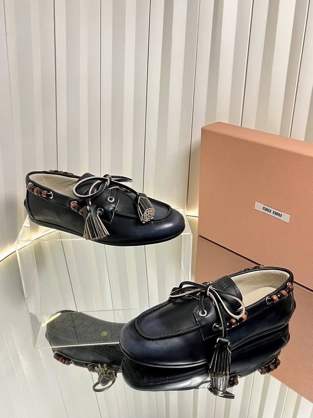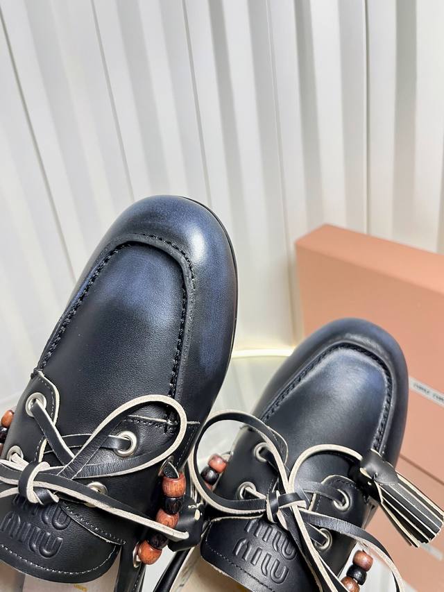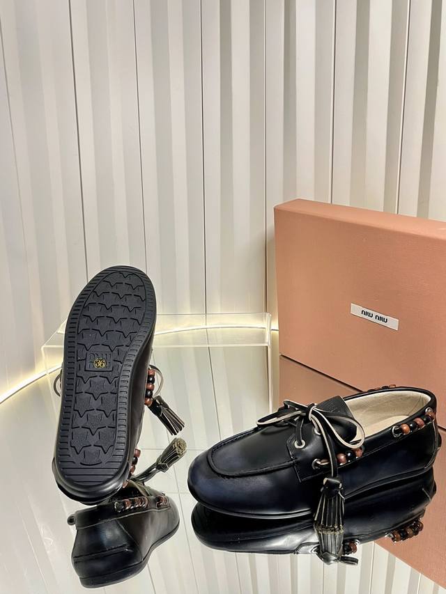 Miu Mi* 25Fw Deck Shoes Miu Miu's new Deck Shoes are so stylish! They perfectly capture the autumn/winter vibe, offering both comfort and fashion. These new autumn/winter suede slip-on shoes feature playful lace-up tassels, a retro color scheme, and a brushed inner lining for an enhanced wearing experience. Material: Calfskin suede Lining: Double-sided fleece Outsole: Rubber Size: 35-41 Sizes 40 and 41 are custom-made and non-refundable.