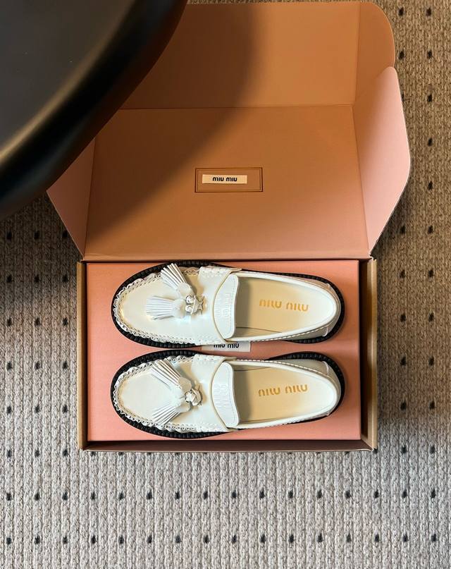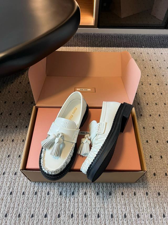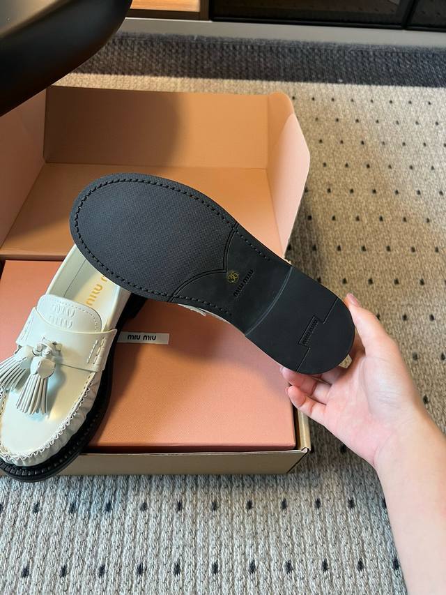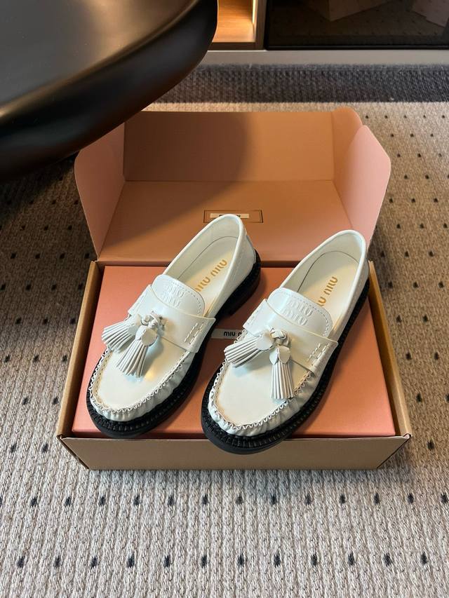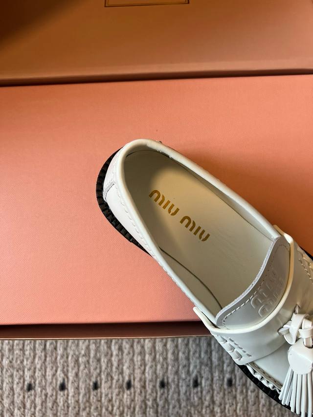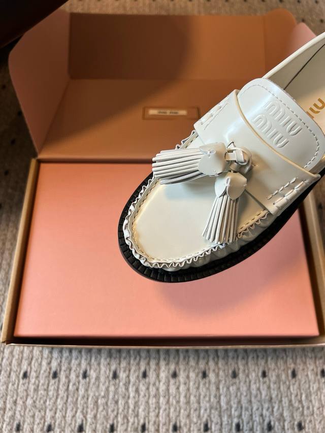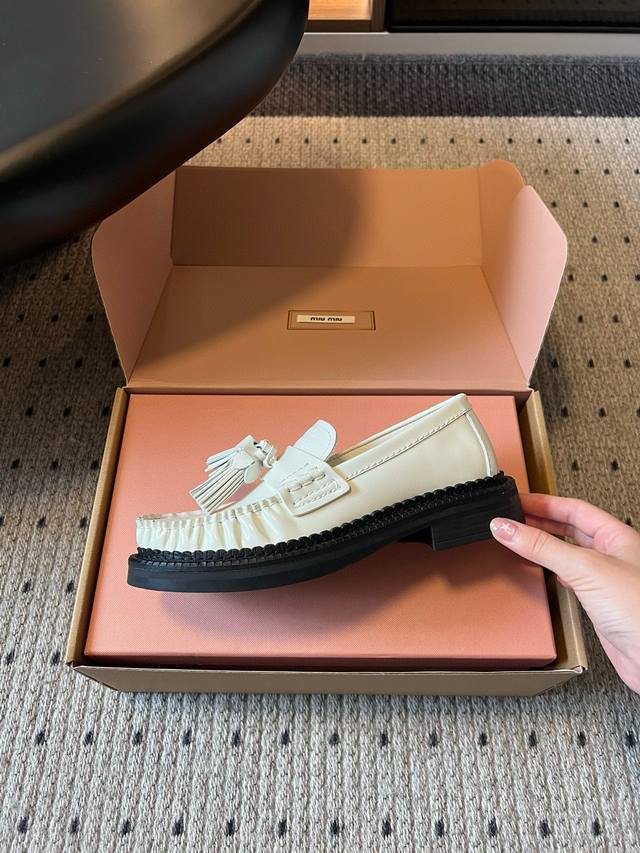 Miu Mi* 25Fw Deck Shoes New Tassel Loafers DDD Blending retro and modern styles, the classic loafer silhouette is adorned with tassel embellishments, adding a lively and playful touch; the platform design also brings a hint of retro British style, while enhancing the overall look. Made of high-quality leather, the shoes have a delicate texture and excellent luster. The stitching is exquisite, and the tassel details are meticulously crafted, showcasing the brand's refined workmanship. DDD Pair them with a pleated skirt and a white shirt, topped with a knitted cardigan, to create a fresh and youthful campus style. The tassel elements on the shoes complement the lively feel of the preppy look perfectly. DDD Upper: Cowhide DDD Lining: Cowhide DDD Outsole: Original mold outsole DDD Sizes: 35 40 40 (Custom sizes are non-refundable and non-exchangeable) DDD